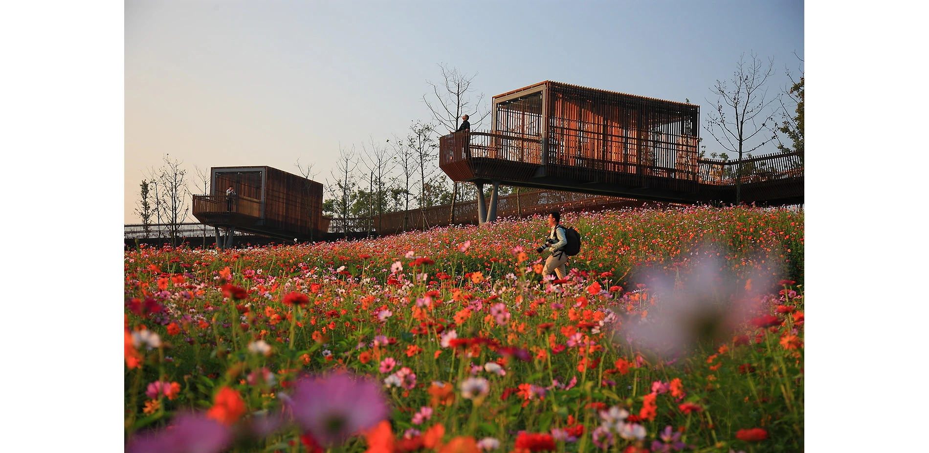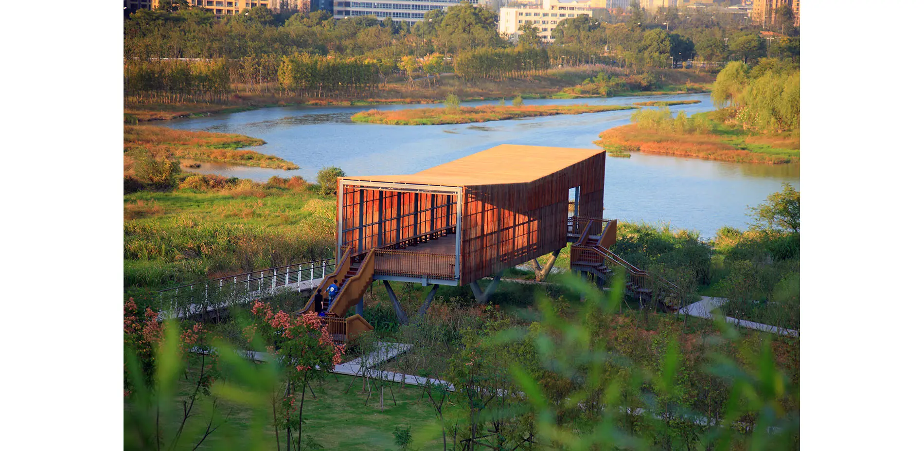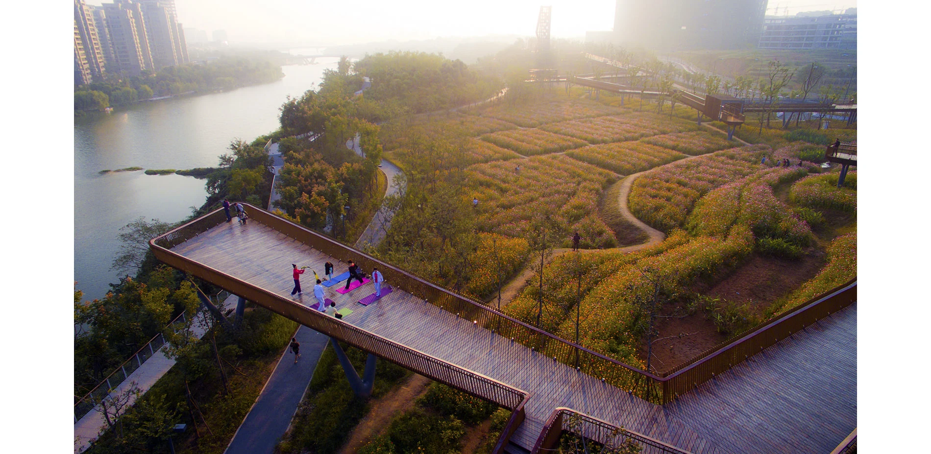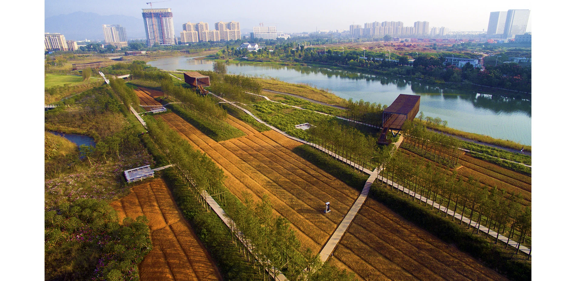 The park has been very successful as a place for local residents to relax and recreate. It has become a dynamic urban oasis with celebrations and many kinds of events–like the spontaneous gatherings spawned by social media for locals who follow the seasonal blooming of flowers. These events encourage residents to be aware of the changes of seasons that are often obscured by the hustle of urban life. This connection to nature can refresh the memories of a once rural population (80% of the urban residents, as with the general Chinese urban population, were farmers two or three decades ago). On a fine day, one can be easily moved by scenes throughout the park: kids of various ages jumping and yelling in excitement in one of the pavilions floating above the lush vegetation, young people hugging and falling in love in a fields of flowers, newlyweds having their wedding photographs taken with the productive farmland in the background, couples caring for their babies in strollers above the boardwalk, and elderly couples walking arm-in-arm and resting on the platforms overlooking the new city. As the terrain slopes up from the river, the landscape is quilted with productive and fecund vegetation. Offering respite from the dense urban surroundings, these verdant tableaus are framed by an experiential network of boardwalks and structures that look out onto the memories of the past and hopes and dreams for the future. -
