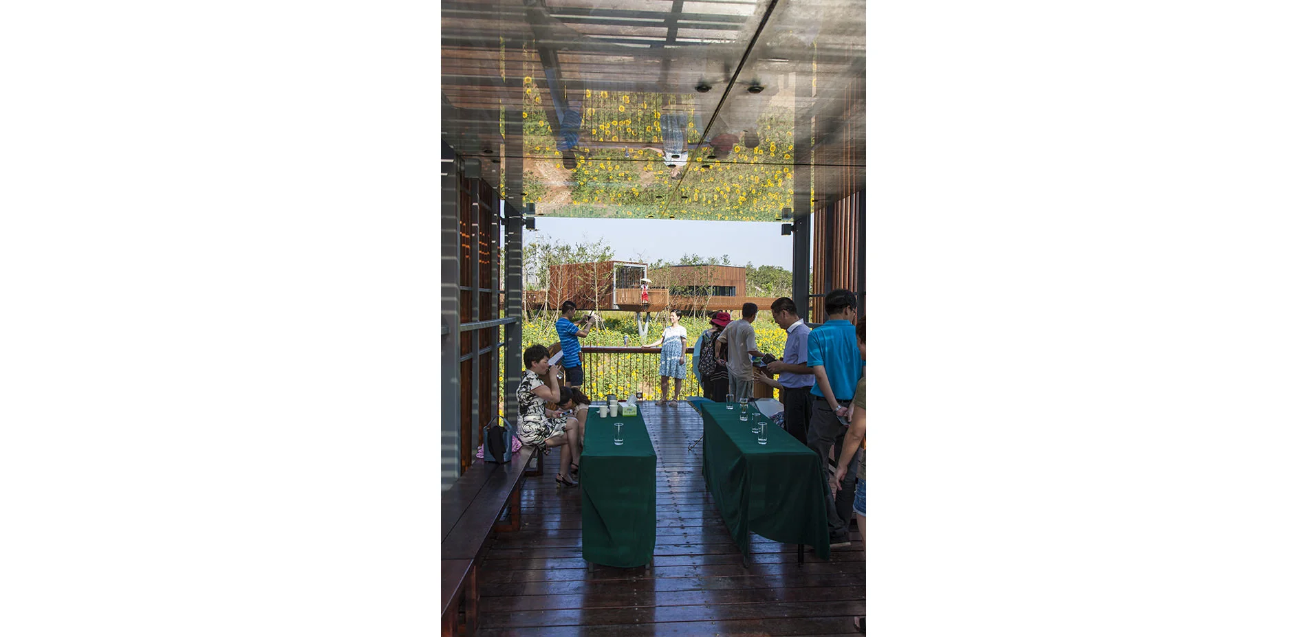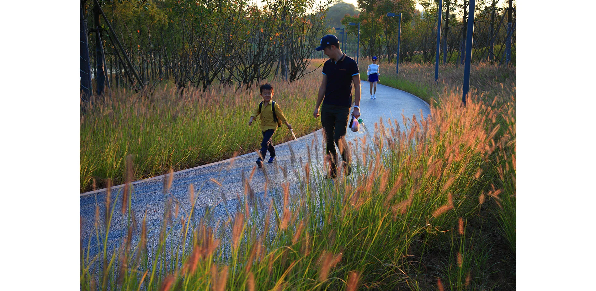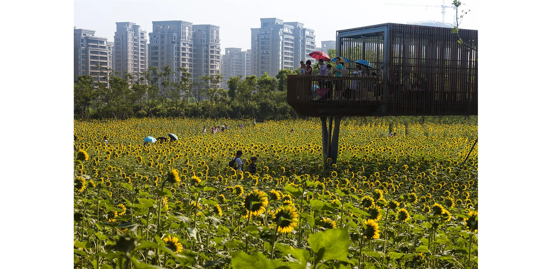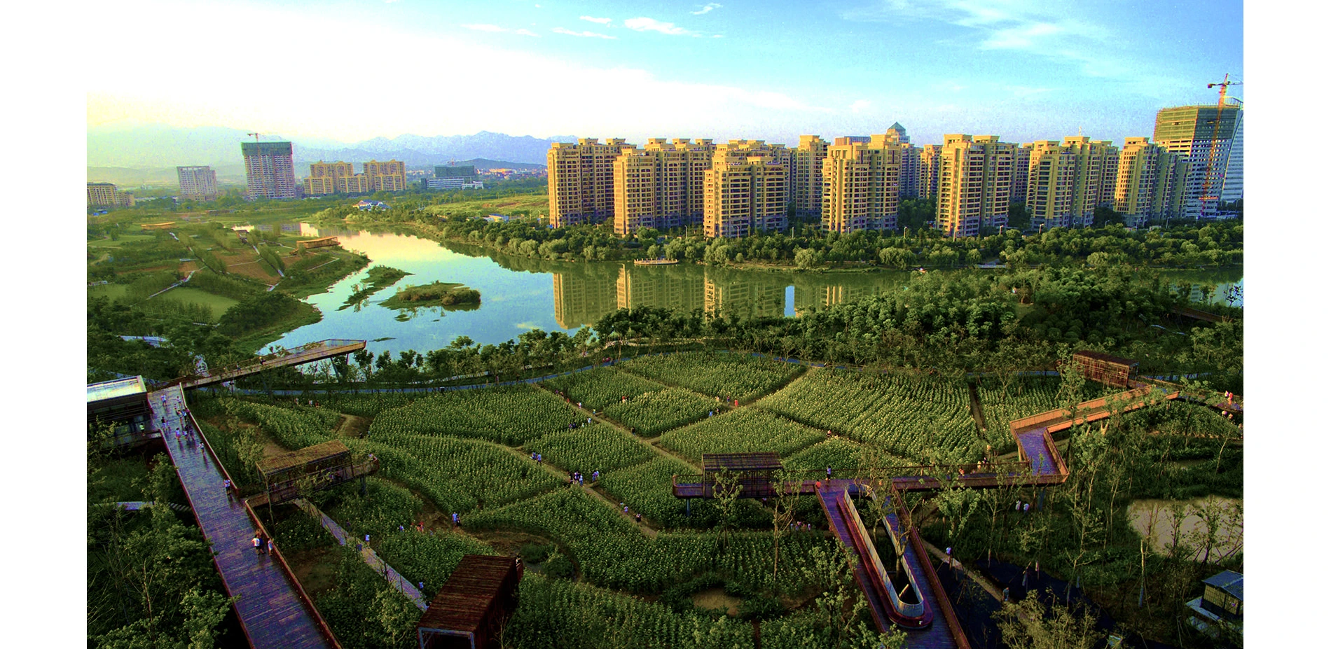 The park has been very successful as a place for local residents to relax and recreate. It has become a dynamic urban oasis with celebrations and many kinds of events–like the spontaneous gatherings spawned by social media for locals who follow the seasonal blooming of flowers. These events encourage residents to be aware of the changes of seasons that are often obscured by the hustle of urban life. This connection to nature can refresh the memories of a once rural population (80% of the urban residents, as with the general Chinese urban population, were farmers two or three decades ago). On a fine day, one can be easily moved by scenes throughout the park: kids of various ages jumping and yelling in excitement in one of the pavilions floating above the lush vegetation, young people hugging and falling in love in a fields of flowers, newlyweds having their wedding photographs taken with the productive farmland in the background, couples caring for their babies in strollers above the boardwalk, and elderly couples walking arm-in-arm and resting on the platforms overlooking the new city. As the terrain slopes up from the river, the landscape is quilted with productive and fecund vegetation. Offering respite from the dense urban surroundings, these verdant tableaus are framed by an experiential network of boardwalks and structures that look out onto the memories of the past and hopes and dreams for the future. -