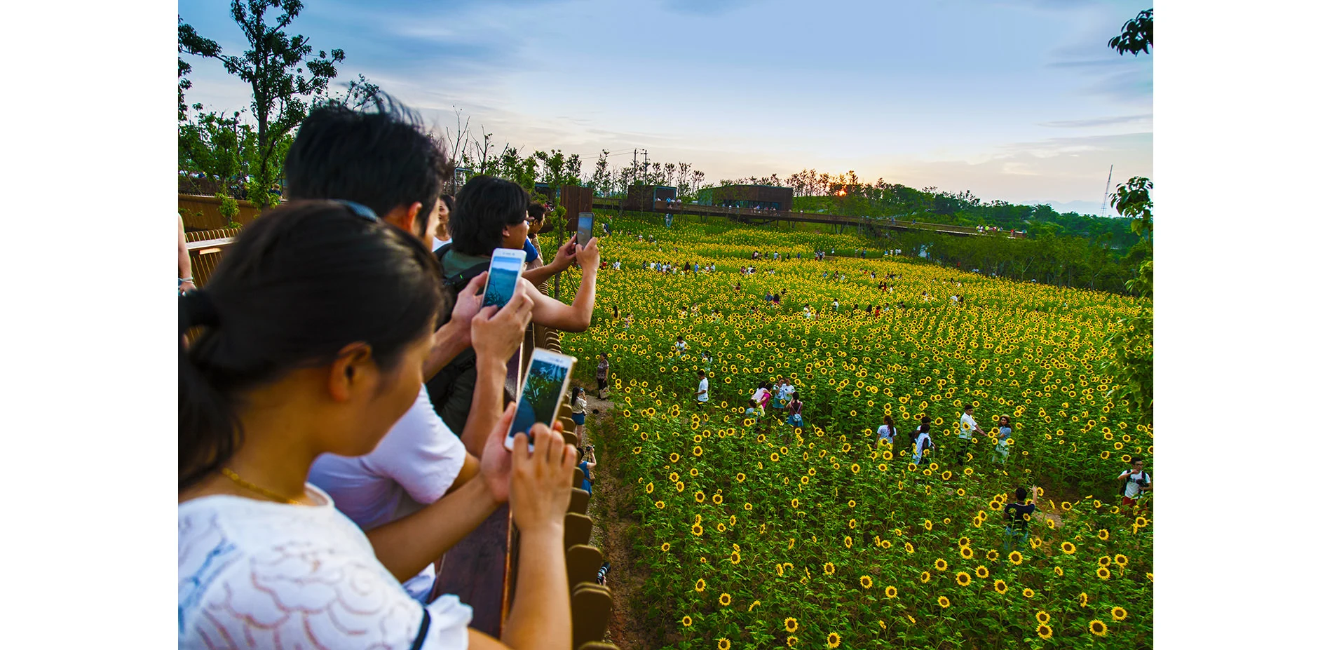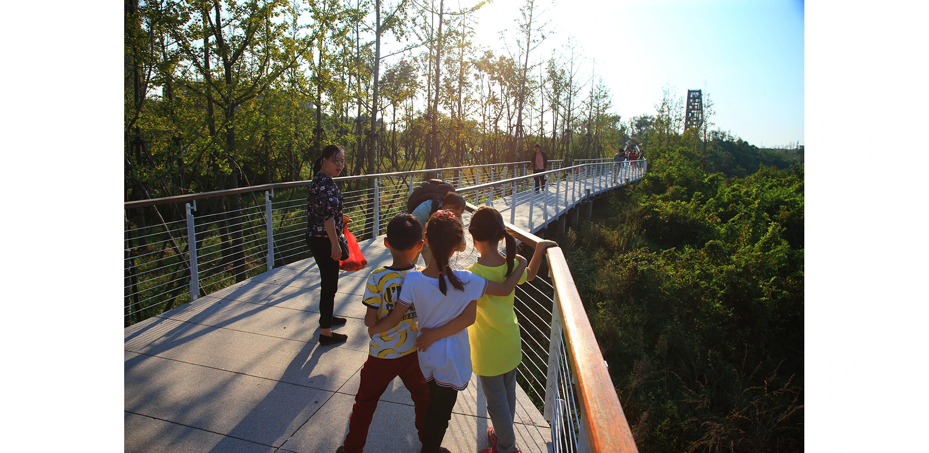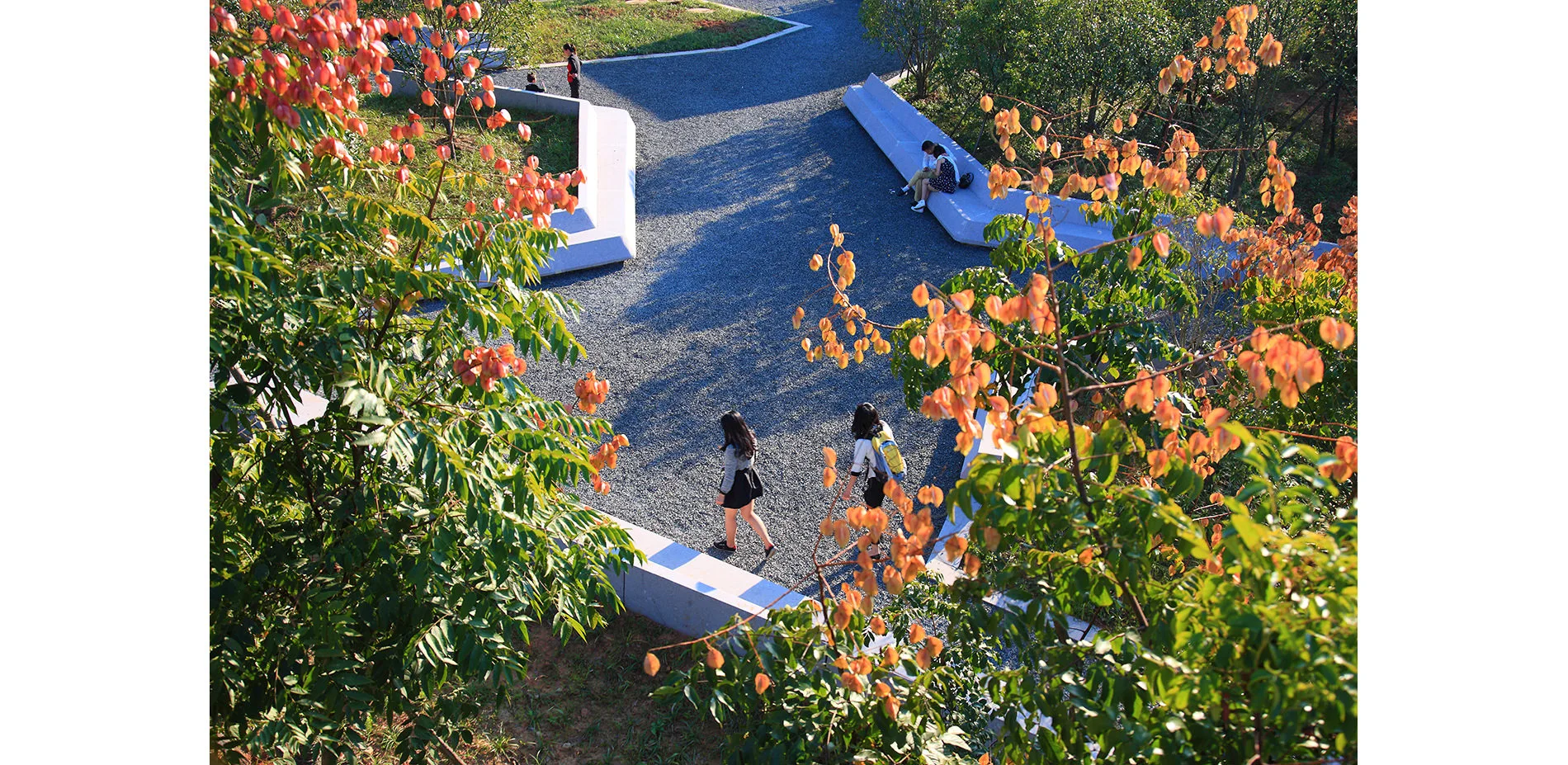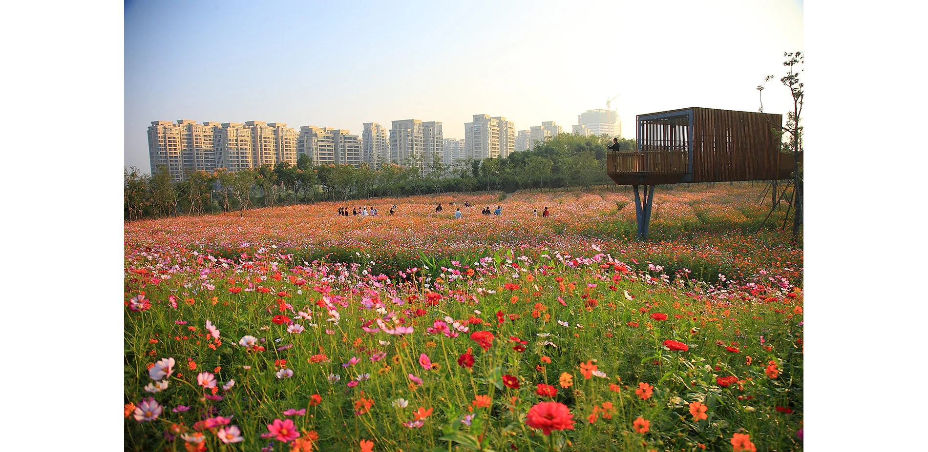 The park has been very successful as a place for local residents to relax and recreate. It has become a dynamic urban oasis with celebrations and many kinds of events–like the spontaneous gatherings spawned by social media for locals who follow the seasonal blooming of flowers. These events encourage residents to be aware of the changes of seasons that are often obscured by the hustle of urban life. This connection to nature can refresh the memories of a once rural population (80% of the urban residents, as with the general Chinese urban population, were farmers two or three decades ago). On a fine day, one can be easily moved by scenes throughout the park: kids of various ages jumping and yelling in excitement in one of the pavilions floating above the lush vegetation, young people hugging and falling in love in a fields of flowers, newlyweds having their wedding photographs taken with the productive farmland in the background, couples caring for their babies in strollers above the boardwalk, and elderly couples walking arm-in-arm and resting on the platforms overlooking the new city. As the terrain slopes up from the river, the landscape is quilted with productive and fecund vegetation. Offering respite from the dense urban surroundings, these verdant tableaus are framed by an experiential network of boardwalks and structures that look out onto the memories of the past and hopes and dreams for the future. -