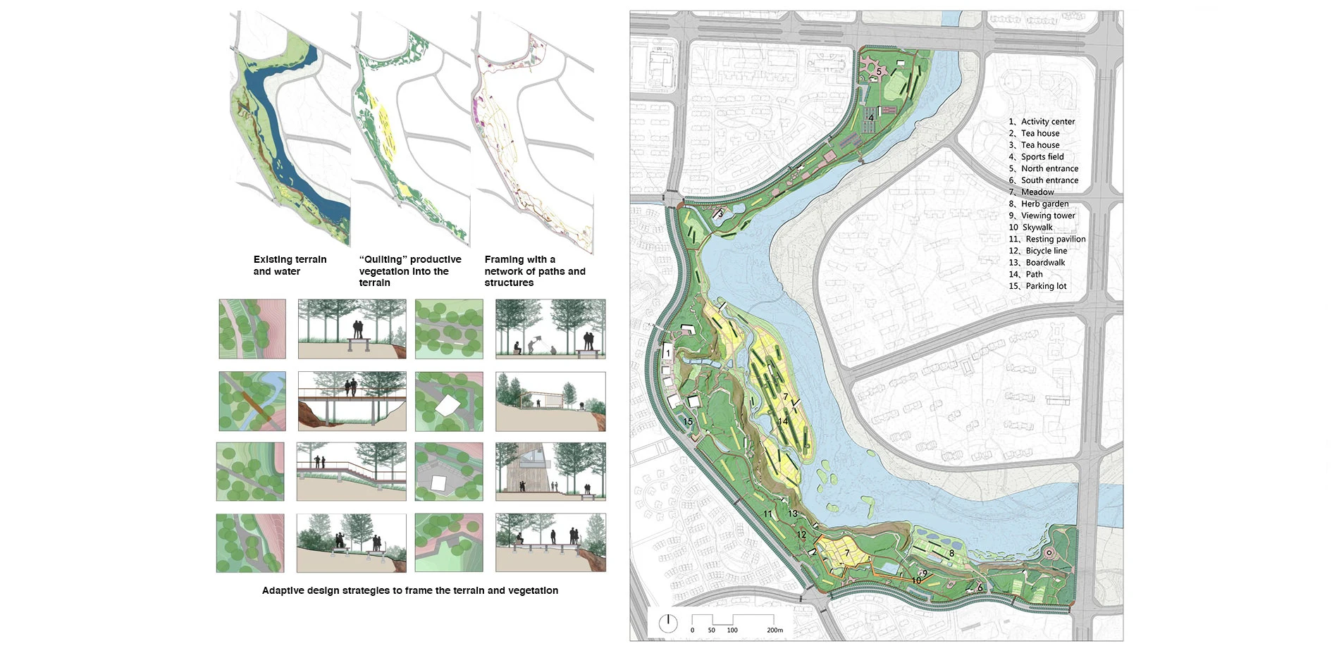 The client’s simple request was that the park should be a multifunctional green space that provides recreational opportunities for the citizens. The landscape architect took this opportunity to explore innovative concepts to realize the potential for an urban park that is not only a recreational green space, but also serves as ecological infrastructure that provides holistic ecosystems benefits. The design goals also included addressing big picture issues such as climate change, food and energy security, water resilience, and a new landscape aesthetic of productivity and low maintenance. Ideas such as “befriending the flood”, agricultural urbanism and productive landscape, minimum intervention, performative landscape, etc. are integrated into a landscape transformation strategy: “quilting the terrain”.2.2. Design Strategy: Quilting the terrain