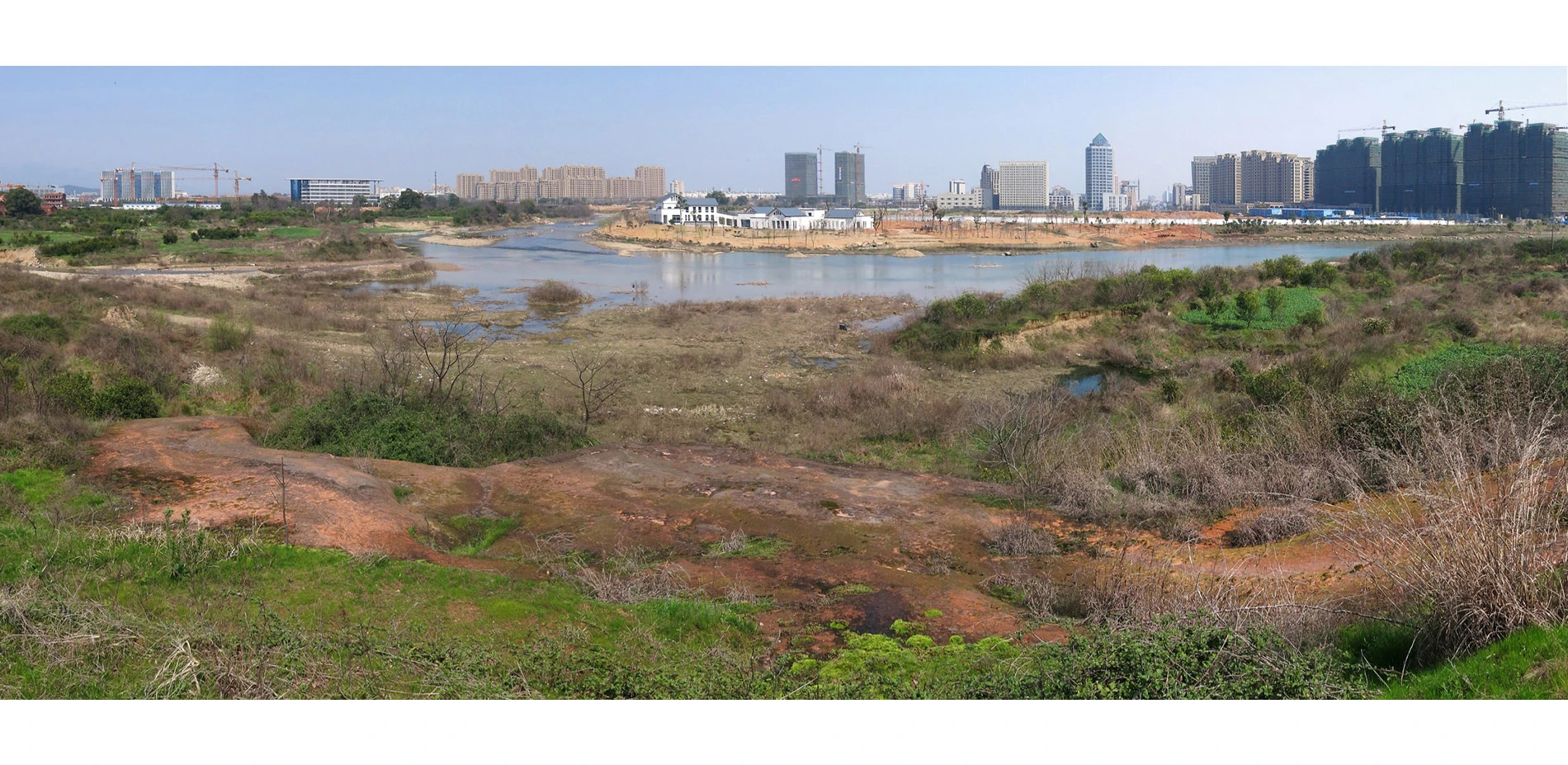 With a total area of 32 hectares, the site is surrounded by intensive urban development, bounded by the river on the west and an urban thoroughfare at the east. It is a remnant patchwork landscape made up of rolling hills covered with a mosaic of exposed red sandstone; vegetated areas of bushes and grasses; small swathes of abandoned farm fields; a riparian flood plain along the river basin; and a linear grove of trees bordering the river. Scattered in this landscape were small village trails paved with river stones, an old resting pavilion, an irrigation ditch leading to a pump house that pulled water from the river. There is an elevation drop of 20 meters from the urban roadway to the riparian flood plain and a sandstone cliff at the water front. The conventional approach in developing a large new urban district in China is to level the site–the method used in the surrounding landscape for urban areas and parks. Simply because this rugged landscape mosaic is not considered valuable or aesthetically pleasing and the cultural landscape elements are deemed insignificant, the common practice of leveling the ground simplifies the mechanical and engineering processes and facilitates the installation of infrastructure such as roads, water supply and storm water drainage.