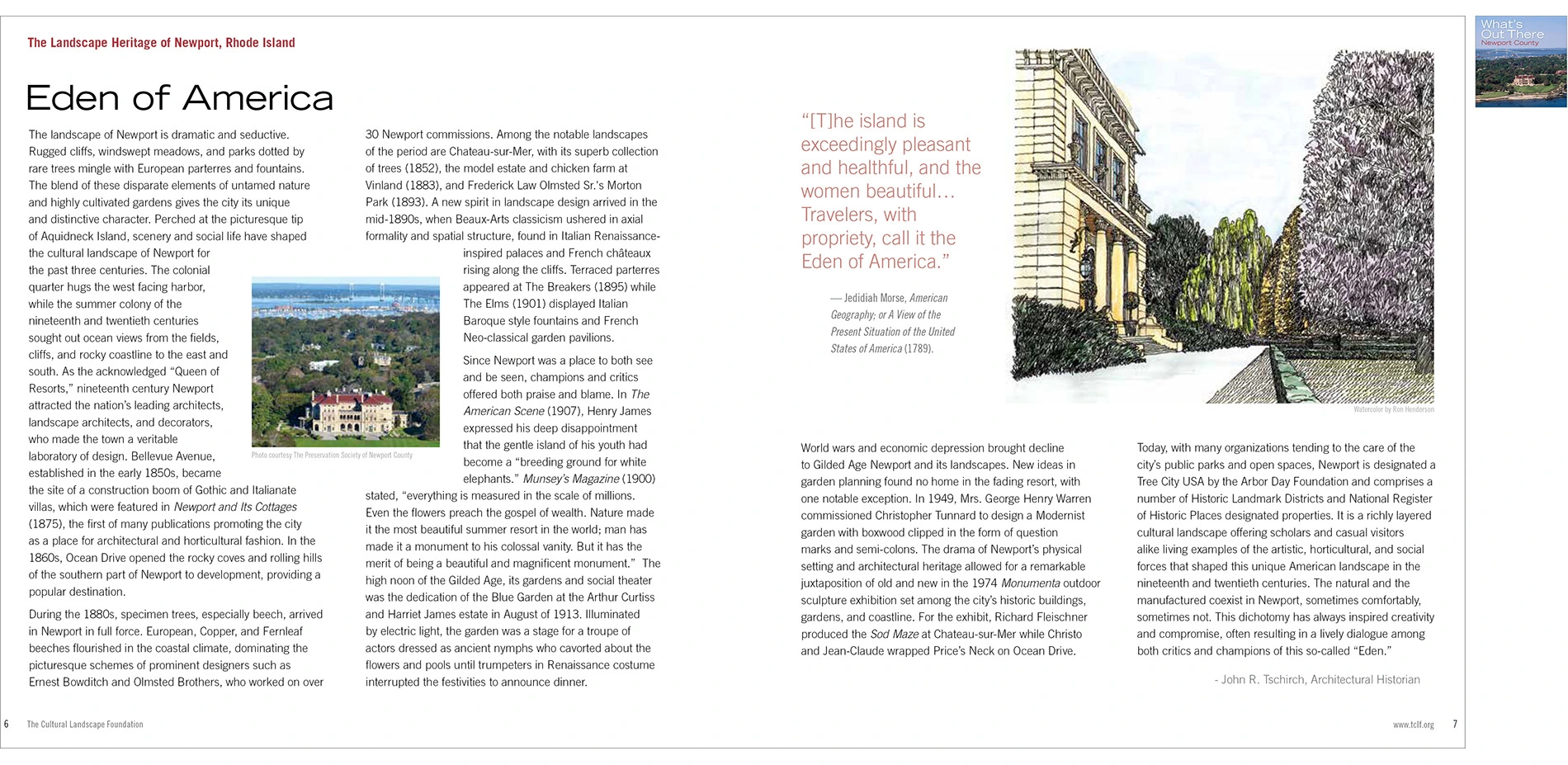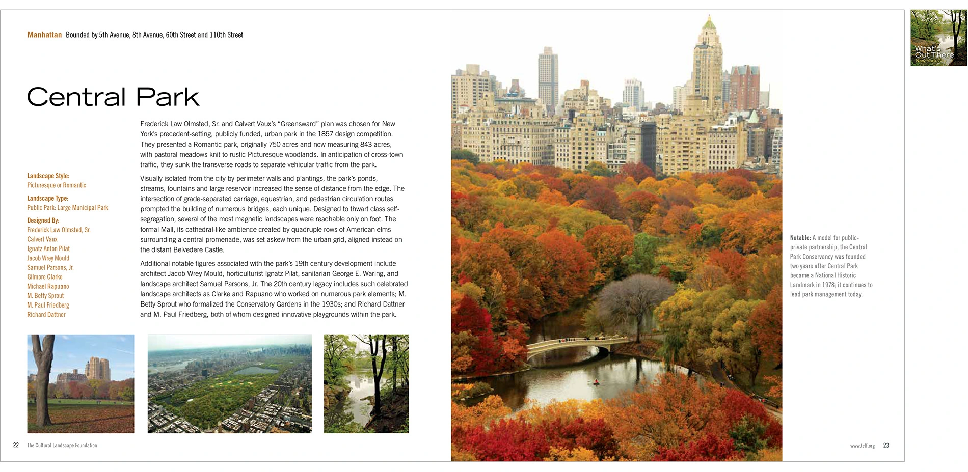 TCLF’s What’s Out There guidebooks, database and Weekend activities are conceived to help landscape architects, allied professionals, and the general public understand and value our shared landscape legacy. The ever-expanding guidebook series is a fundamental aspect of this initiative, one that makes important information available to the public in an attractive and easily understood format. -
