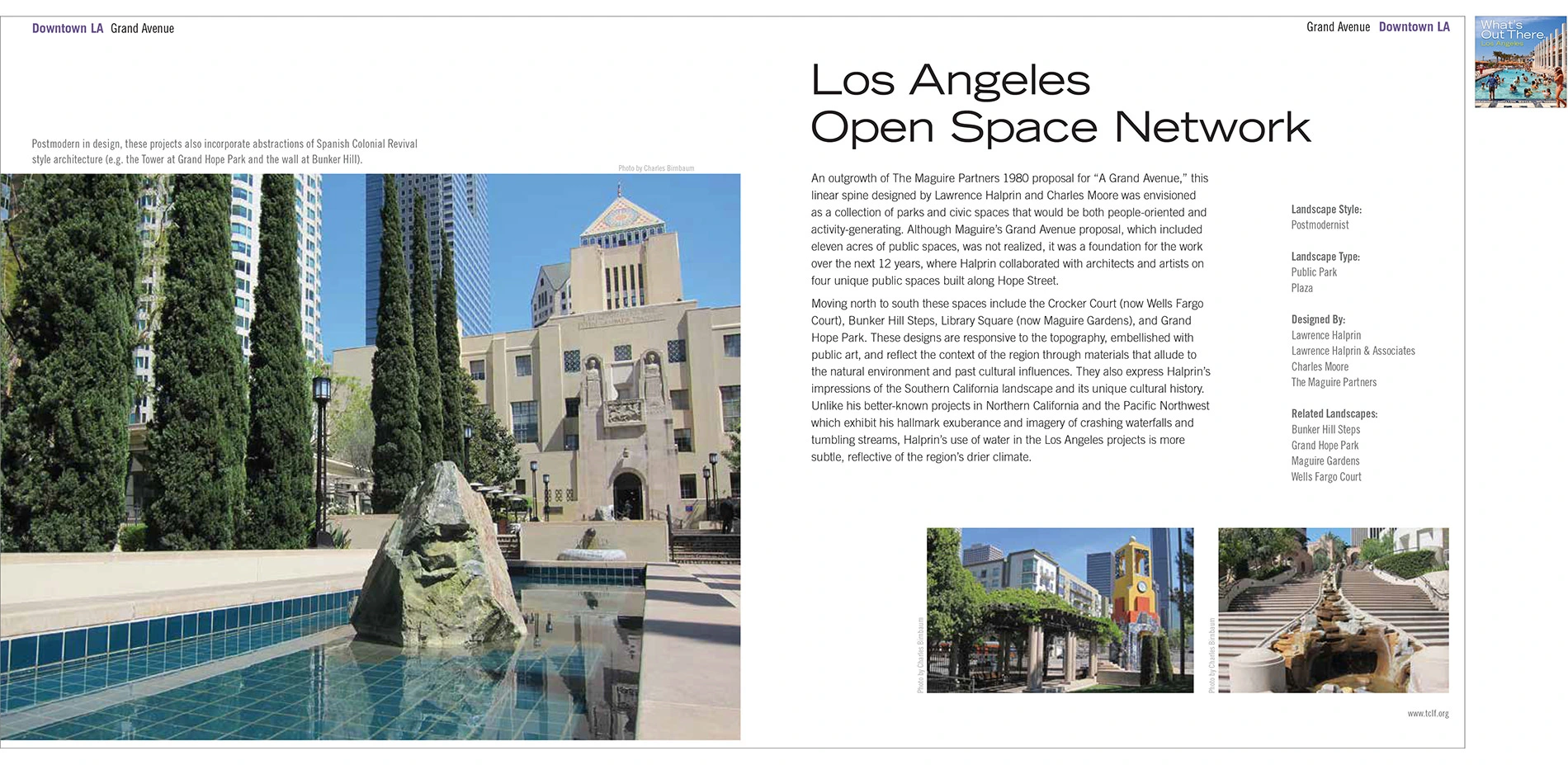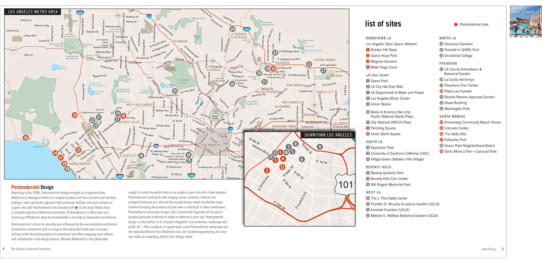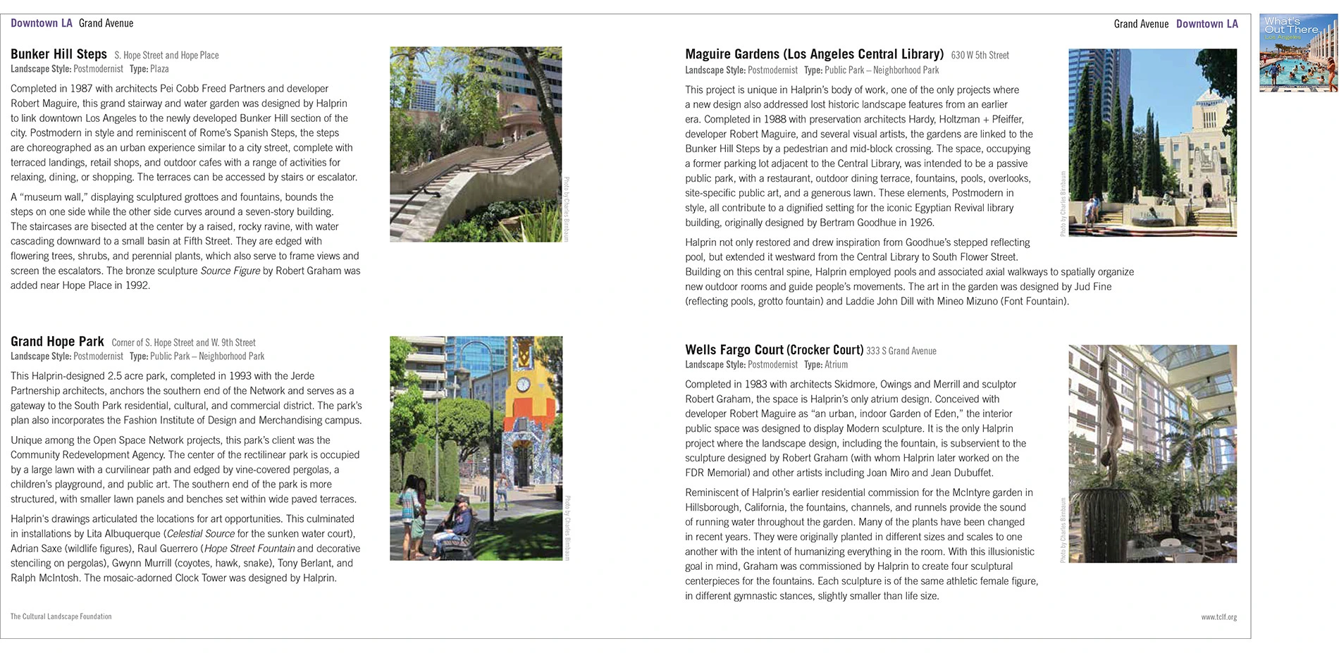 The Cultural Landscape Foundation’s (TCLF) What’s Out There guidebooks are concise, richly illustrated publications that provide overviews about the design history of mostly urban areas throughout the U.S., locates significant works of landscape architecture of each city on a map, and include 250-word essays and full-color photographs of each site. The guidebooks—usually more than 60-pages in length—are attractively designed and professionally printed as 8x8-inch, easily portable paperback books. The guidebooks are also available as free digital downloads. They derive from the What’s Out There database of nationally significant landscapes and their designers, and are created in tandem with the What’s Out There Weekend series of free, expert-led tours. Developed in collaboration with local partners, the guidebooks are intended for a diverse audience, including landscape architecture professionals and students, educators, tourists, and design enthusiasts. To date, thirteen guidebooks have been produced.
