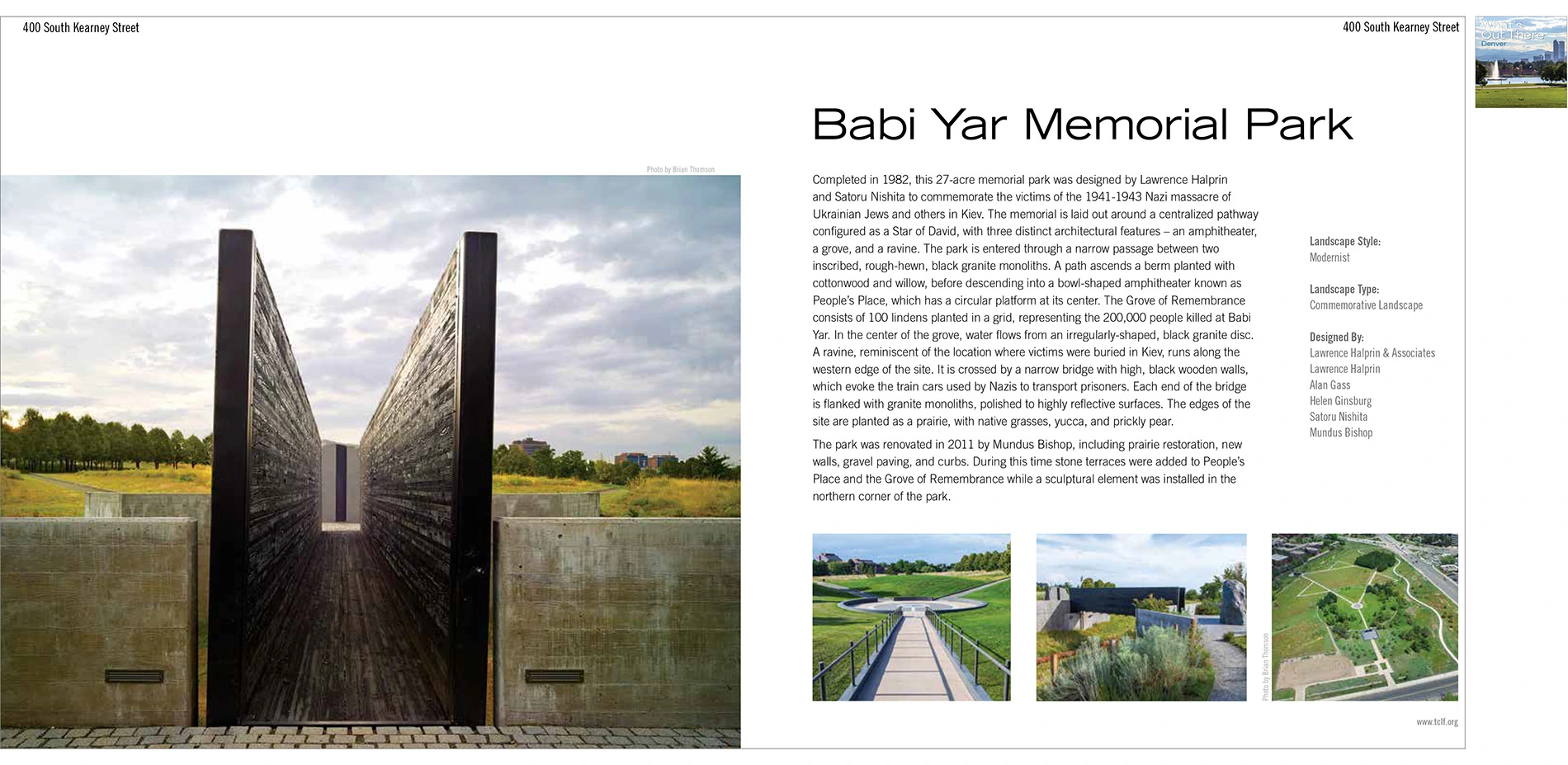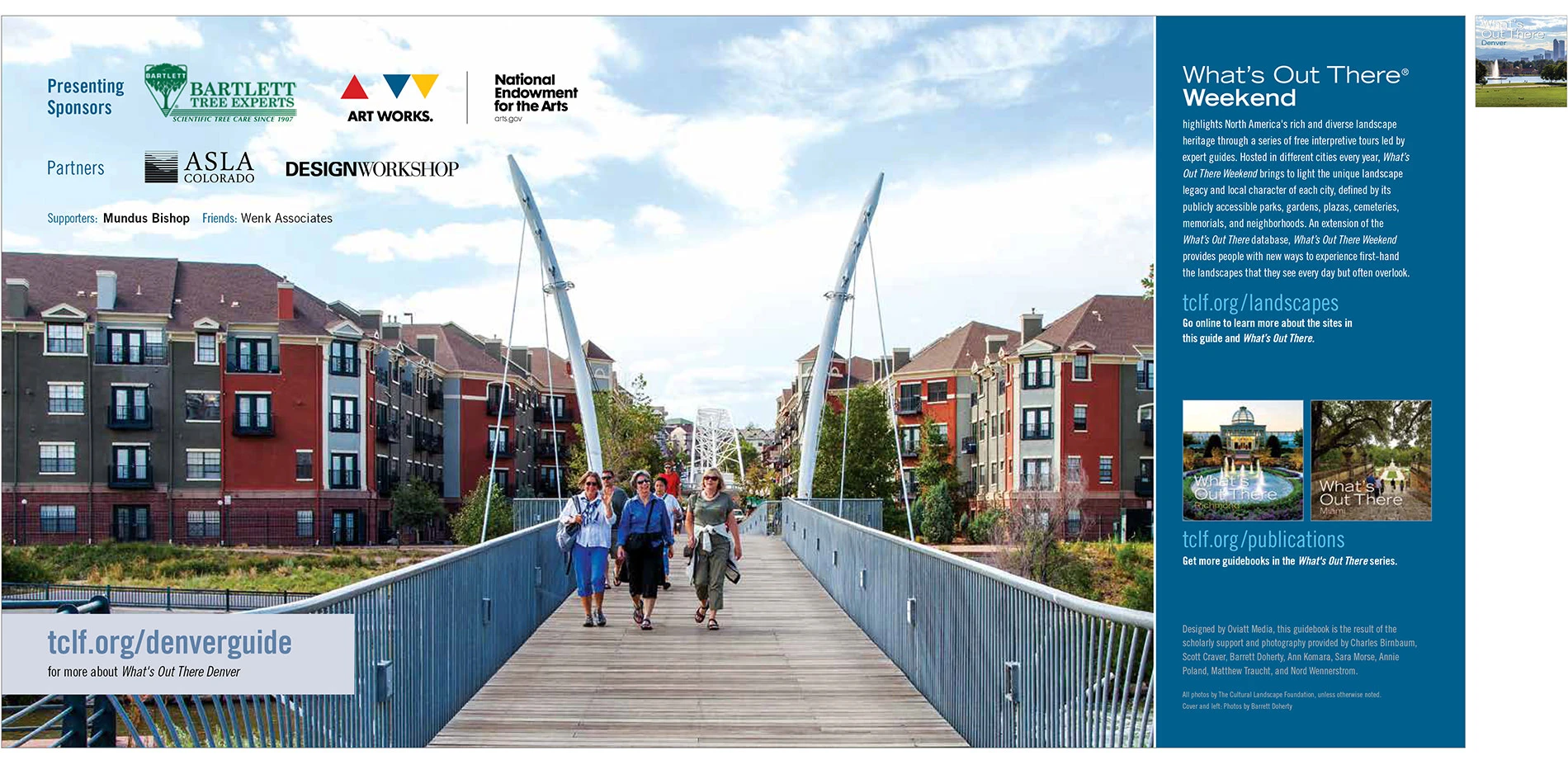 The guidebooks, along with the database and the tours, result from TCLF-managed partnerships with universities, advisory councils, public agencies, and preservation and design organizations. Through the university partnerships in particular, TCLF provides students with opportunities to research and document the sites and, during the Weekends, to participate in the tours themselves. For example, to create the Denver guidebook, TCLF collaborated with landscape architecture students at the College of Architecture and Planning at the University of Colorado Denver; invaluable assistance was provided by students at the University of Virginia and Virginia Tech for the Richmond guidebook; and documentation of sites in Austin and Houston, along with other sites in Texas, was provided by students at all four university level landscape architecture programs in Texas.