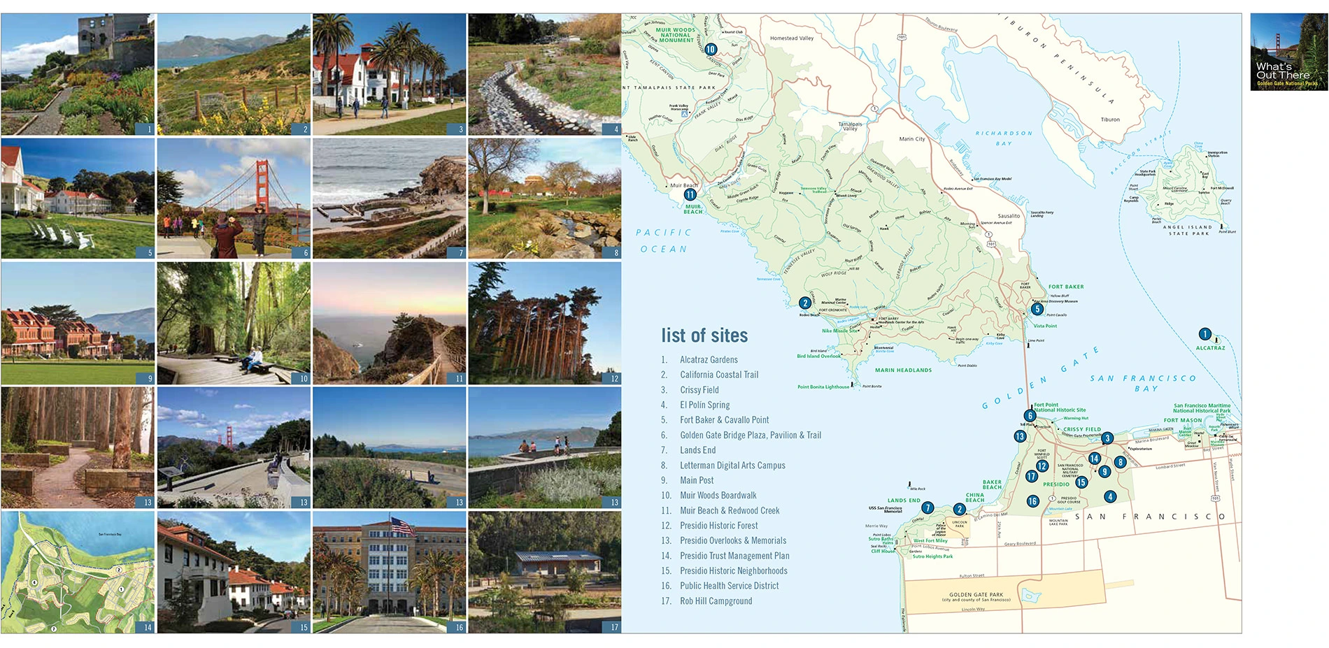 In each What's Out There guidebook all of the sites are identified on a map keyed to reference the city’s design themes. Every site is illustrated with carefully curated, contemporary, full-color photographs submitted by professional photographers, landscape architecture professionals and students, site managers, and volunteers. These photographs illustrate the landscape’s vegetation, circulation, structures, water features, sculptural elements, and the surrounding context.