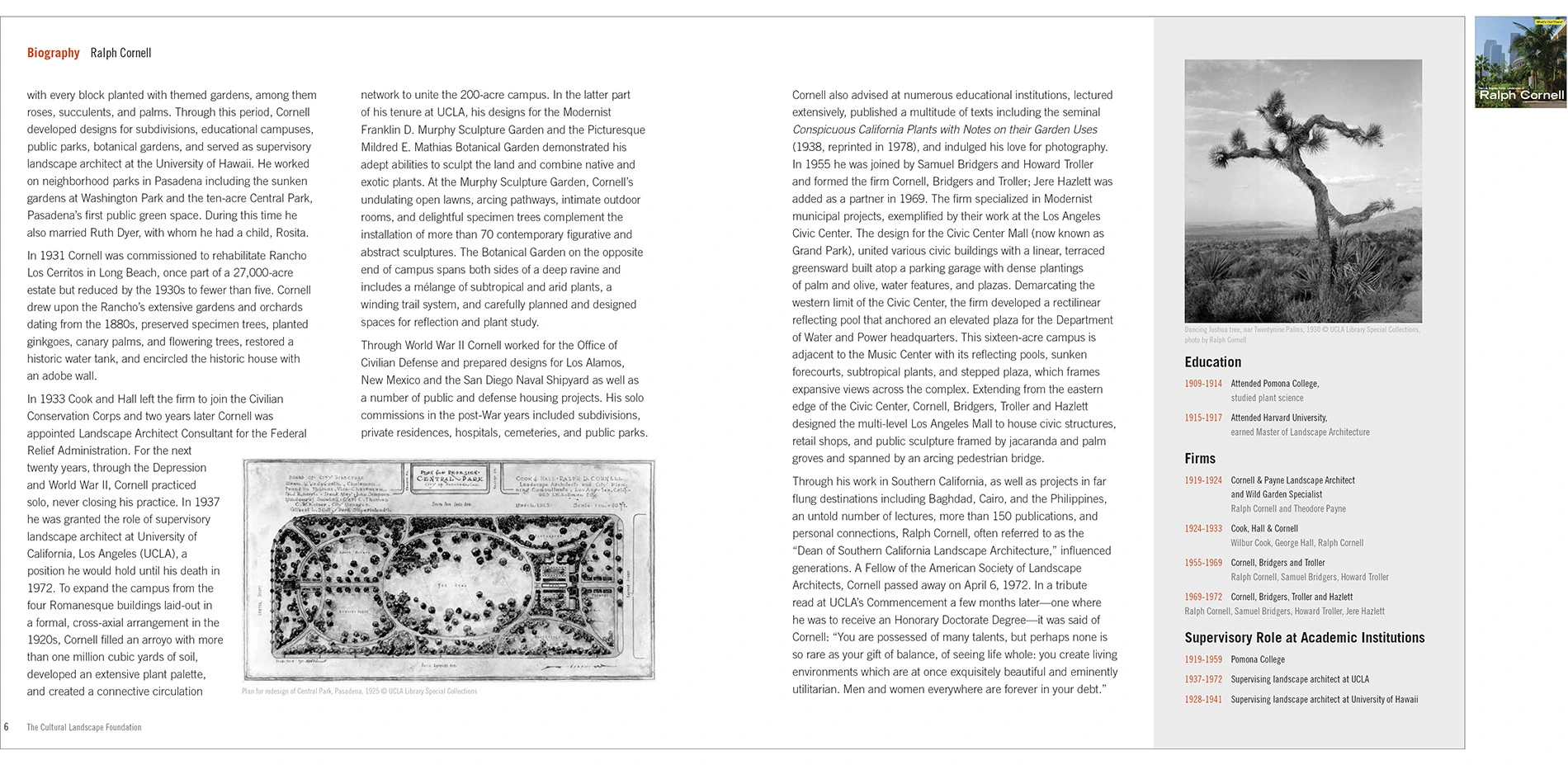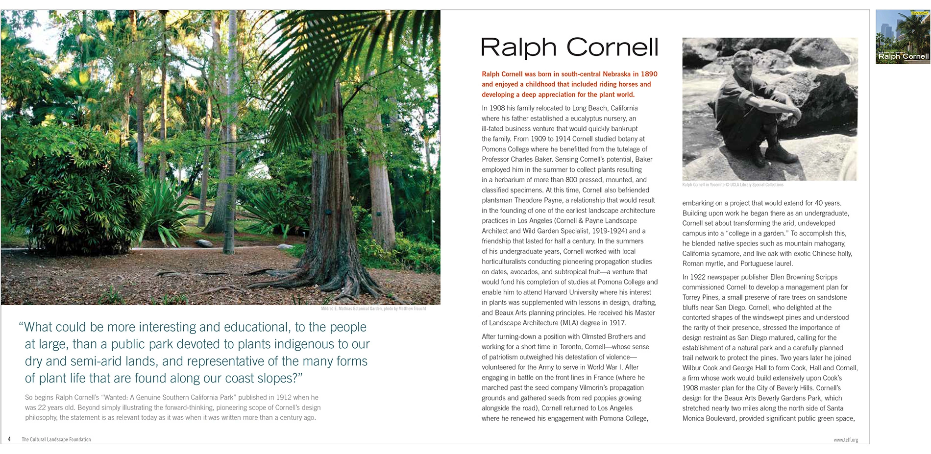 In addition to guidebooks to specific cities, TCLF has produced specialized guides. For example, following the overwhelmingly positive response to the Los Angeles guidebook and tours in 2013 – and calls for a repeat event – in 2014 TCLF produced a guidebook and tours about the work of landscape architect Ralph Cornell. The so-called “Olmsted of Los Angeles” did more to shape the city in the past century than any other landscape architect. The guidebook, which includes a biography and details about more than a dozen significant and influential Cornell designs from a career that spanned more than 50 years.