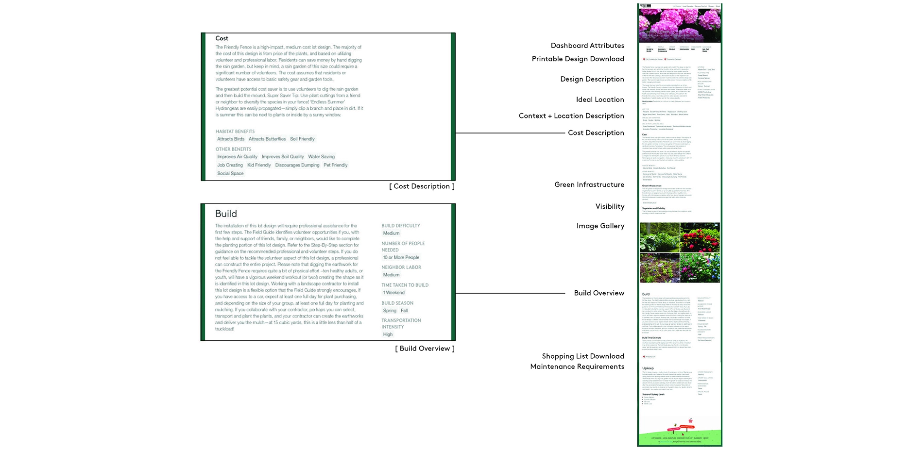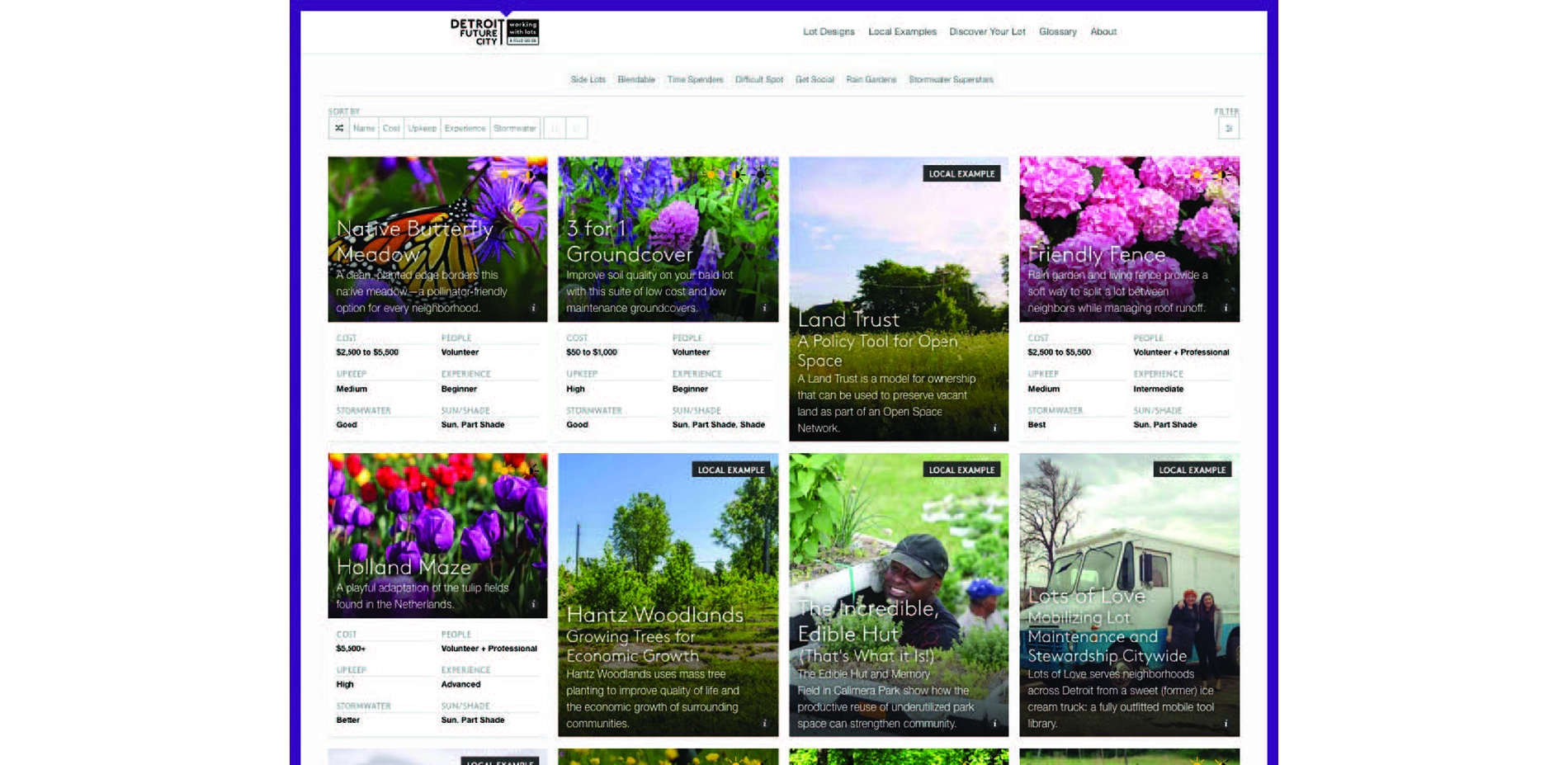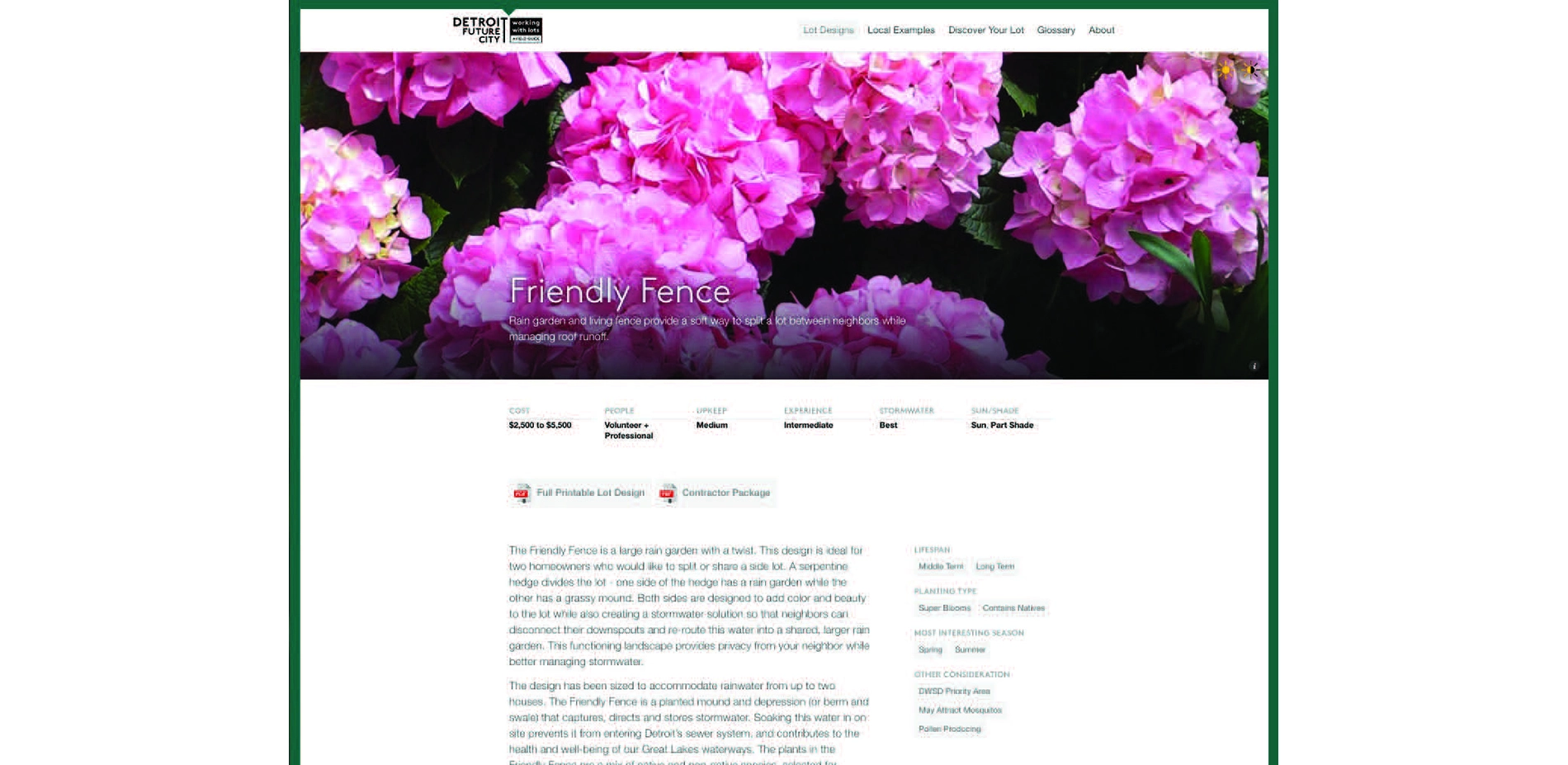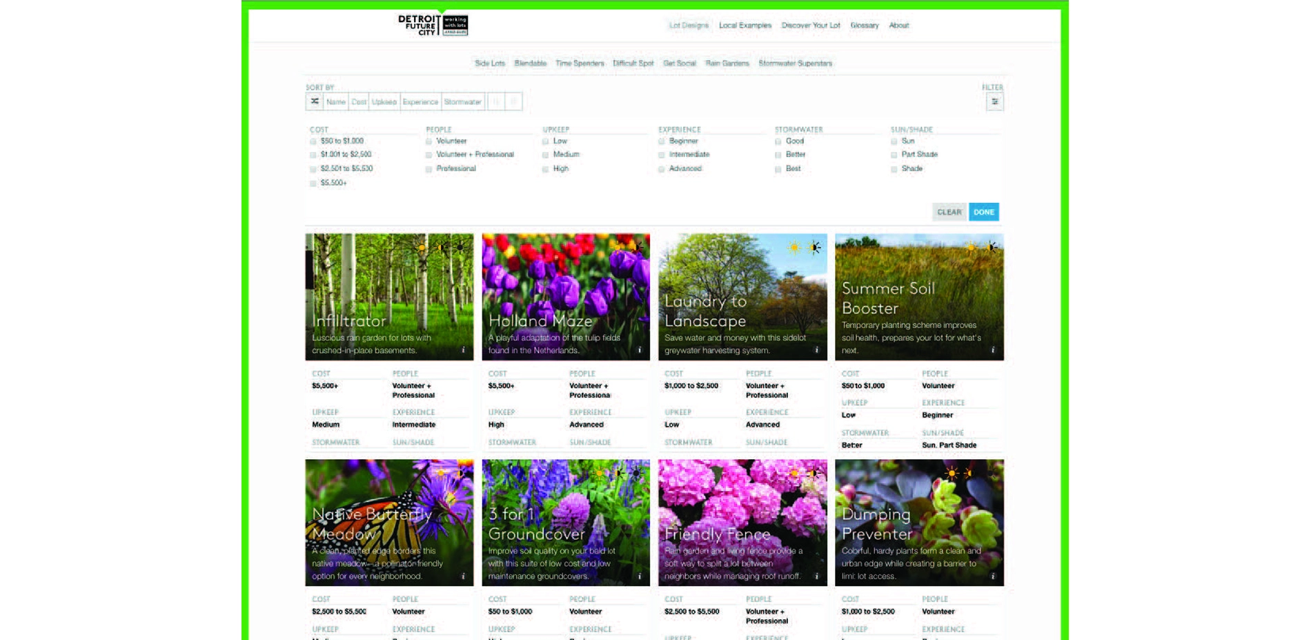 Through the website users can explore the catalog of site designs, filtering by desired cost, stormwater benefit, anticipated maintenance level, skill level of the site construction leader, as well as by neighborhood condition or individual lot type. The website provides a series of curated lists which each offer designs for anticipated user needs such as for Time Spenders (where users may improve conditions on their lot with more time than money), for Side Lots (designs that are most suitable for lots with a neighboring home or business), or for Getting Social (designs that are appropriate for large volunteer group events).