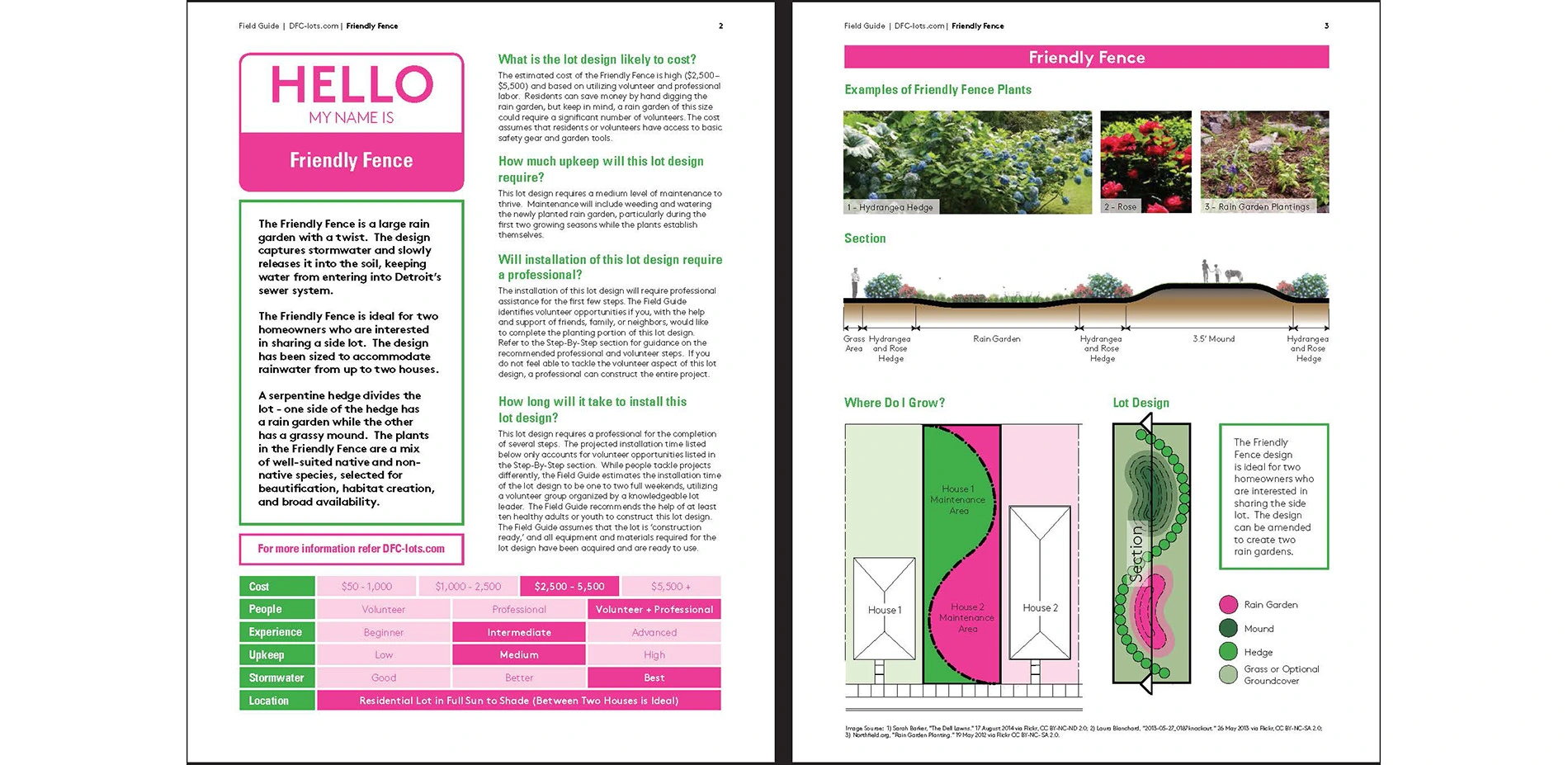 The Field Guide aims to address multi-stakeholder requirements in Detroit, including the needs of individual residents, businesses, and non-profit organizations serving as the stewards of an area of the city. With the express goal of cultivating resident-level participation, great consideration was given by the project team to the use of open, accessible language and visuals to describe landscape designs and concepts, as well as to the range of familiarity and comfort level of residents with building and maintaining landscapes.