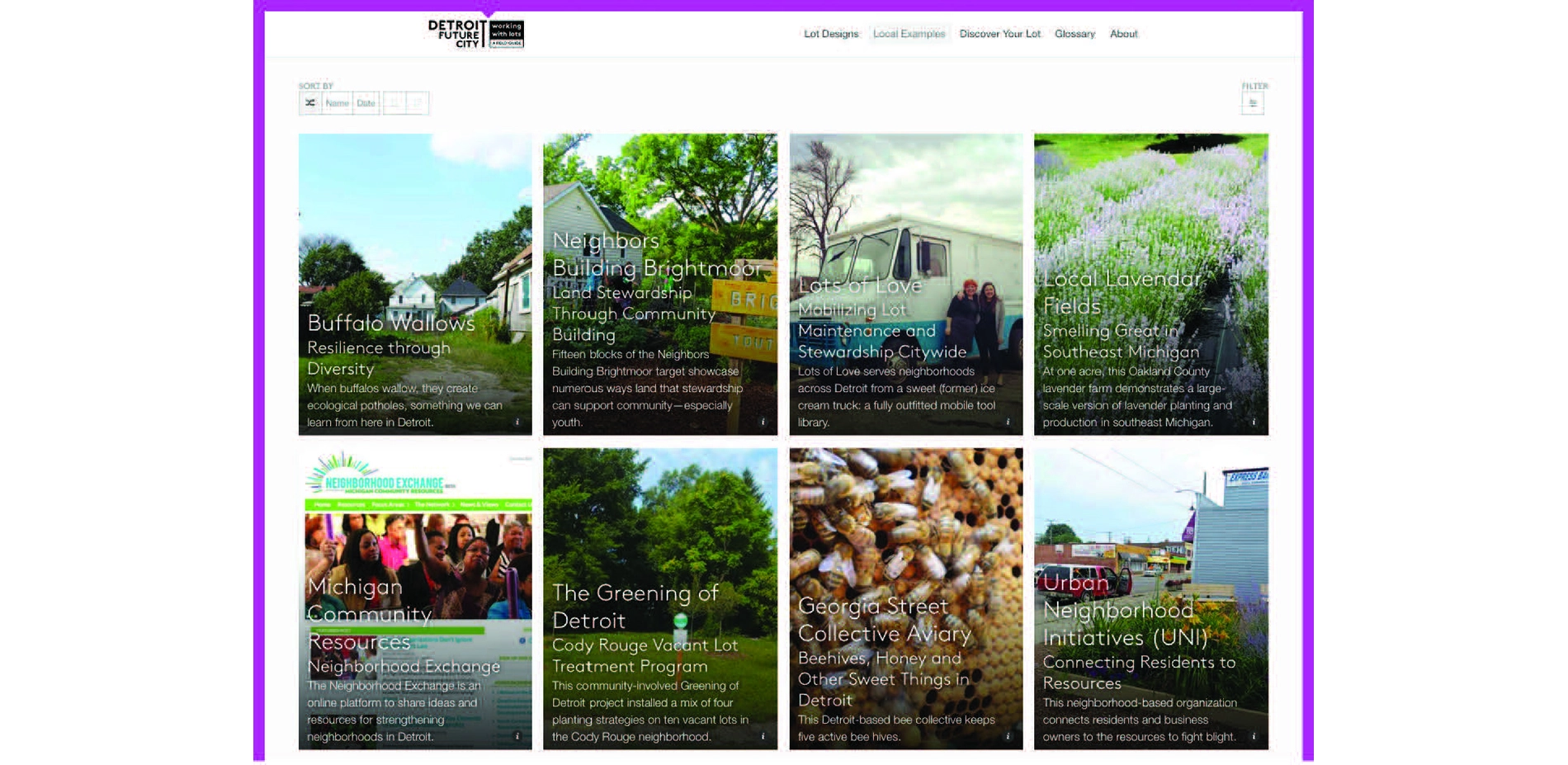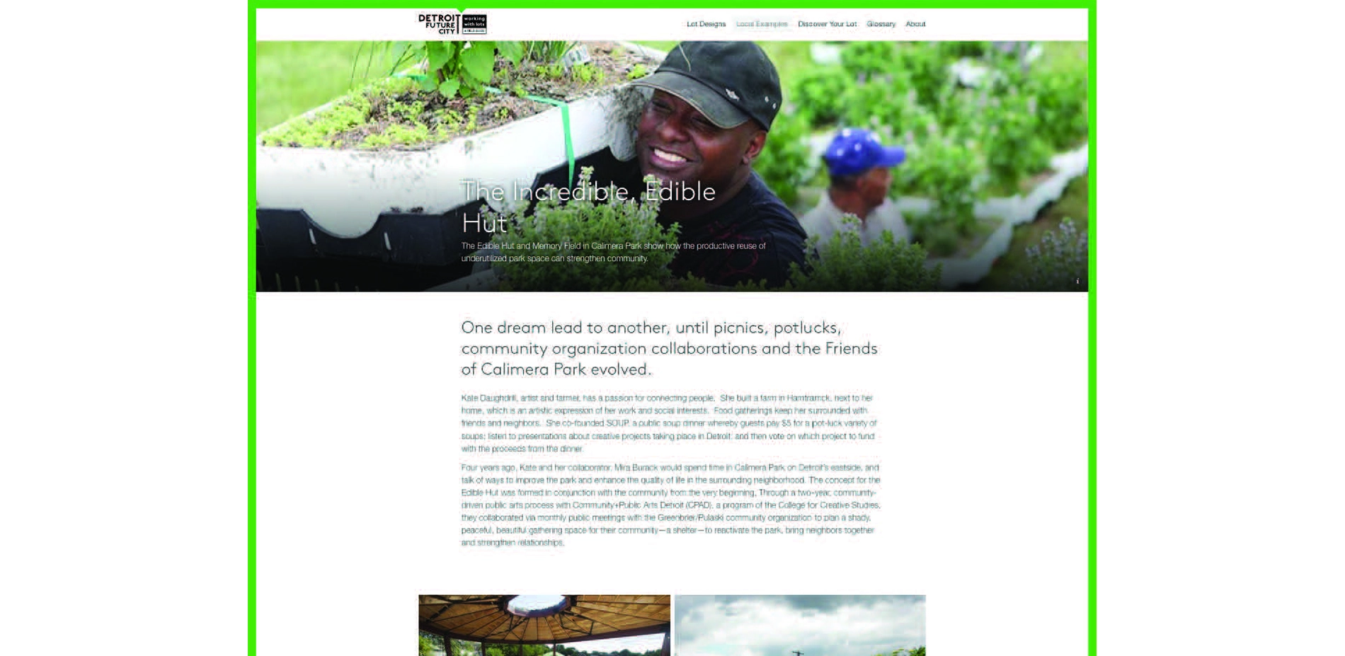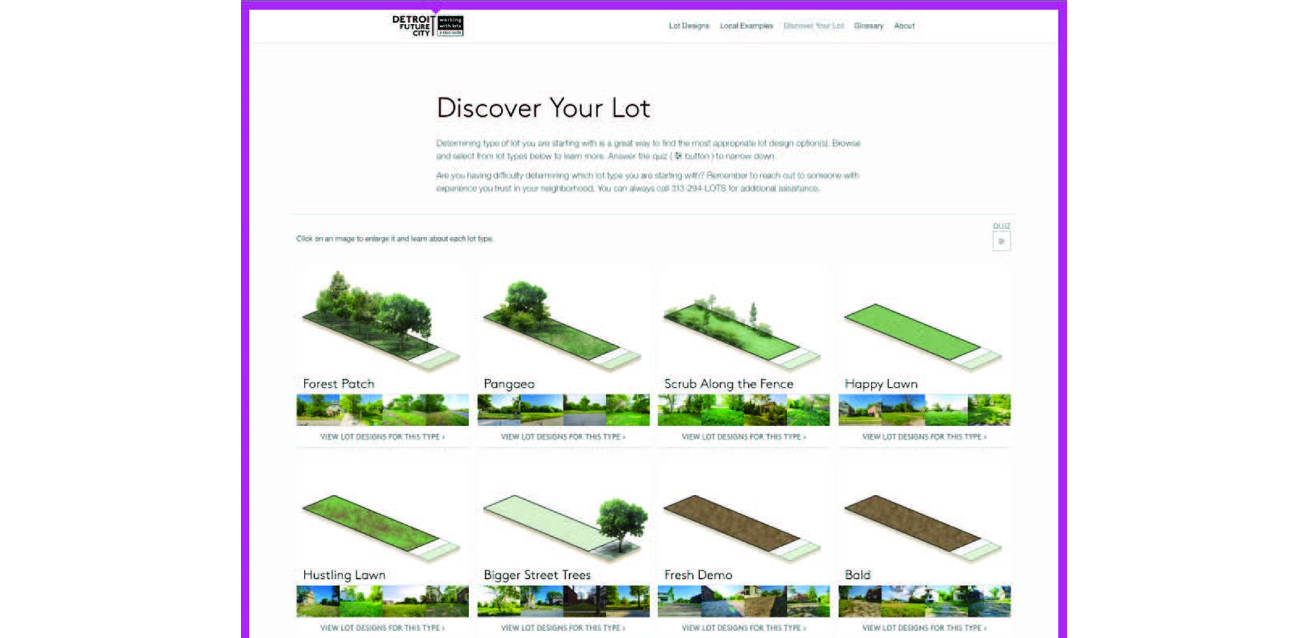 The website includes 34 site designs for single, double, and triple vacant (structure-free) residential and commercial lots in Detroit. The designs are described for the purposes of both civic engagement and installation by the general public, as well as through more traditional construction detailing for groups and organizations choosing to hire a landscape contractor. Additional resources on the website included an interactive quiz to understand existing site conditions; a directory of Detroit-based landscape suppliers and helpful organizations; and inspirational profiles of people, projects and programs currently working in the region to transform vacant land into an asset.