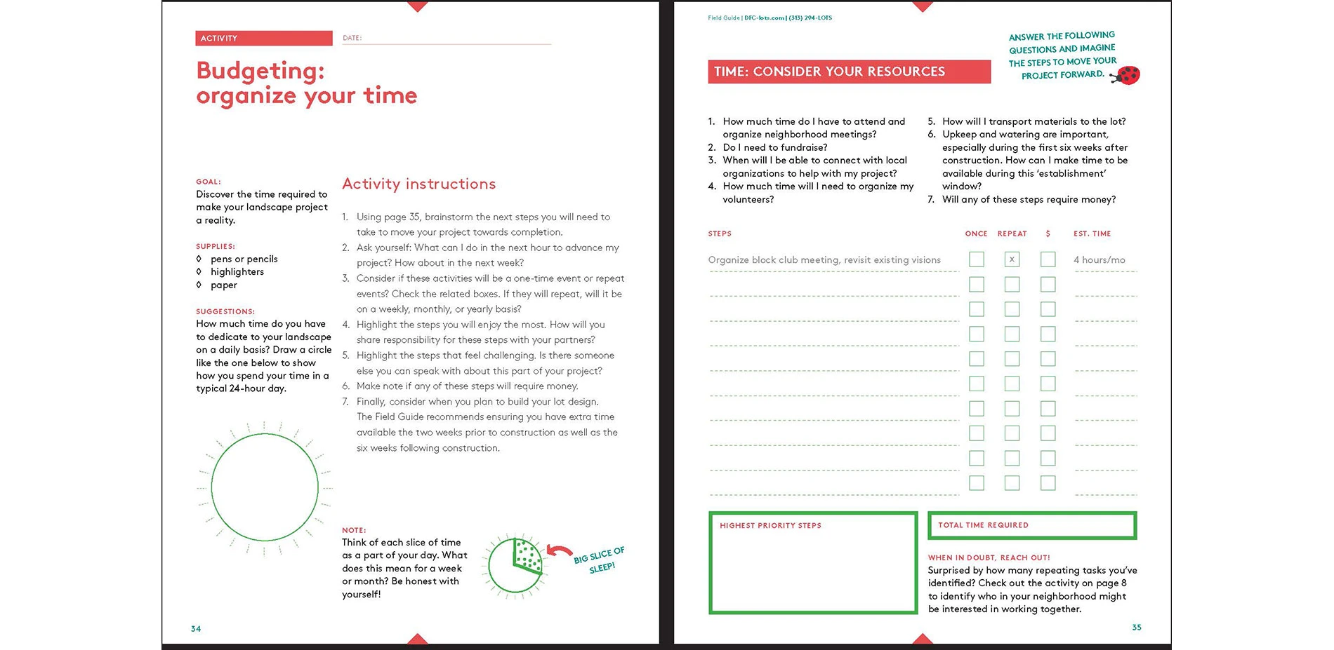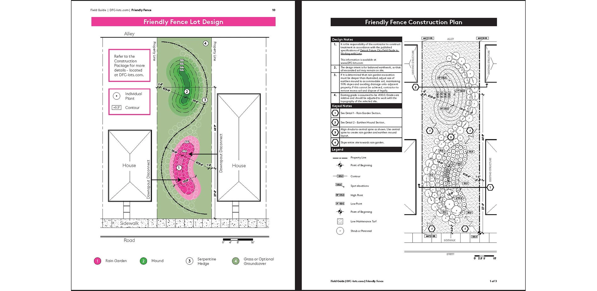 The Field Guide to Working With Lots is a collaboratively developed, hands-on tool for vacant land transformation in Detroit. Primarily a website, the Field Guide was initiated to expand local understanding of what is possible on vacant residential and commercial land, to showcase existing land revitalization projects, and to provide broadly accessible site designs and strategies, each described with actionable levels of detail. The Field Guide website (www.DFC-lots.com) is complemented by select paper-based resources including an exploratory, draw-along workbook, created to structure the project development process of small groups, block clubs, and residents working in collaboration.