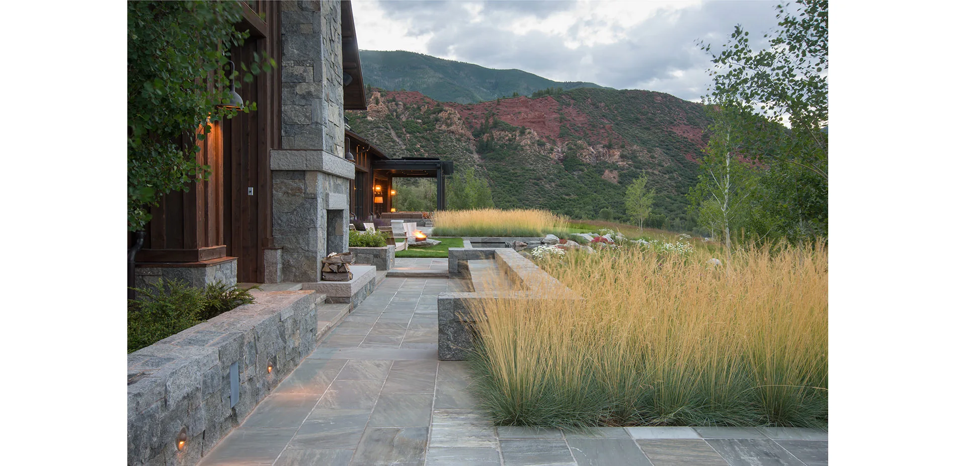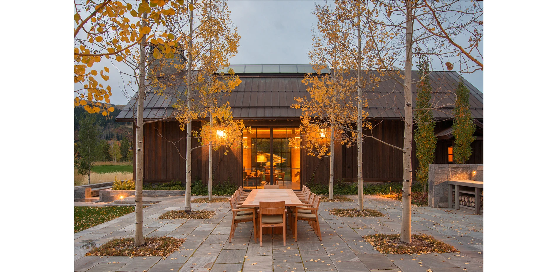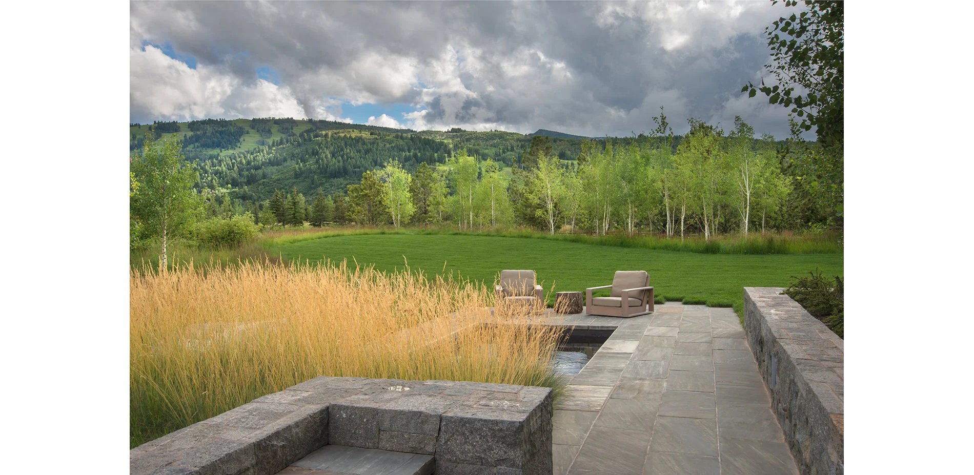 In lieu of following development guidelines that suggested the implementation of berms and dense coniferous plantings between structures, the design team utilized the space as the home’s primary gathering space. The result is a unified setting that erases any notion of underlying jurisdictional boundaries. Although designed to accommodate large gatherings of friends and family, the courtyard maintains a sense of intimacy within the expansive environment. Set upon the primary architectural axis and resting beneath a dappled canopy of aspen trees, the family’s dining table serves as a ceremonial centerpiece. To the north, a tightly spaced windrow, a familiar element found in historic ranch compounds, provides protection from the harsh western winds, and creates a vegetative screen between buildings and the autocourt. To the south, split-faced stone stairs descend onto a rectilinear segment of lawn, punctuated by a carved granite fire pit. A shallow dipping pool with an infinity edge reflects a panoramic vista of mountains and sky. A designed granite escarpment provides an informal seating ledge.