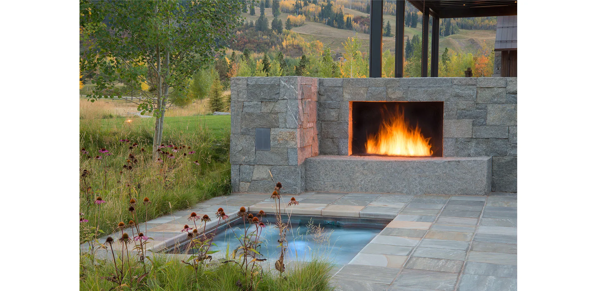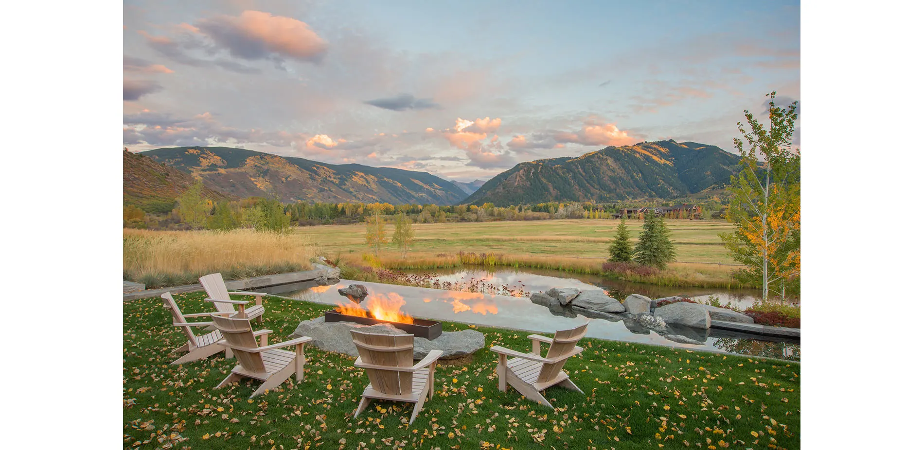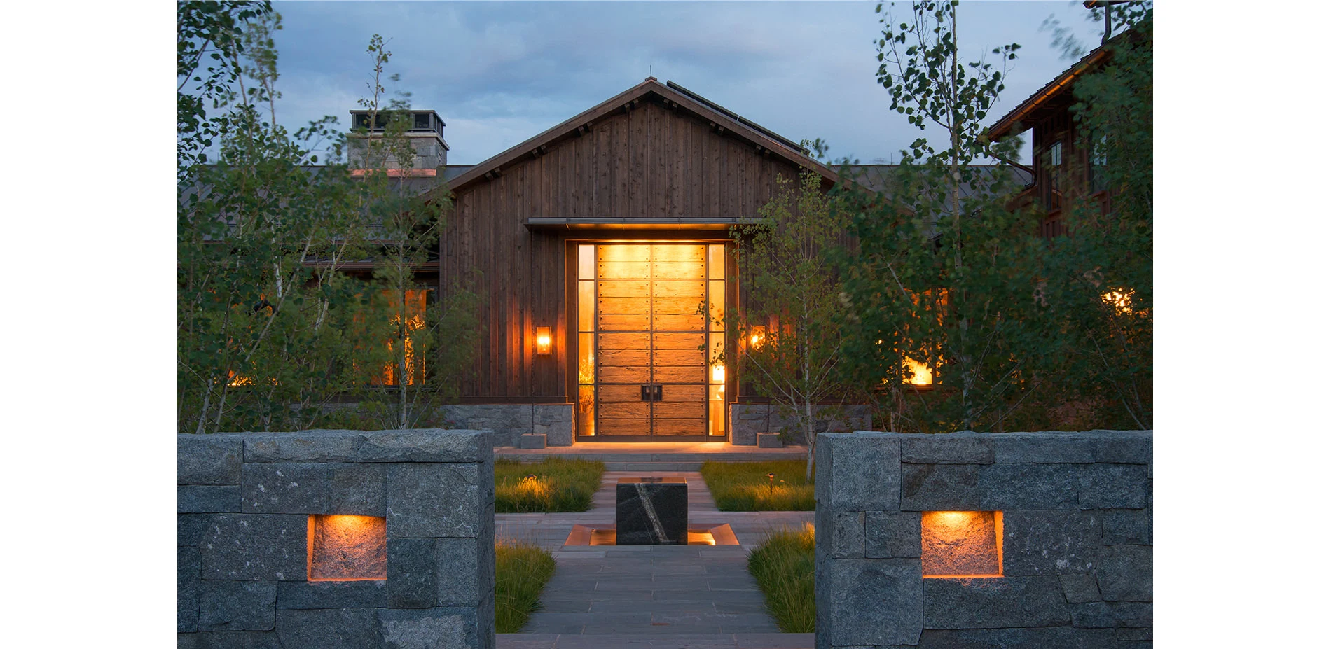 In lieu of following development guidelines that suggested the implementation of berms and dense coniferous plantings between structures, the design team utilized the space as the home’s primary gathering space. The result is a unified setting that erases any notion of underlying jurisdictional boundaries. Although designed to accommodate large gatherings of friends and family, the courtyard maintains a sense of intimacy within the expansive environment. Set upon the primary architectural axis and resting beneath a dappled canopy of aspen trees, the family’s dining table serves as a ceremonial centerpiece. To the north, a tightly spaced windrow, a familiar element found in historic ranch compounds, provides protection from the harsh western winds, and creates a vegetative screen between buildings and the autocourt. To the south, split-faced stone stairs descend onto a rectilinear segment of lawn, punctuated by a carved granite fire pit. A shallow dipping pool with an infinity edge reflects a panoramic vista of mountains and sky. A designed granite escarpment provides an informal seating ledge.