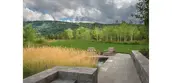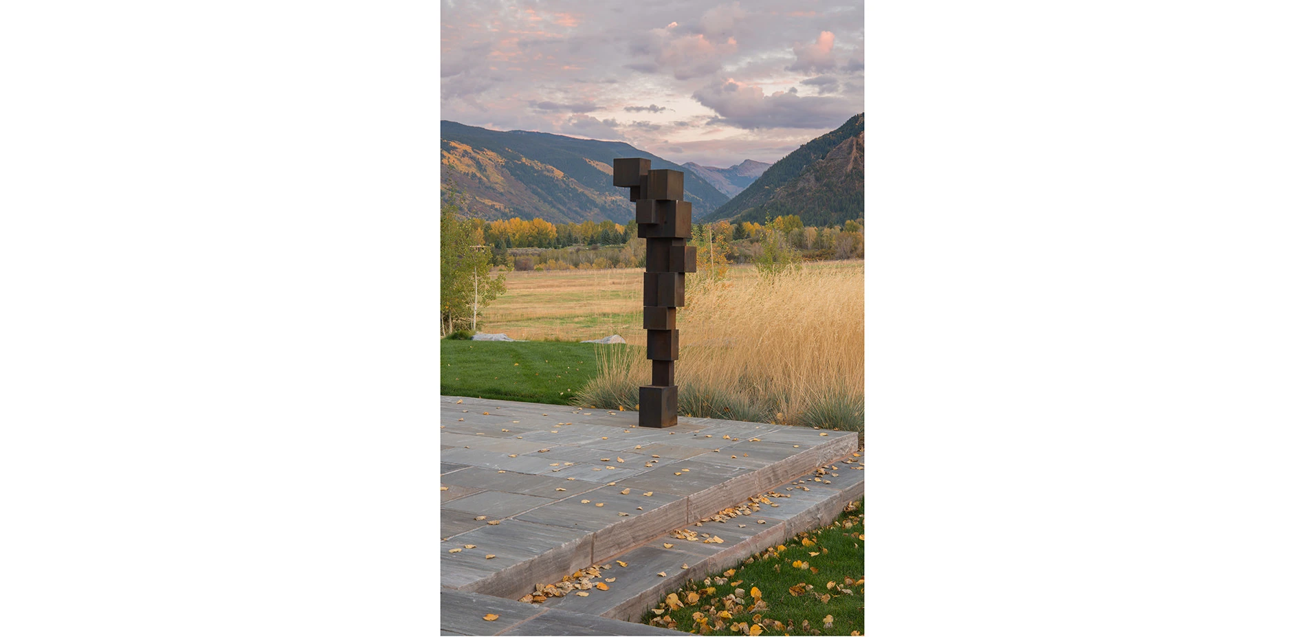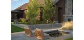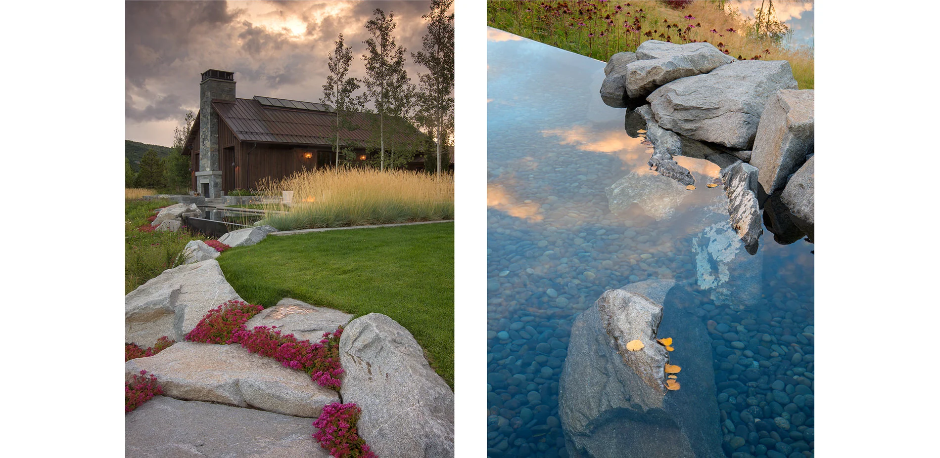 A choreographed arrival sequence extends the visual character of the agrarian setting into the domesticated landscape. Ascending the re-sculpted landform, the entry drive, built of recycled asphalt, meanders through a restored meadow interspersed with statuesque Ponderosa pines, terminating in a walled courtyard. From inside the courtyard, one is immediately aware of the dynamic simplicity that is derived from the seamless and unfolding relationship between architecture and landscape where ordinary agricultural forms are reinterpreted with a sophisticated, regional palette of stone, water, and plants. Set upon architectural focal points, two perpendicular paths descend toward a hand-carved granite cube at the center of the space. Surrounded by groups of aspen, the cube is a sculptural focal point in the courtyard, framed from various perspectives by select groupings of aspen. The sound of water as it flows over the smooth surface of the cube, echoes within the enclosed space.