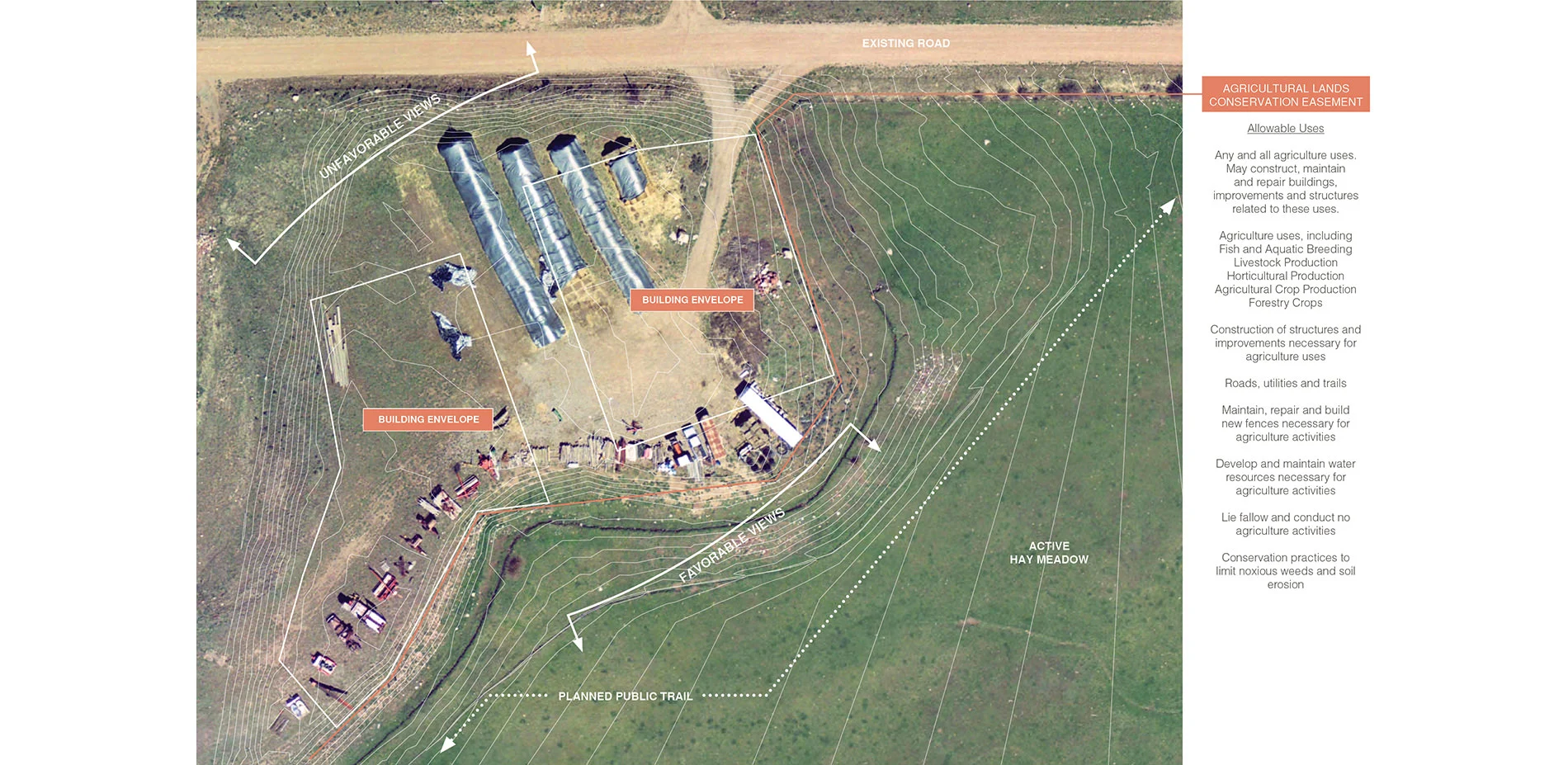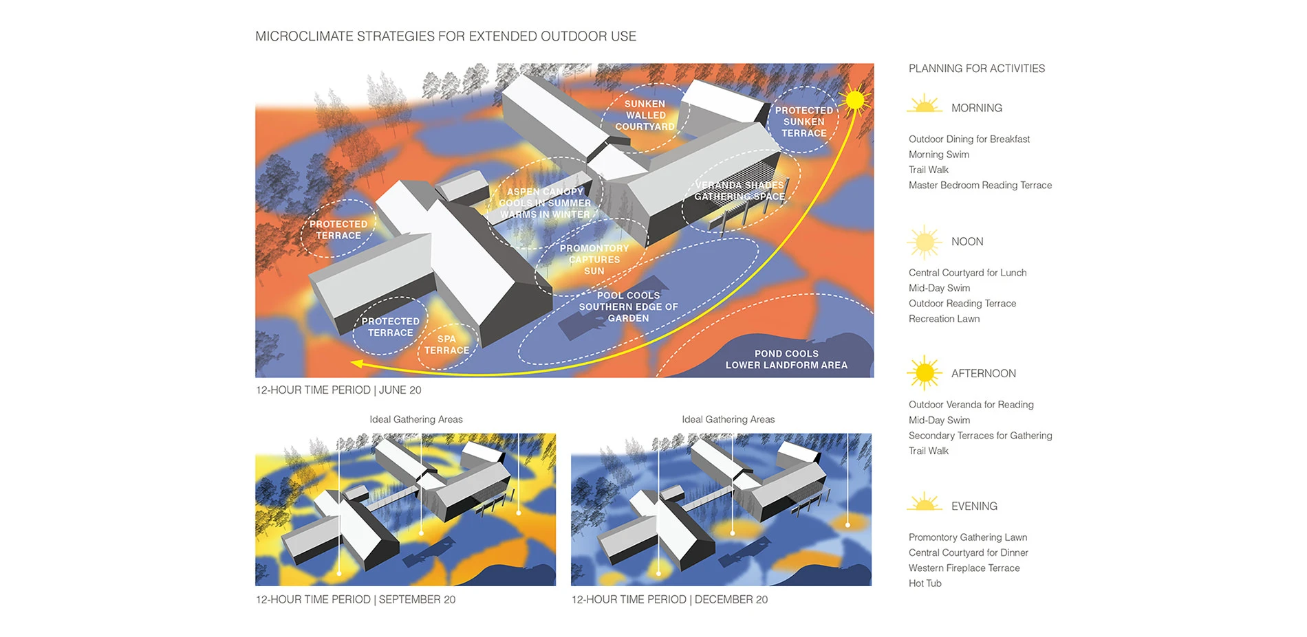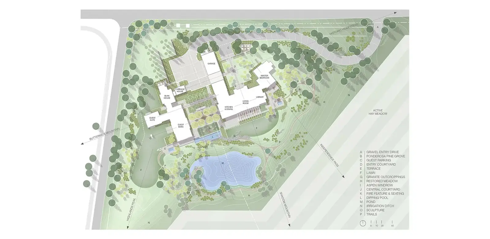 The property’s two building envelopes are separated by a 40’ landscape zone. Original development guidelines outlined the need for significant plantings and earthwork between architectural structures a concept which, when implemented, would have divided and isolated uses. Instead, the owners sought an alternative vision - to create a family retreat that would celebrate the idea of seamless indoor-outdoor living. Leveraging and combining the independent building envelopes, the design team created a modern farmstead inspired by regional agricultural development patterns. One envelope includes the primary residence with living spaces, bedrooms, and a semi-detached garage. The second envelope incorporates a guest house with a bunk room, recreational room, and a small detached barn. A synergistic dialogue between landscape and architecture utilizes natural openings, axial connections and distant vistas to create a modern interpretation of a Western homestead. Analysis