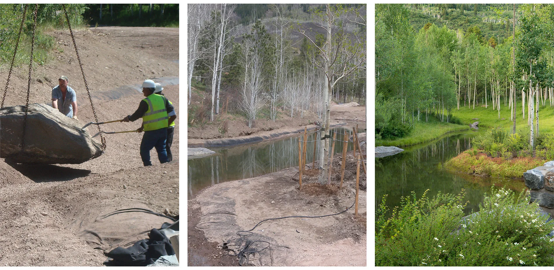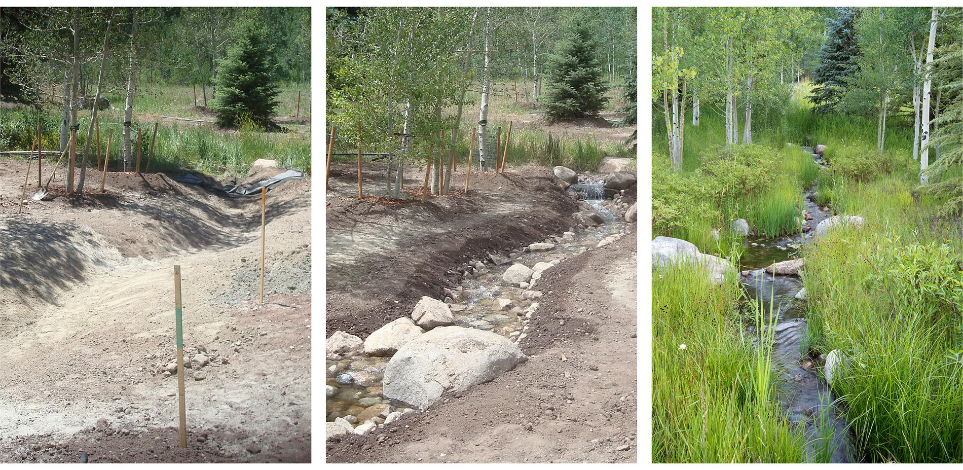 Restoration of the neglected, barren and weed-infested property began with an analysis of surrounding existing environmental conditions, including a detailed study of predominant vegetative communities, species composition and density, and microclimates that would inform the development of an overall design for the property. A complete site analysis revealed extreme climate variations, including intense solar exposure, prevailing winds, temperature fluctuations and extended snow coverage from October through April. In addition, a study of the regional Montane plant communities suggested the implementation and/or reintroduction of ten distinct vegetation types including pine forest, mixed conifer forest, aspen woodland, cottonwood riparian, willow riparian, dry meadow, wet meadow, emergent sedge wetland, mountain shrublands, wildflowers, and open water.