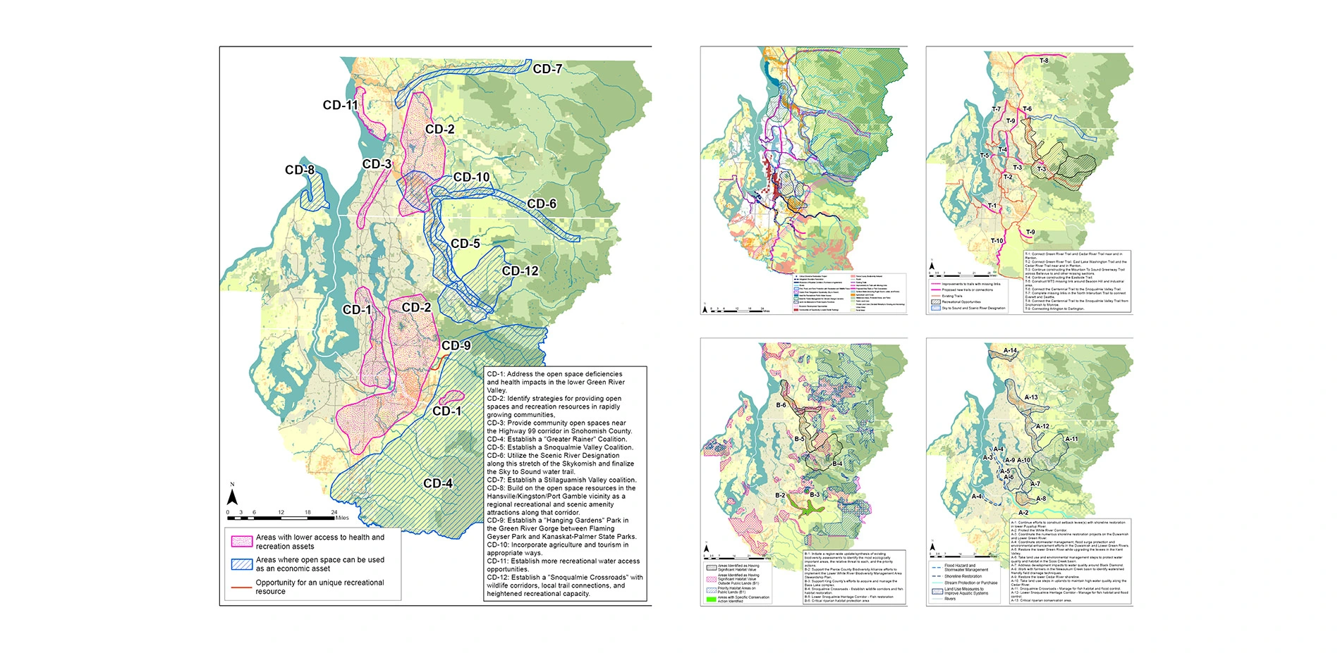 For the highly populous Green-Duwamish Watershed Strategy, we employed an intensive expert-engagement process of interviews, focus groups and open houses in a “Listening” phase to establish a thorough baseline of existing conditions, initiatives and plans. The project’s Watershed Advisory Group identified priority foci for the watershed strategy as social equity, a comprehensive approach to connected open space, and integration of stormwater planning. For the Snohomish WOSS, our staff mapped extensive GIS data and identified ecosystem service “hot spots” to inform subsequent planning. We then worked with county, state, municipal and non-profit planners to create and evaluate spatial scenarios, to understand the multiple benefits of potential collaborative actions and proposals.