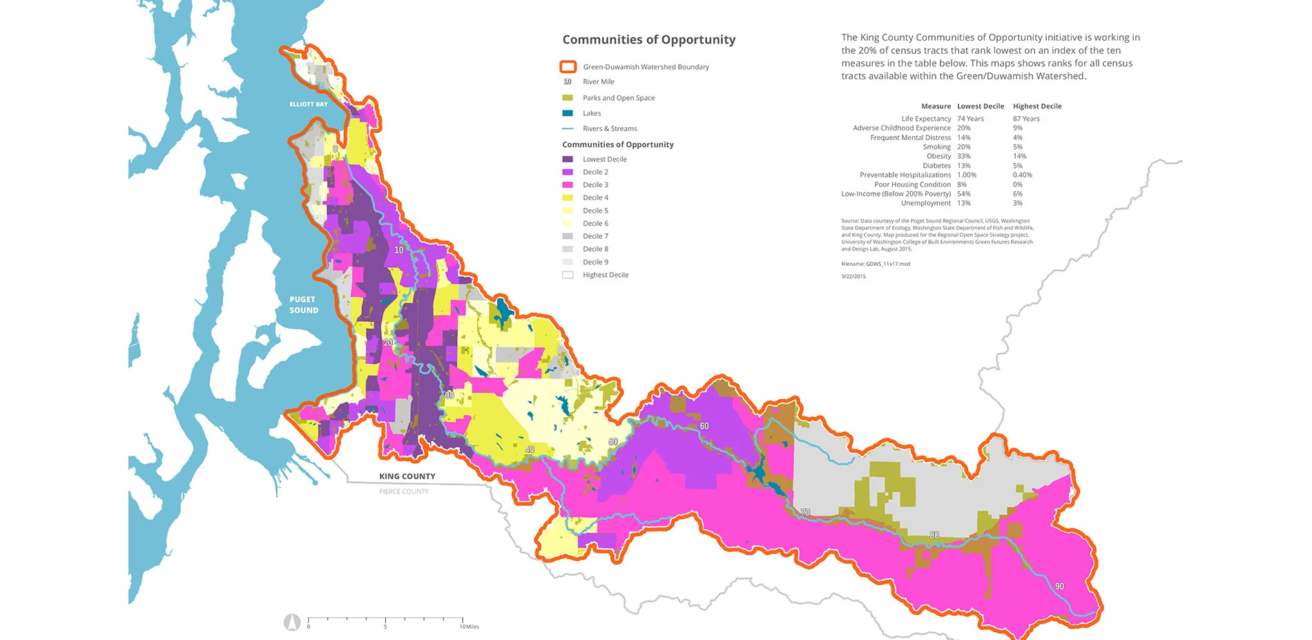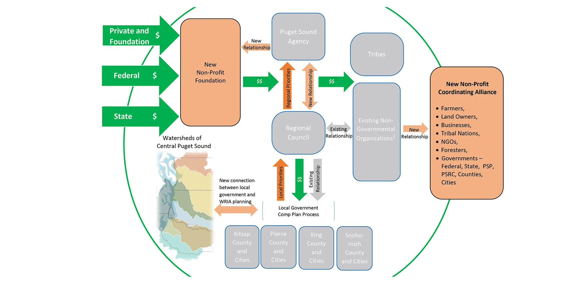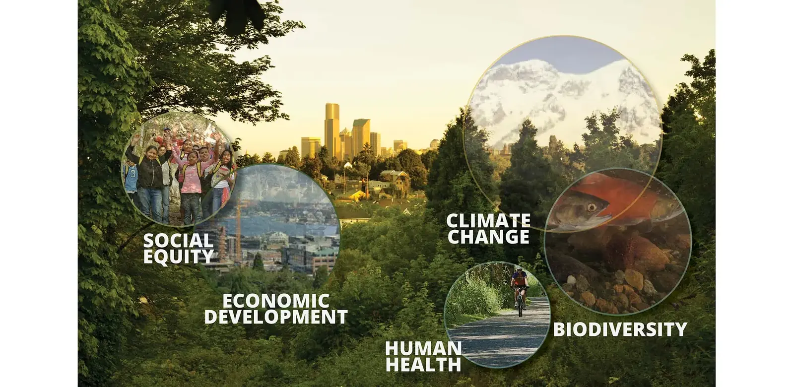 The Central Puget Sound region is comprised of eight major watersheds and four counties in the Greater Seattle Metropolitan Area, stretching from the crests of the Cascade Mountains to the shorelines of Puget Sound. The current and expected population growth is projected to severely strain the region’s natural resources, threatening the environmental assets that have defined the region and fueled its economic growth and quality of life. While numerous efforts are aimed at protecting and restoring Puget Sound landscapes and waters, government and non-profit initiatives have been uncoordinated and inadequately funded to confront major challenges at an effective scale. While conservation and enhancement of the region’s landscapes can help to provide resilience to challenges such as climate change, biodiversity loss and health equity, current economic and natural resource decision-making processes fail to account for the full value of natural capital, leaving open space investments consistently under-funded and under-prioritized.