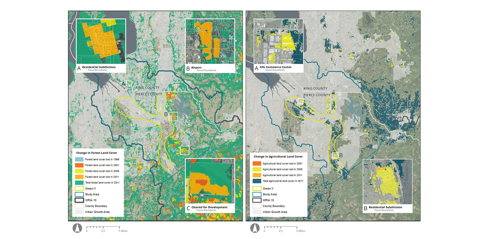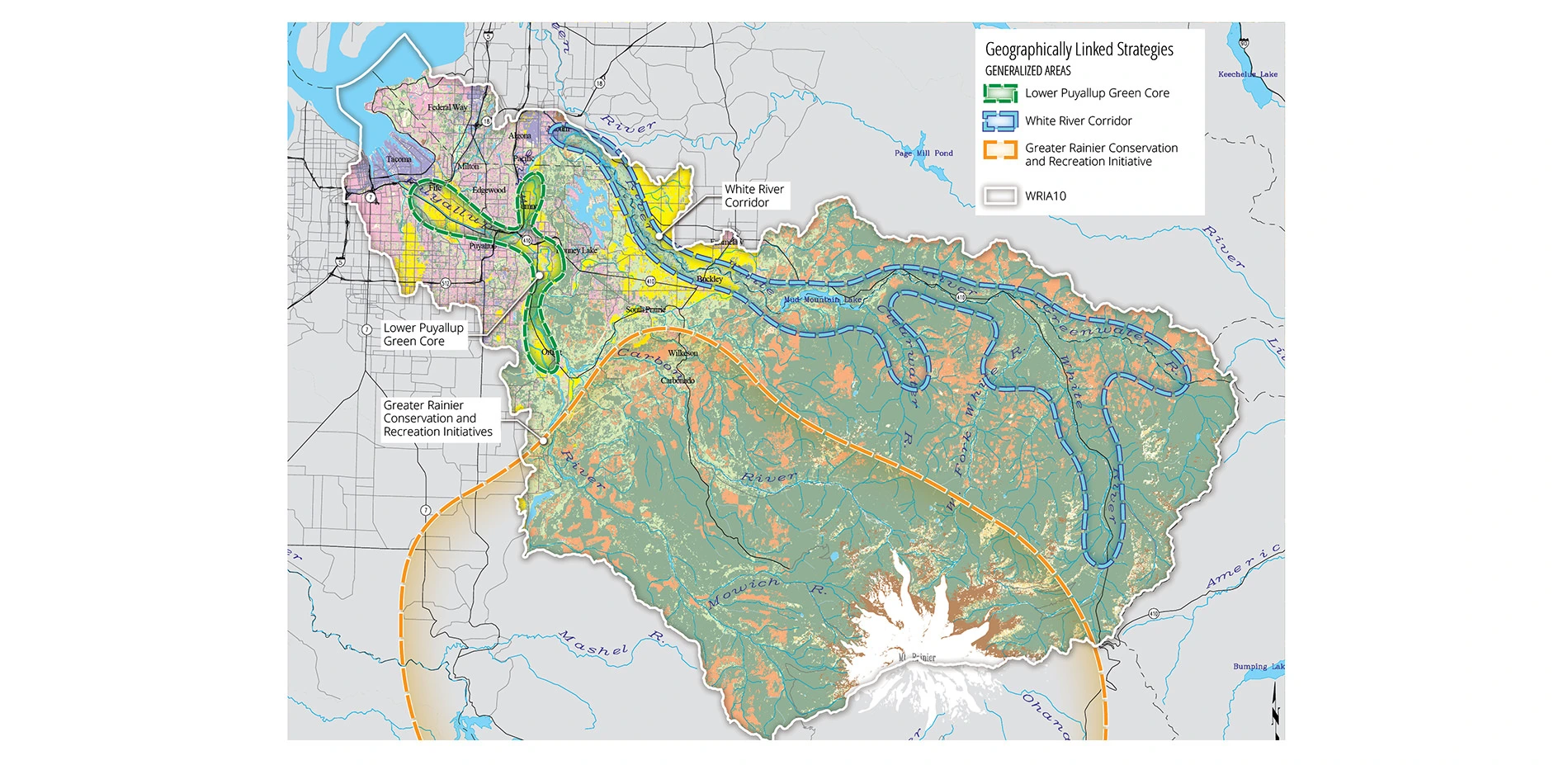 The first, the Puyallup-White Watershed WOSS, worked with established local “communities of interest” to identify regional trail gaps, threatened farmlands, areas of regular flooding, open space “deserts” near urban populations, and unprotected areas of highest ecological integrity. Three major integrated ideas emerged: a “Green Y” target area to capture multiple benefits of farmland preservation, trail connections, floodplain expansion and open space provision for underserved communities, currently contributing an estimated $7M to the regional economy annually in agricultural products; preservation of the White River Corridor focusing on riparian enhancement; and a “Greater Rainier Coalition” to promote conservation and expand recreation-related economic activities in the communities surrounding Mount Rainier.