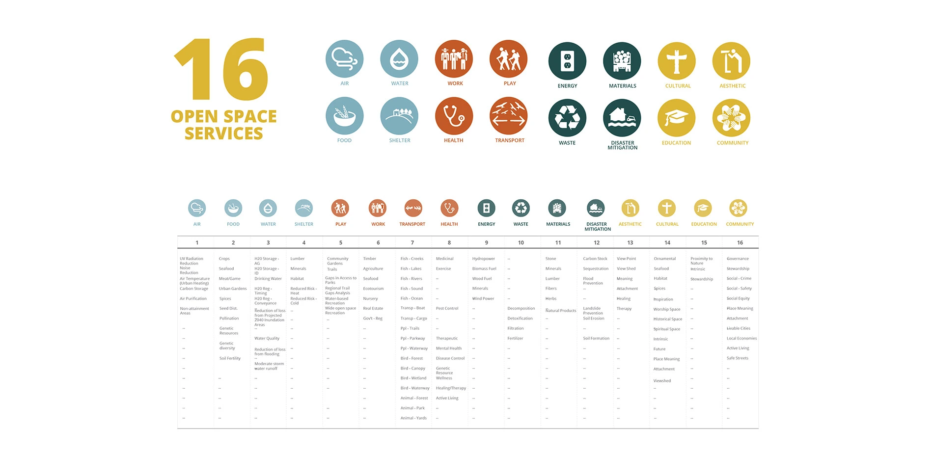 The ROSS team and its partners defined five regional challenges for which open space could contribute solutions: biodiversity conservation; climate change; social equity; health; and economic vibrancy. We convened expert task forces to develop “green” papers documenting the role of open space in addressing each of these regional challenges, posted on the project’s website. The team identified sixteen categories of “open space services,” adapted from the traditional ecosystem services rubric, to provide a valuation format that better incorporates social and cultural benefits. Using this framework, staff worked with economists to quantify the economic value of the 4-county region’s existing open spaces. The model indicates the contribution of open spaces to the economy of between $11- $25 billion annually, and with an asset value of approximately $825 billion. The team and partners created a prototype of an interactive GIS web tool to model and convey the open space services delivered by the region’s landscapes, including their relevance to addressing the five regional challenges; the full tool buildout is currently in process and is expected to be freely available in the fall, to inform open space conservation and enhancement scenarios and decision-making.