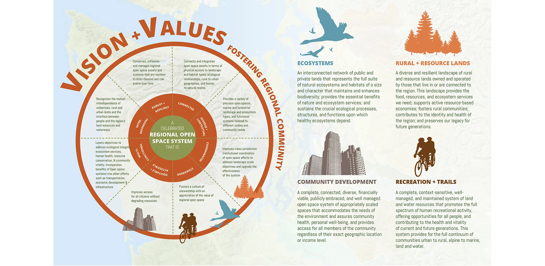 For the past five years, the ROSS has advanced an all-embracing definition of “open space,” incorporating recreational spaces and trails, healthy ecosystems, working landscapes such as farms and forests, and community parks and open space amenities. The project began with development of a “Preliminary Comprehensive Strategy,” which engaged over 100 stakeholder representatives to identify the desired qualities of a regional green infrastructure system and to create a process roadmap for establishing such a system. That plan recommended working with communities at the scale of individual river watersheds contributing to Puget Sound, while simultaneously developing tools and processes to measure and emphasize regional connections and to merge visions and prioritized actions into a regional whole. The Preliminary Strategy called for an integrated spatial vision that optimizes open space benefits, applying landscape ecology and ecosystem services concepts to guide decision-making and promote open space conservation values, from urban to rural to wild.