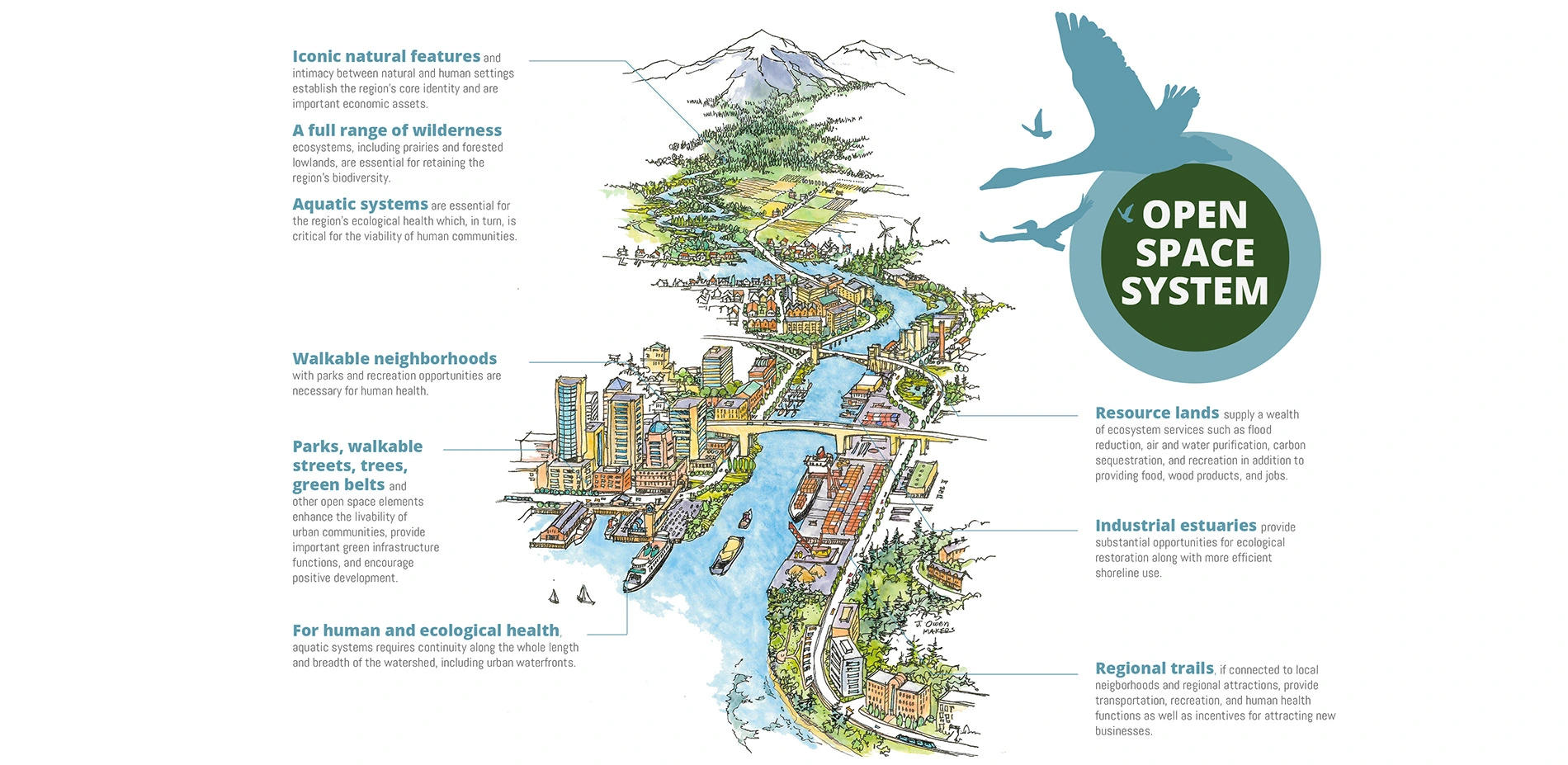 The Regional Open Space Strategy (ROSS) is a collaborative effort led by landscape architects and planners to integrate and elevate the many activities underway to conserve and enhance the ecological, economic, and cultural vitality of the Central Puget Sound region. With a collective, integrated vision and coordinated system, planners and decision-makers will be able to consider actions in light of their regional significance and priority, potentially drawing greater investment to the region’s infrastructure, and more efficiently use available resources. Accounting for the full values that open spaces yield will recognize multi-benefit potential and inform landscape planning and investment.To achieve this, the ROSS adopted four primary goals: