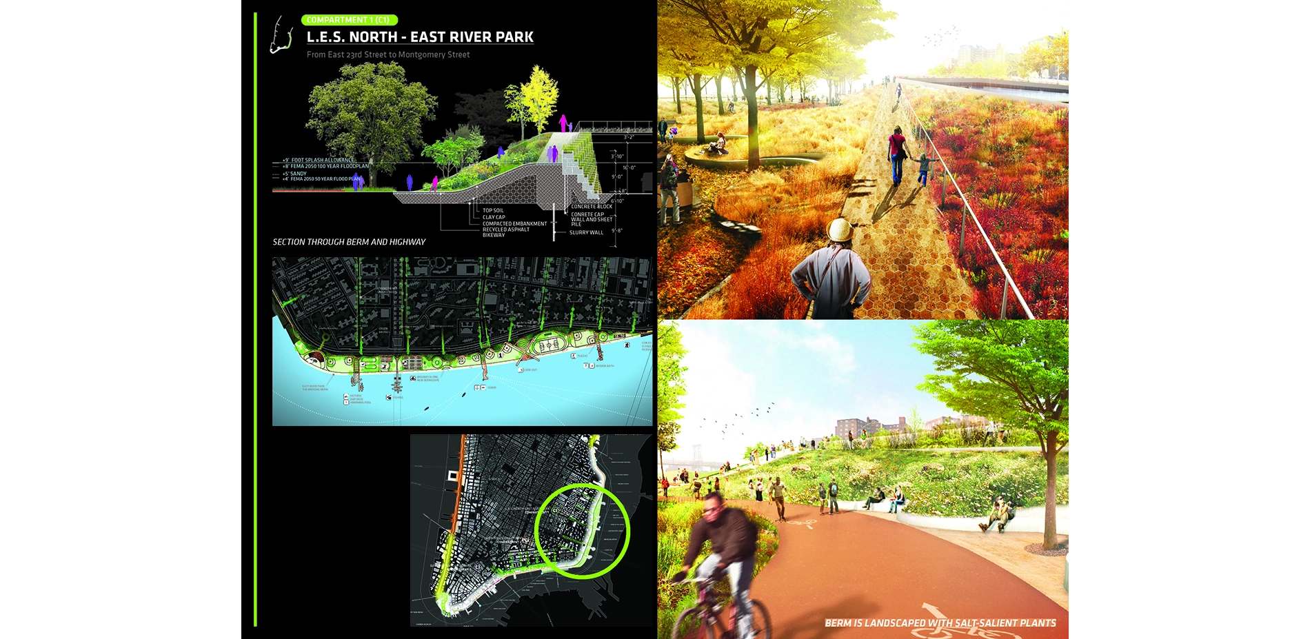 The BIG U comprises a sequence of contiguous compartments that protect a series of topographically discrete flood zones; together these compartments form a shield that will enable New York to thrive in the face of climate change. Protective interventions, design choices, and amenities in each compartment are tailored to the needs, desires, and character of the coastal neighborhoods protected. Compartmentalization allows for incremental project implementation and financing, and preserves the function of the overall protective system should any individual section fail. For Rebuild by Design, the BIG U focused on three compartments hardest hit by Hurricane Sandy: C1, from 23rd Street through East River Park to Montgomery Street; C2, which encompasses the area between the Brooklyn and Manhattan bridges; and C3, which extends south from the Brooklyn Bridge to The Battery.
