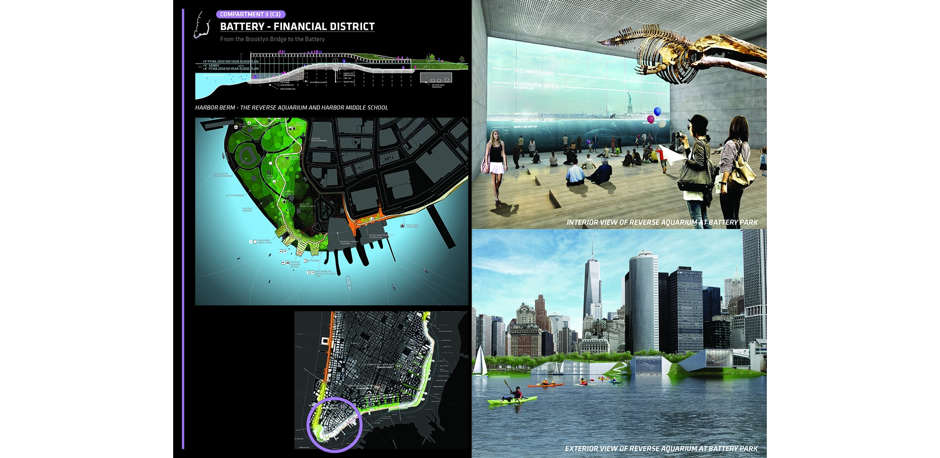 C3 is an area of profound economic and cultural importance to the city and the nation. A new landscape of berms and integrated cultural facilities in The Battery re-invigorates one of the country’s most iconic open spaces, while protecting its preeminent financial center. Beneath the FDR Drive, deployable barriers coupled with low walls and berms create a multi-layered storm defense system that shelters the surrounding community and shields essential infrastructure. The landscape architect leveraged downtown connections to assemble a coalition of diverse property owners, including commercial entities, nonprofits, public parks, and the Coast Guard, to move the project forward.