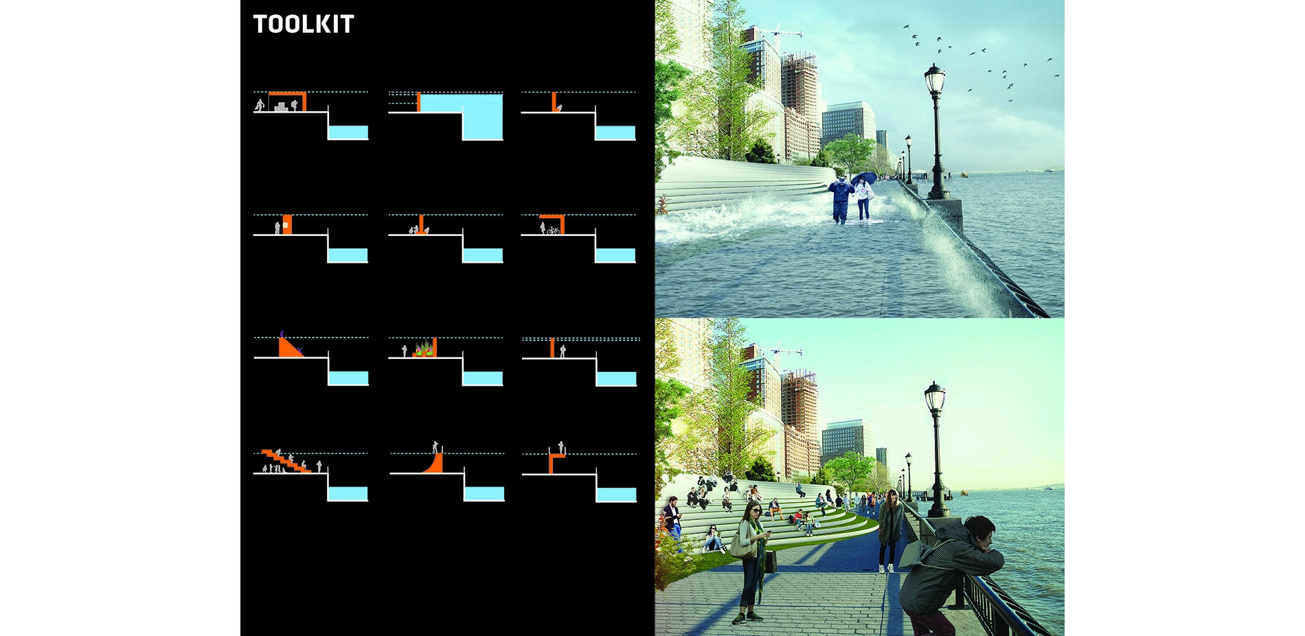 These toolkits reveal the BIG U’s essential replicability. The proposed designs are not only a thoughtful response tailored to Lower East Side and Downtown communities, but a flexible menu of solutions and approaches that can apply around the world. From Bangkok to Venice, Dhaka to Miami, at-risk cities and coastal areas are investigating defenses to protect millions of people and key infrastructure from the effects of global warming. The BIG U’s segments embody a catalog of adaptive strategies that can be applied at myriad physical scales in other waterfront communities. Moreover, its thesis, that protection should enhance communities not only physically but also ecologically, economically, and socially, stands to redefine designers’ and policymakers’ approach to resilience and sustainability worldwide. -