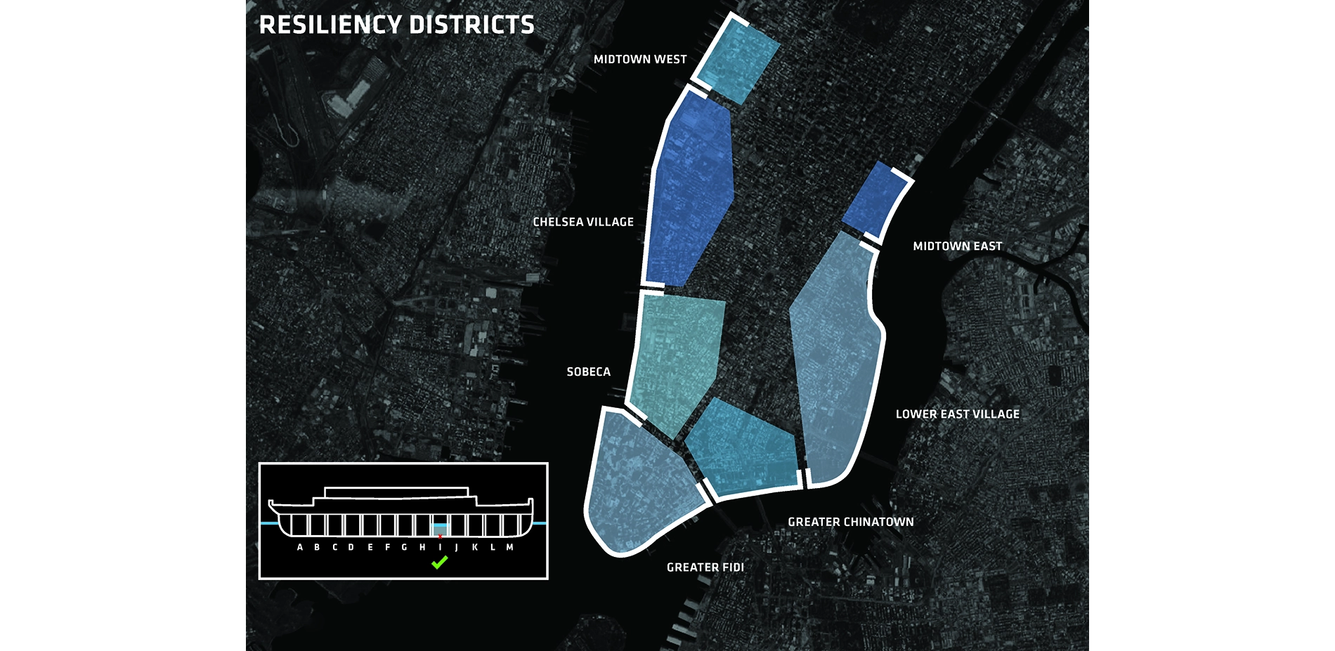 The BIG U wraps the coast of Manhattan from West 54th Street to East 40th in a ribbon of protective landscapes that defend neighborhoods from storms and sea level rise while providing locally-needed cultural, recreational, and socio-economic benefits.