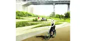In C1, a 15-foot continuous, undulating berm delineates a new topography for East River Park that safeguards the FDR Drive and upland neighbors. New pedestrian circulation routes, a bicycle path, and frequent pedestrian bridges enhance local connection to the waterfront, erasing the barrier of the highway. Deployable street-end walls preserve traffic flow and protect the 14th Street Con Edison substation. Park programming, guided by stakeholder input, provides amenities tailored to park’s immediate neighbors, while the striking views and variegated landscapes attract visitors. Upland, the landscape architect employs bioswales and rain gardens to enhance local urban experience and create green corridors that lead to park entrances. This portion of the BIG U was awarded $335 million by the US Department of Housing and Urban Development (HUD), and will be built by 2022.