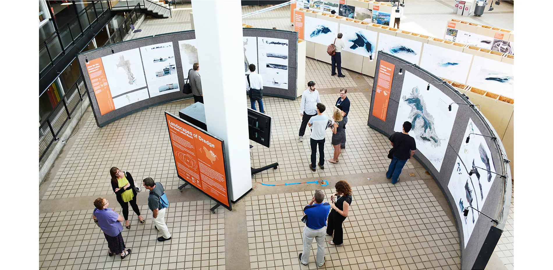 The Dredgefest exhibition offers a different, highly visual outlet to disseminate the work. Exhibitions document dredge and sediment dynamics particular to the region of study, from the operational to the ecological, and also feature also featured design work and proposals by practicing landscape architects and academics within the DredgeFest geography. While difficult to substantiate, it has been noted that the recent DredgeFest Great Lakes exhibition at the University of Minnesota was the world’s largest collection of speculative dredge design drawings ever displayed in a single venue.