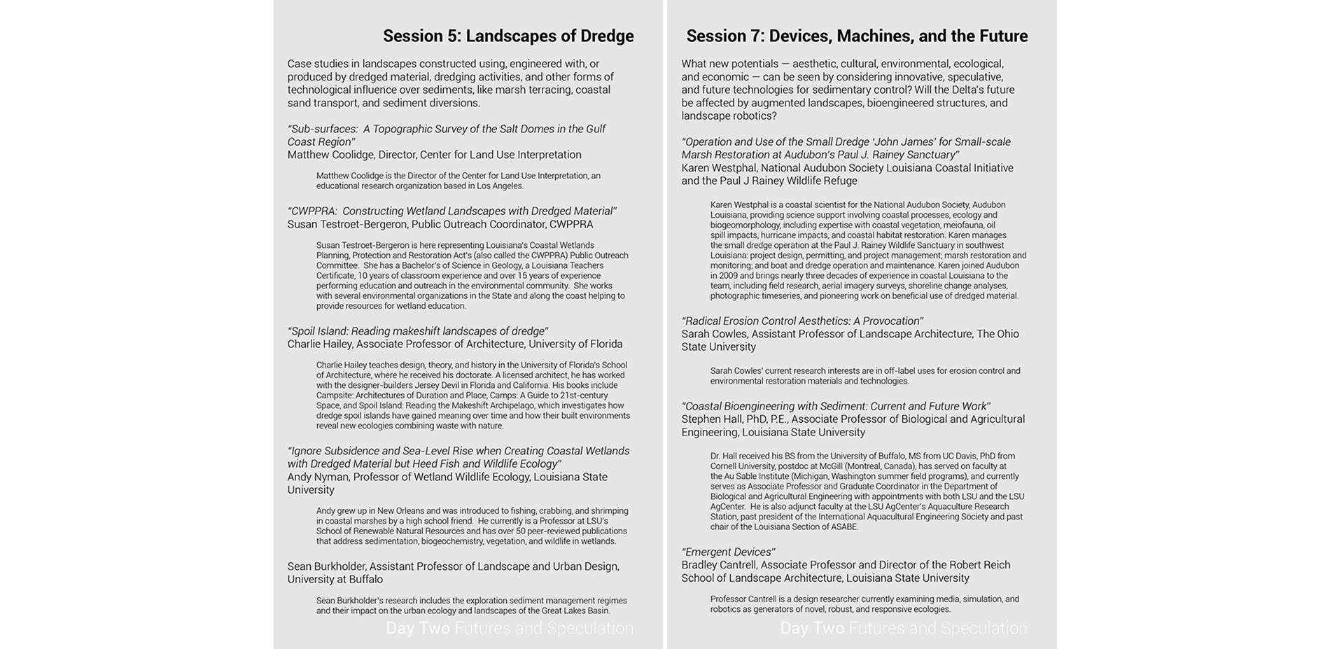 While our title is lighthearted, DredgeFest has serious ambitions. DredgeFest events recognize that the anthropogenic manipulation of sediment and sedimentary processes are environmental and infrastructural practices of utmost importance, engaging issues of climate change, resiliency, ecological health, and economics. While earth and soil are a core substrate for designers, landscape architects are noticeably absent from the dialogues that shape larger systems of sediment management. From erosion control to navigational channel design, Dredge Fest events explore the expanding role of landscape architects in creating dynamic and adaptive sediment infrastructure for the future. -