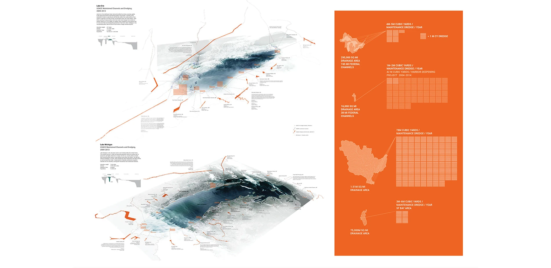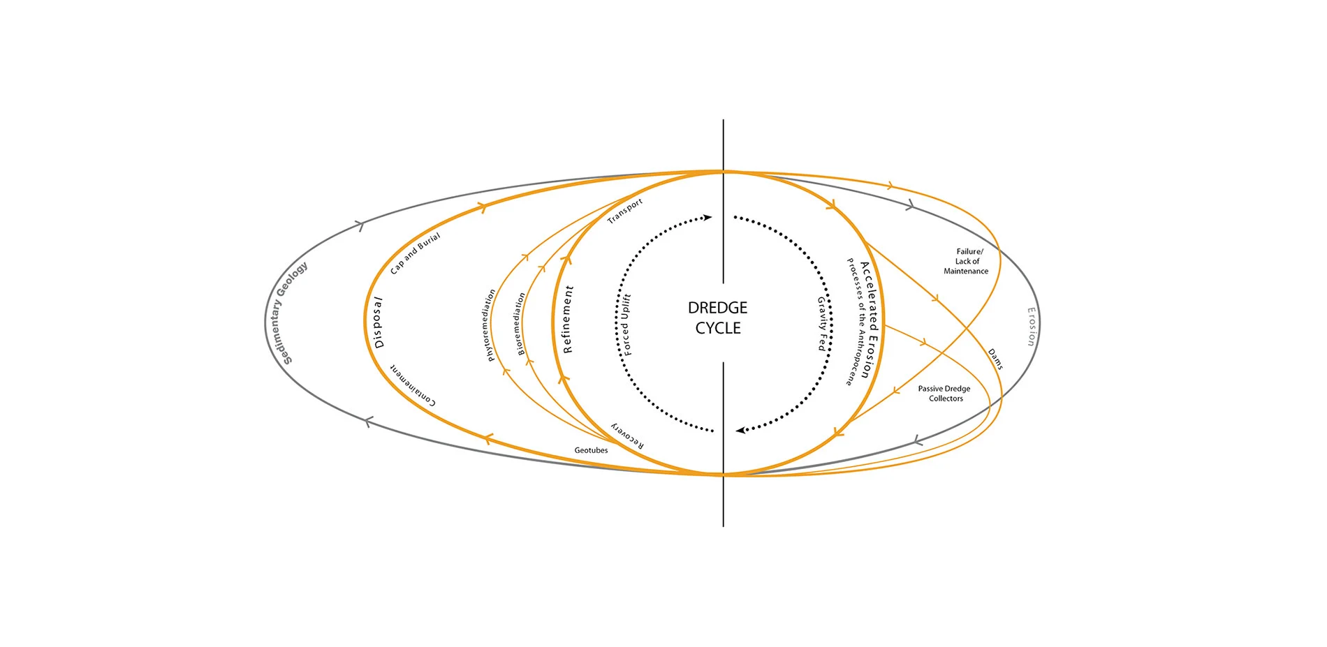 It's time more people talked about dredge. The techniques of dredging—and the galaxy of technologies that surround it—constitute perhaps the greatest unrecognized landscape architecture project in the world. Dredge shapes our beaches and waterways, it plays a key role in global shipping networks and in coastal real estate. Silt is scooped from sea floors to deepen underwater highways for container ships, it is diverted from river basins to control flood-prone urban waterways, it is collected, sorted, managed, and moved to cap and treat contaminated grounds. Anthropogenic action now moves more sediment annually than geologic and natural processes—yet this reshaping of the earth's surface is invisible to the average observer, and under-explored in contemporary design practice.