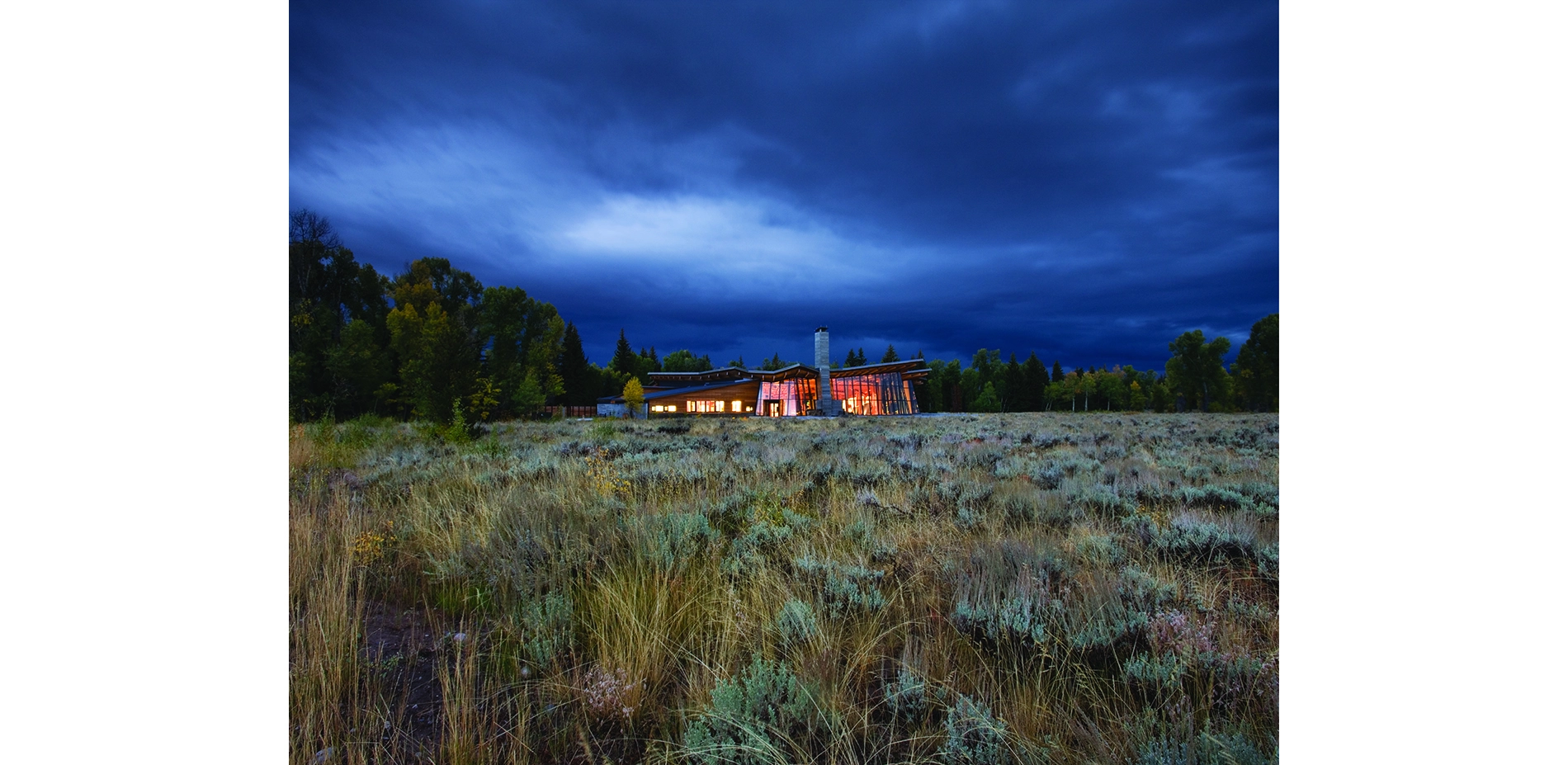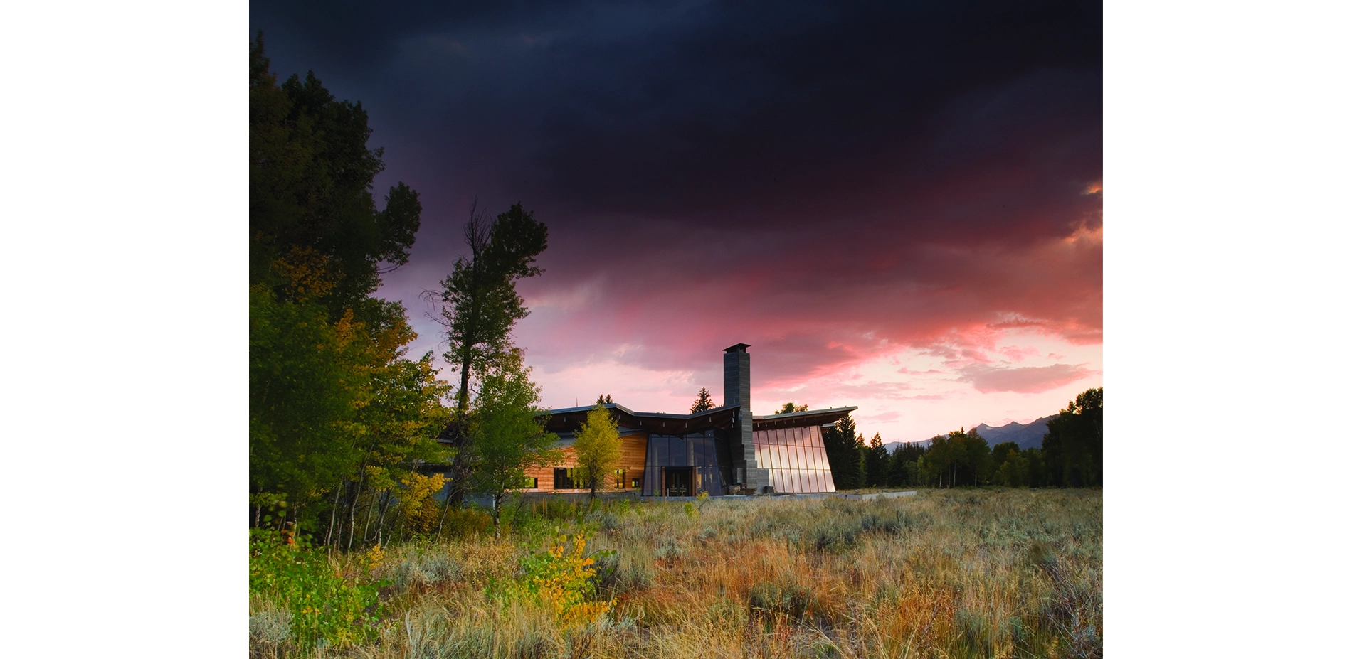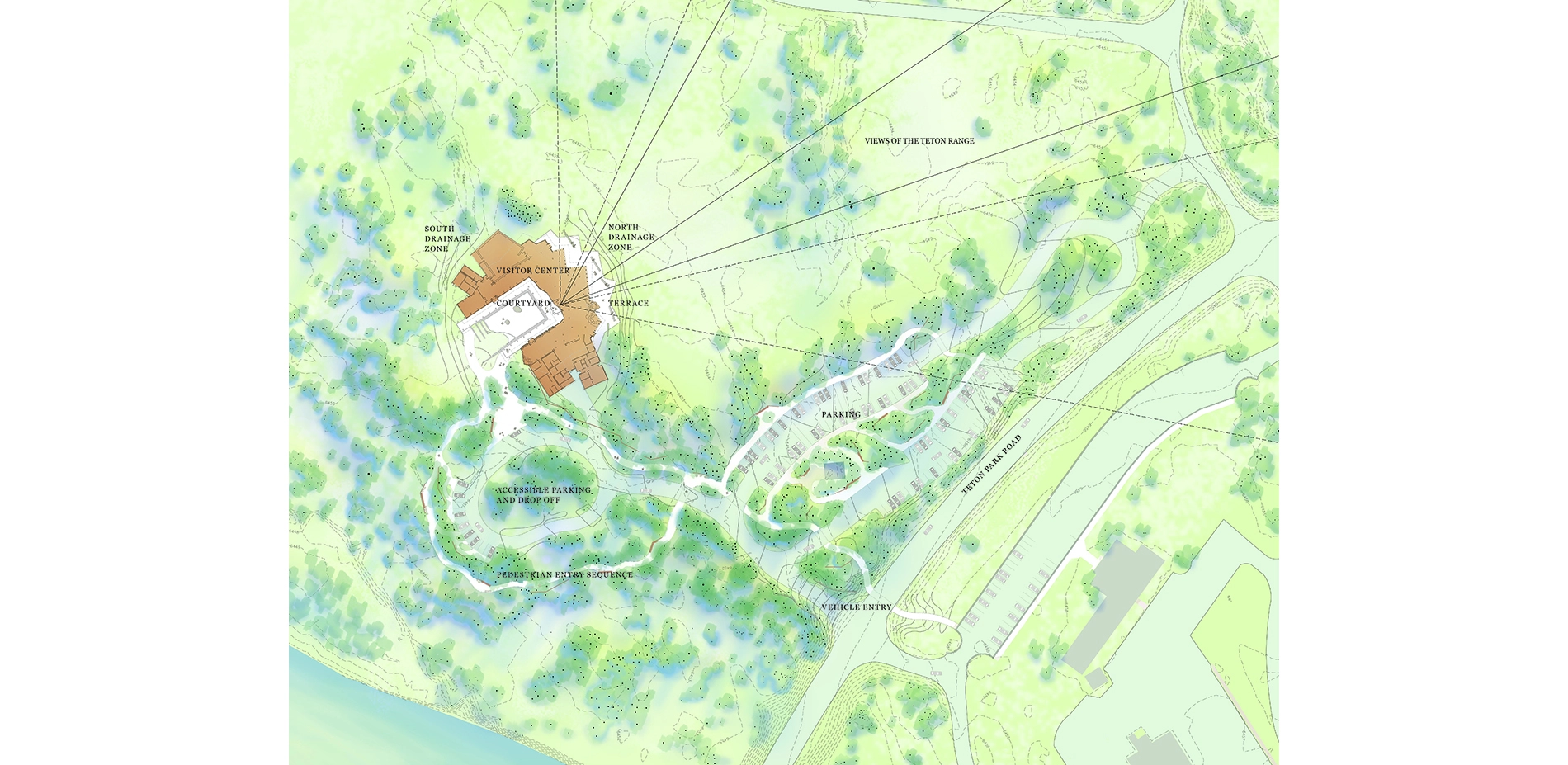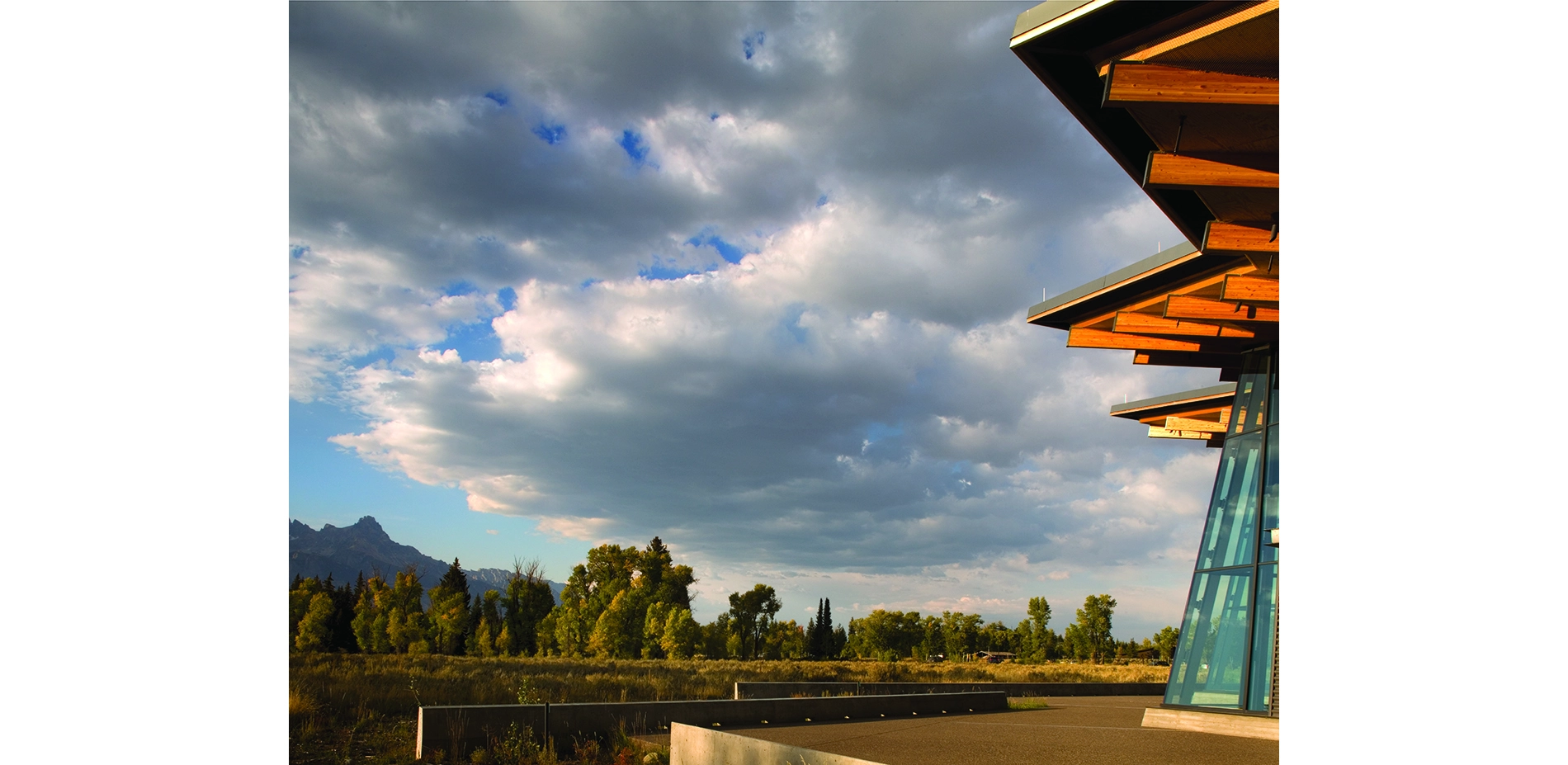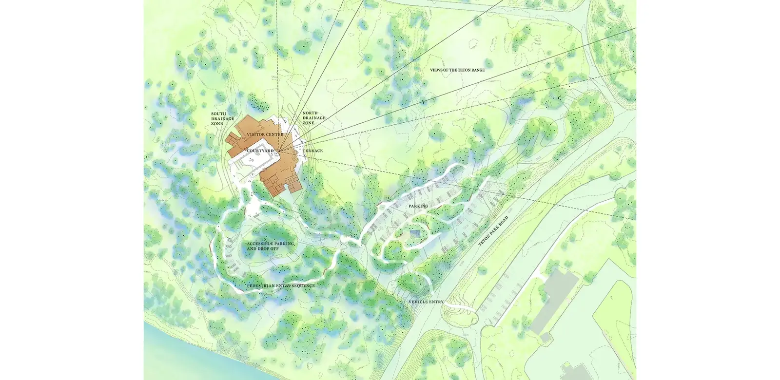 Located near Moose, Wyoming at the Grand Teton National Park’s southern entry, the Craig Thomas Discovery and Visitor Center rests between two dramatic and powerful forces: the Snake River and the Teton Mountains. Former flooding created subtle, undulating landforms that fan out through the site. Native vegetation reveals, frames, or blocks views of the Teton Range. The 12-acre site also lies at the edge of a sagebrush meadow within a riparian forest of aspen, cottonwood, and spruce. Bands of aspen, cottonwood, and spruce trees create zones with distinct character, sensory quality, and ecological function.