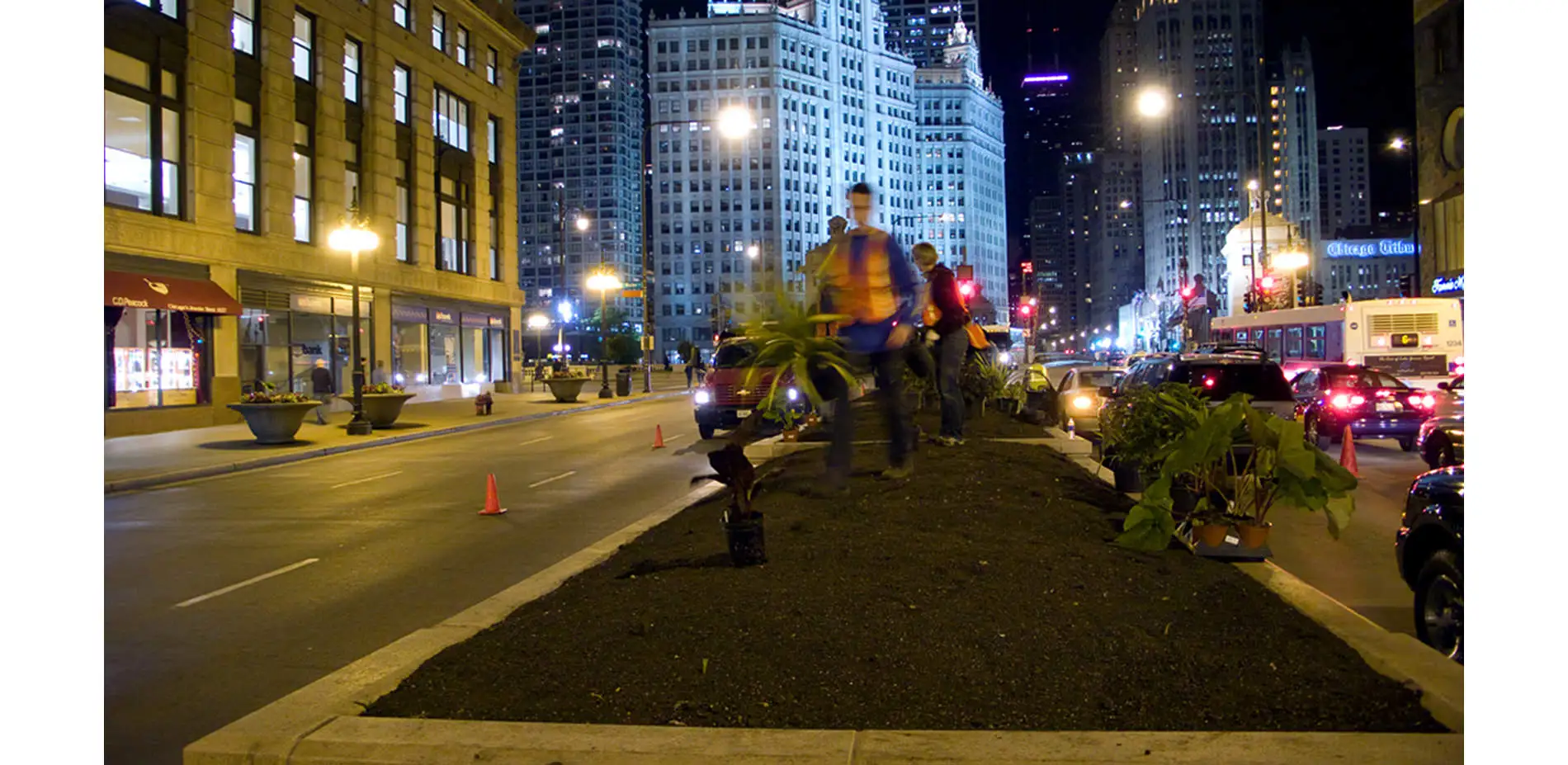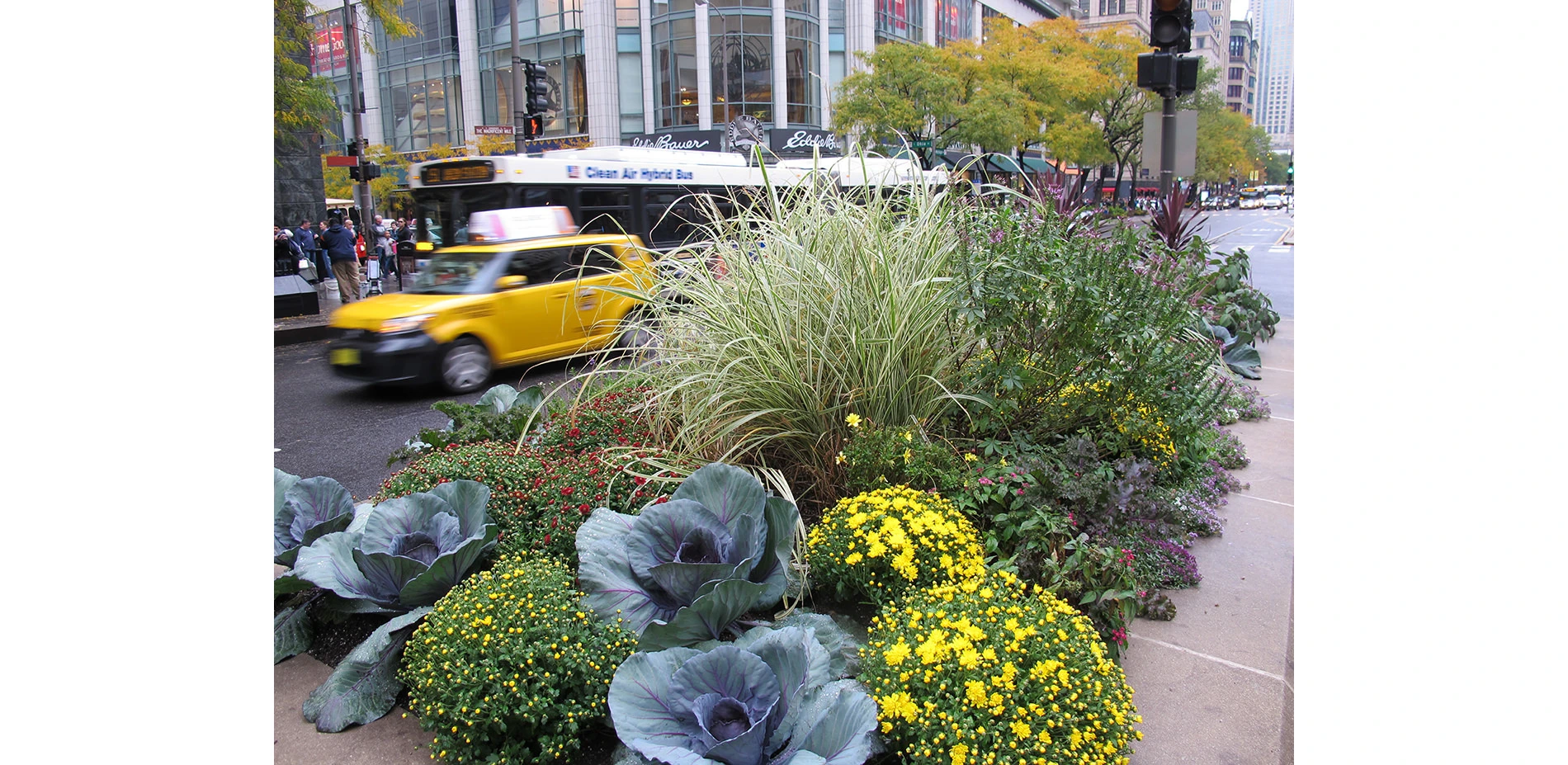Selecting plants was a challenge in and of itself: varietals would have to be hardy so they could endure the harsh climate, pollutants, and traffic found on the street and remain beautiful with very little maintenance. This required picking a precise mix of plants and laying out a planting scheme that could easily adapt to changing conditions without sacrificing visual appeal or increasing costs.