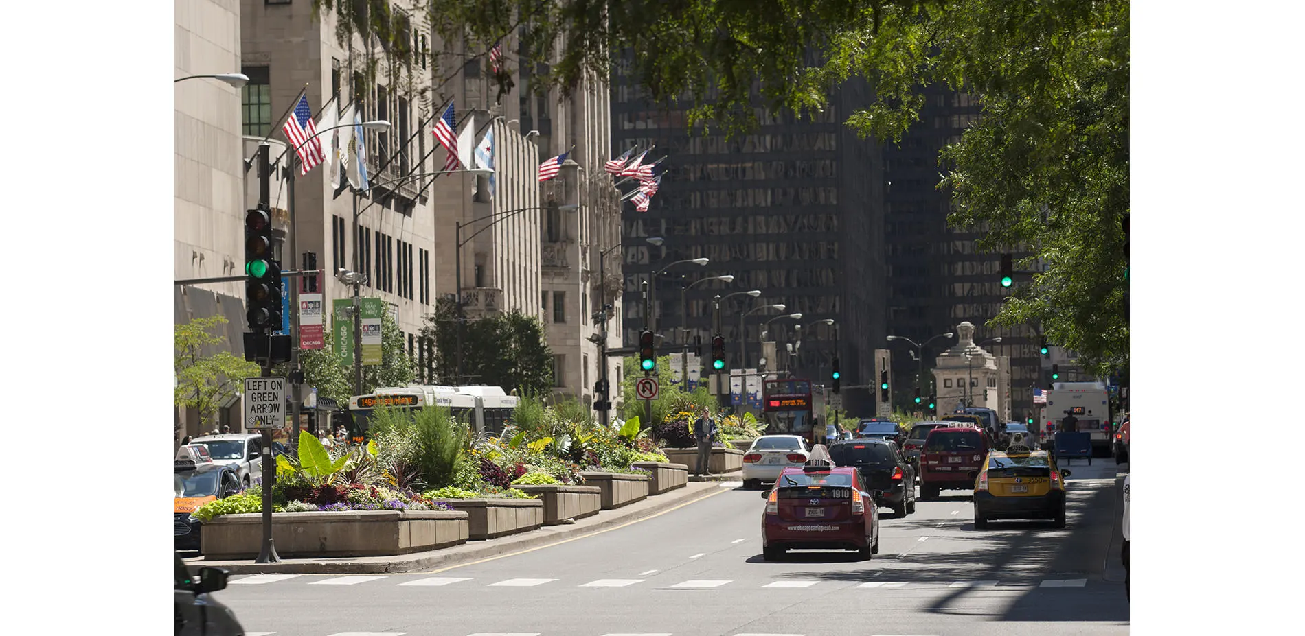 From its outset, the Michigan Avenue Streetscape project pursued a clear goal: make Michigan Avenue a beautiful public place via interesting-yet-pragmatic landscape design. This kind of landscape was lacking in Chicago—and cities across the United States—and Mayor Daley and the Michigan Avenue Streetscape Association (formed to oversee the implementation of the project) understood that greening the city would bring both intangible and tangible value. This was especially true on Michigan Avenue, one of Chicago’s most prominent streets. Not only would people want to come to Michigan Avenue if it were more beautiful, but they would want to invest in Michigan Avenue, too, in ways big and small. More people would come to shop, and real estate investors would be drawn by the street’s increasing popularity. The financial and social return on investment would far outweigh the costs to design and install the project.