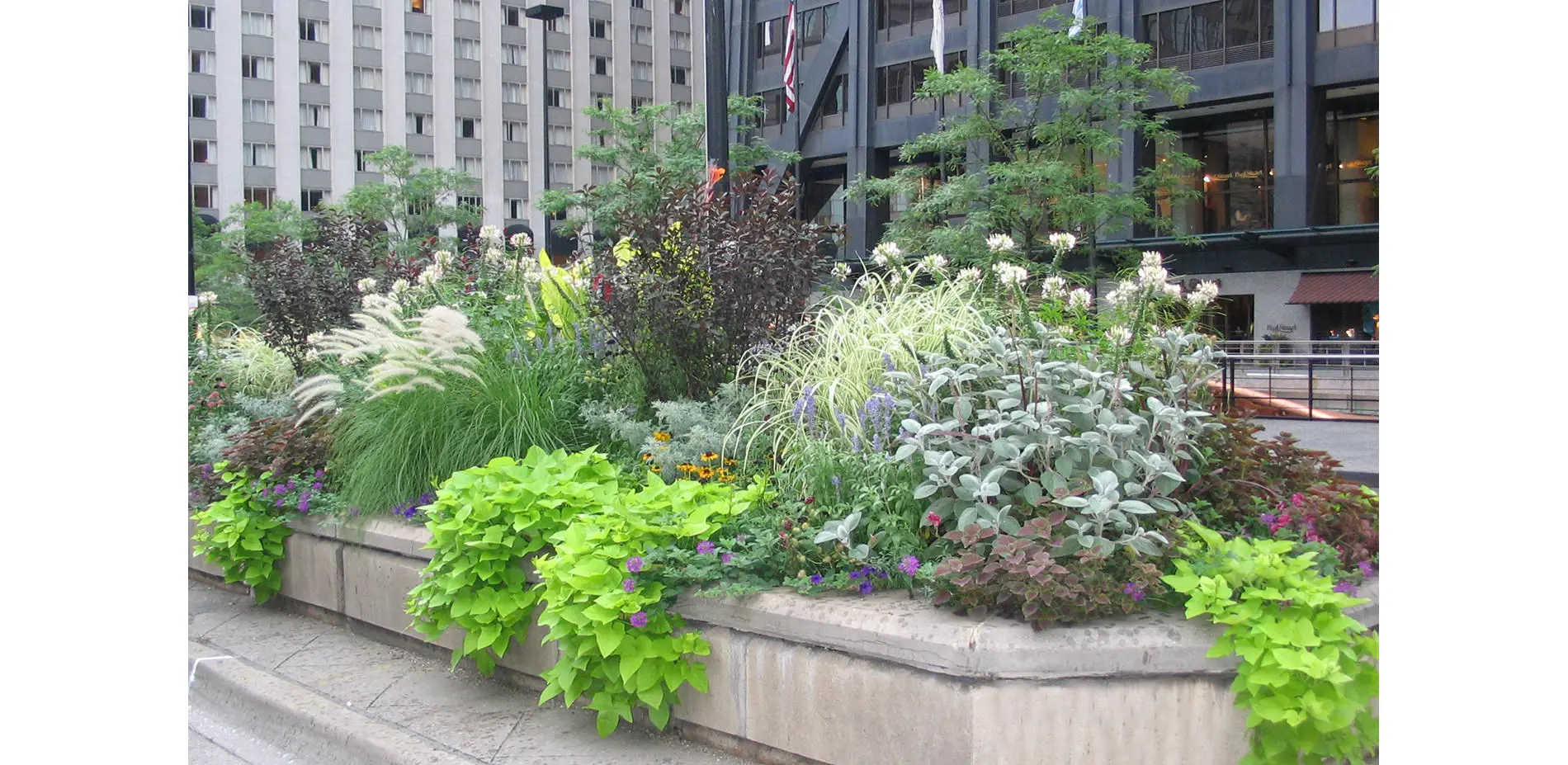 The landscape architect—the same young designer who planned and installed Crate & Barrel’s parkway planters—had to balance the competing priorities of the many different project stakeholders, devising some compromises without detracting from the project’s strong vision. Many stakeholders argued for tall trees planted along the sidewalks. However, the design architect understood that, once matured, the trees would create too dense of a hardscape that wouldn’t read as visually stunning and would also block views of the retail windows, a legitimate business concern. He also had to argue against architects who were pushing for ornate planter designs. If the planters were too complex, they would cost too much to produce and maintain, leaving little budget for the actual plantings. If the plant budget was reduced too drastically, then the project wouldn’t achieve its main goal—to create a vibrant, natural landscape that enlivened Michigan Avenue through its colors, shapes, and scales.