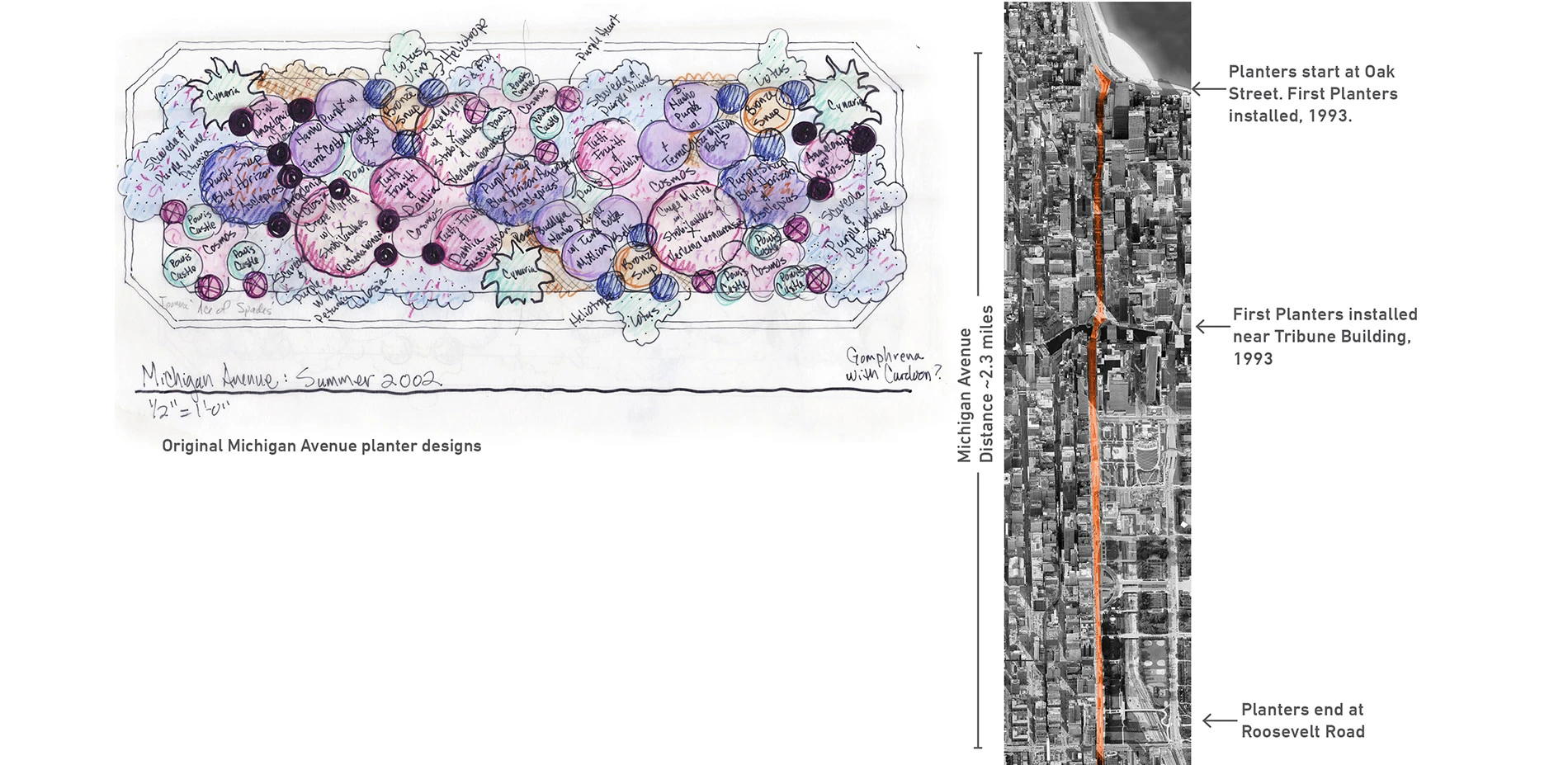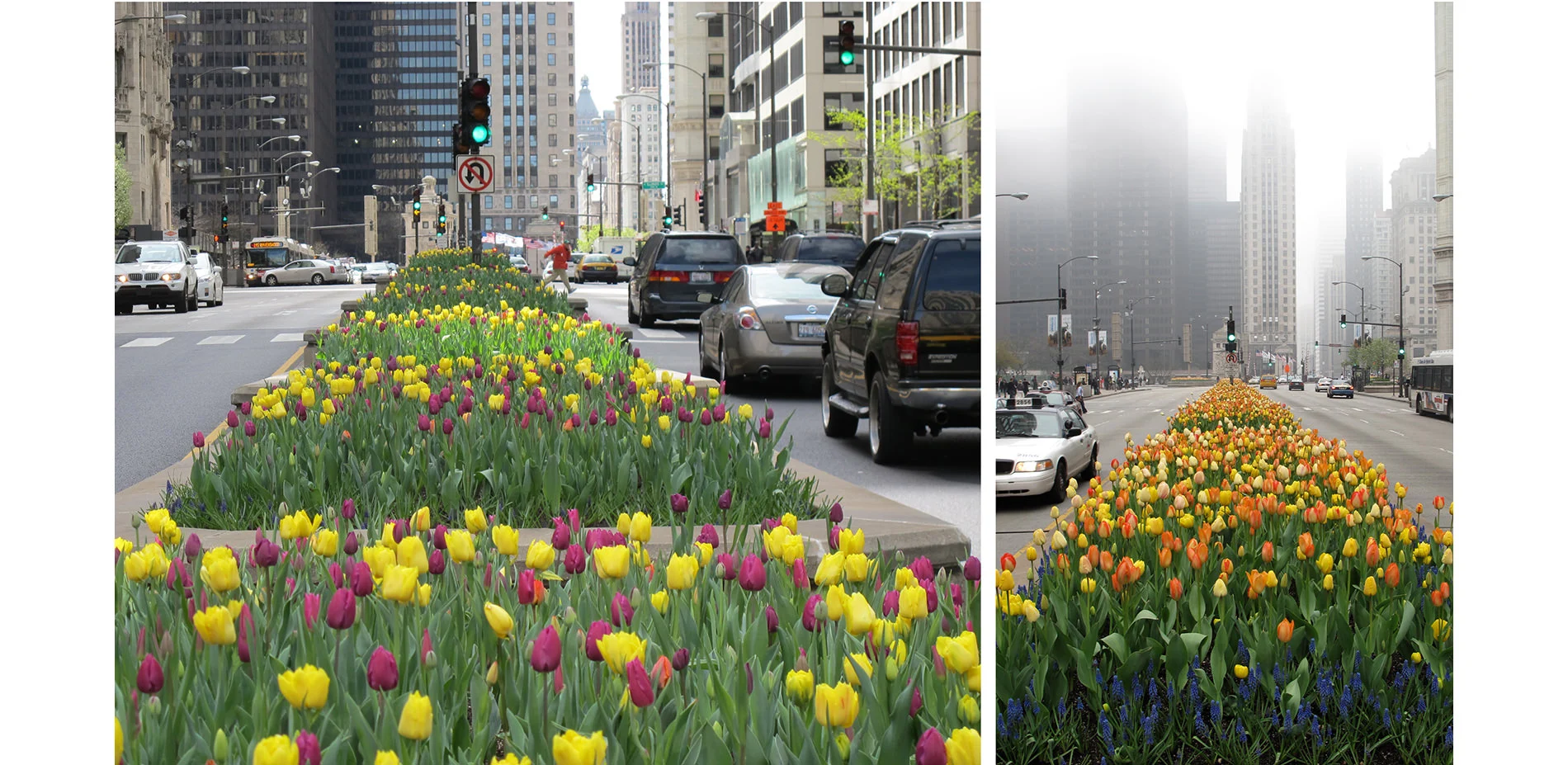From 1993 through 2013, the original landscape designer and his team developed and implemented over 60 original designs for the Michigan Avenue median planters. The overwhelmingly positive effects they have had on Chicago could not have been anticipated. Across the city, the streetscape designs have spurred both informal planting trends and formal landscape programs. Because of the project’s success, the City of Chicago has planted over 100 miles of landscaped medians in an effort to beautify more streets and neighborhoods. At the scale of the profession, the Michigan Avenue Streetscape has served as a model for similar landscape designs, inspiring installations in cities as diverse as Des Moines and Detroit. It is a project that weaves the natural and built environments together in surprising, inspiring, and unprecedented ways, year in and year out, creating a more beautiful Chicago and a more beautiful world. -