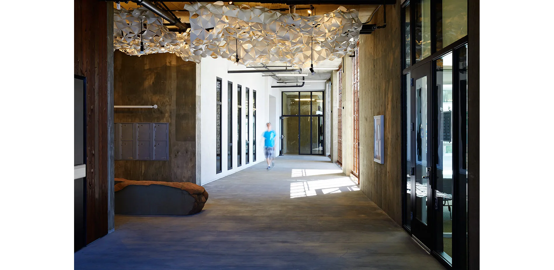 The entire building has open hallways. If you are not in your unit, you are always outside. The boulders migrate through the light, corten steel perimeter into the common areas. Local riverrocks are inlaid into the paving.