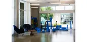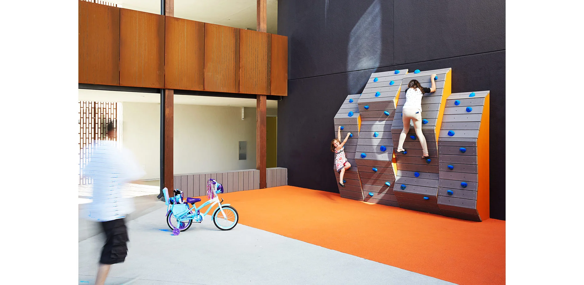 This community room opens onto a shared plaza along Bridge Street, creating a flexible, publicly accessible event space. The community room offers a TV lounge, lending library, teaching kitchen, seating nooks, and materials for play.