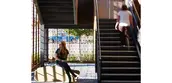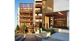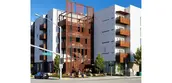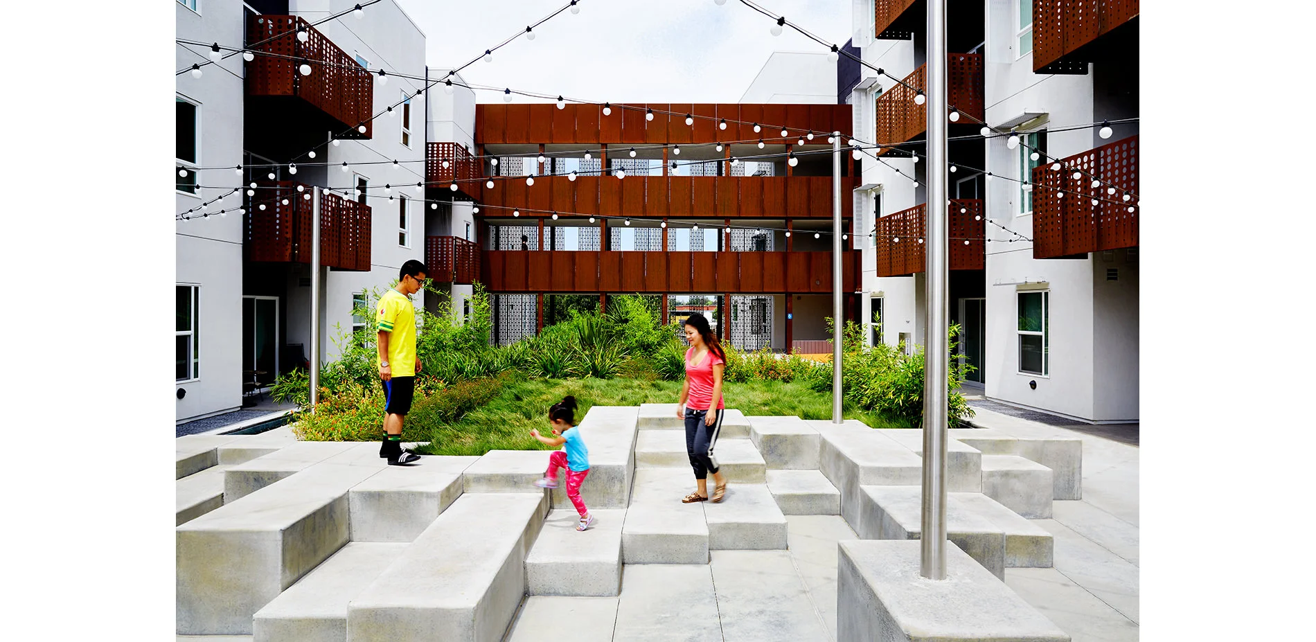 The building is divided into two residential “bars” that relate to each other across a central courtyard and are joined by open-air breezeways. Along the north façade, the building features five levels of housing, with ground-level homes that open directly onto the sidewalk via stoops.