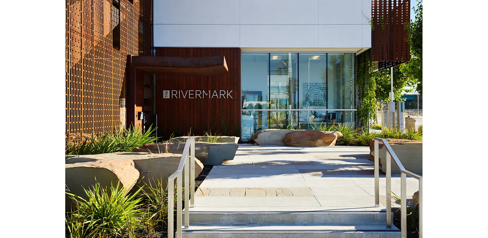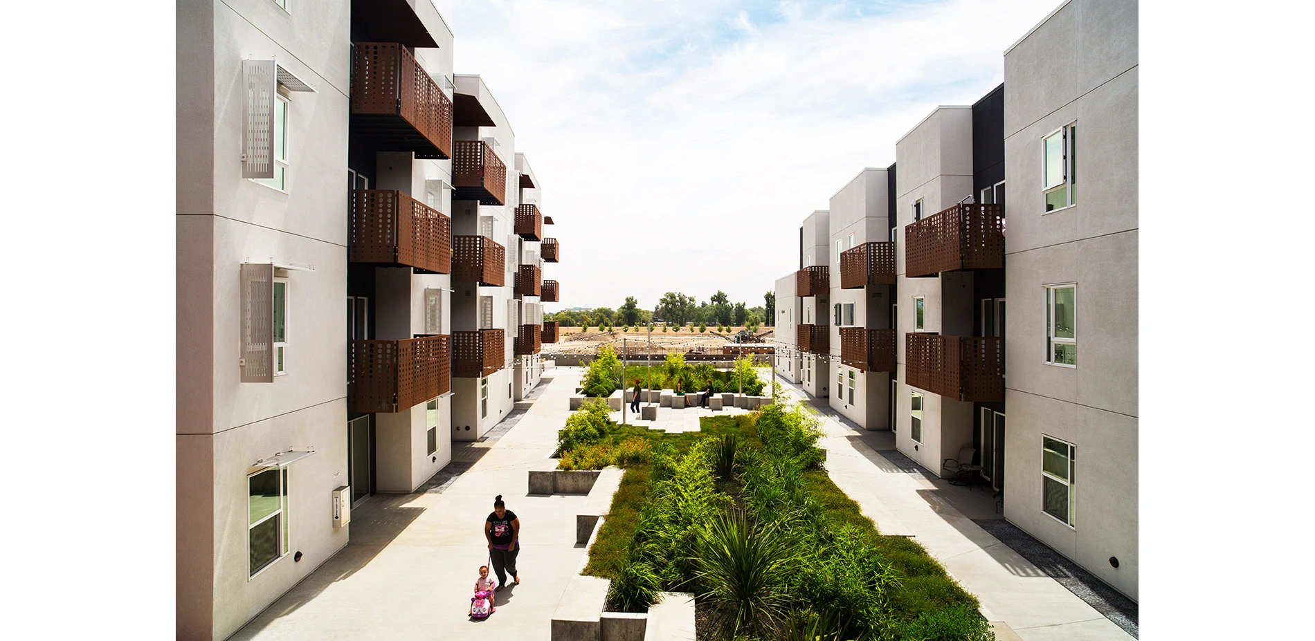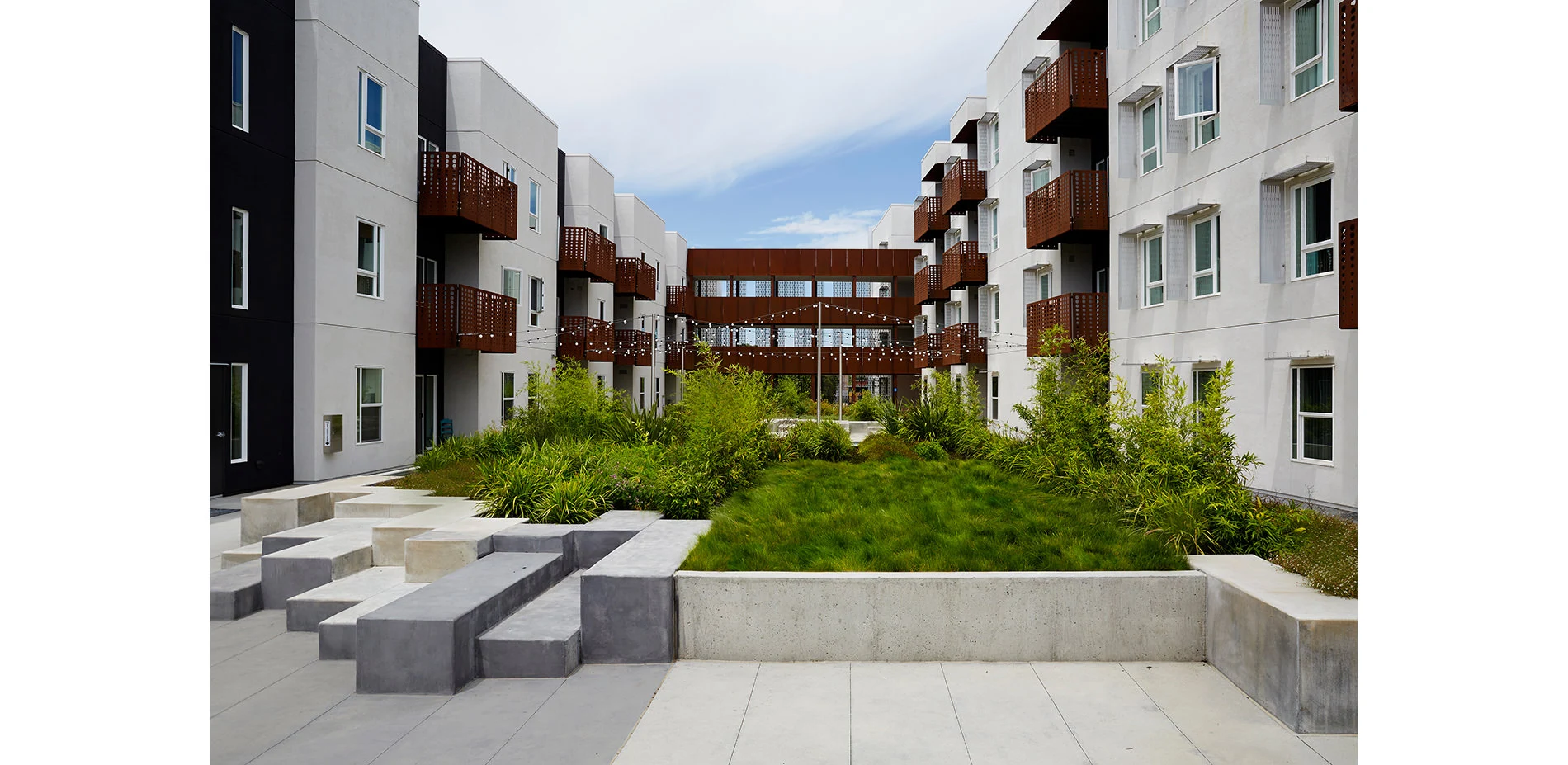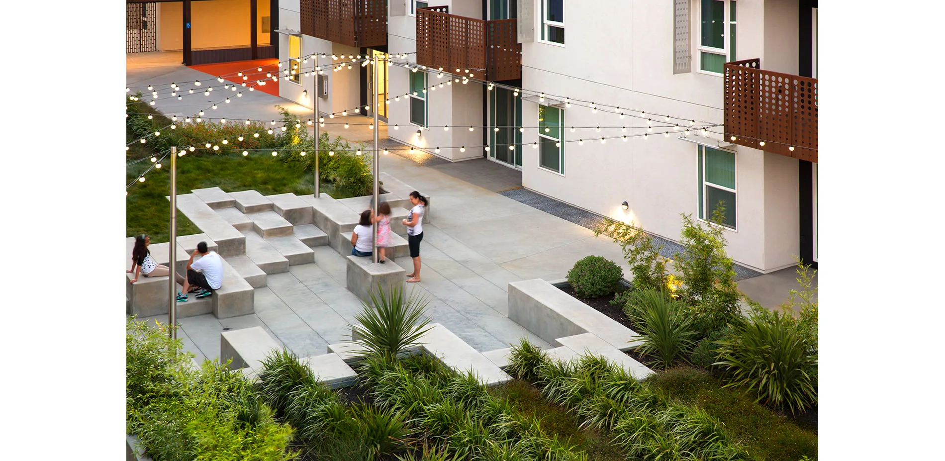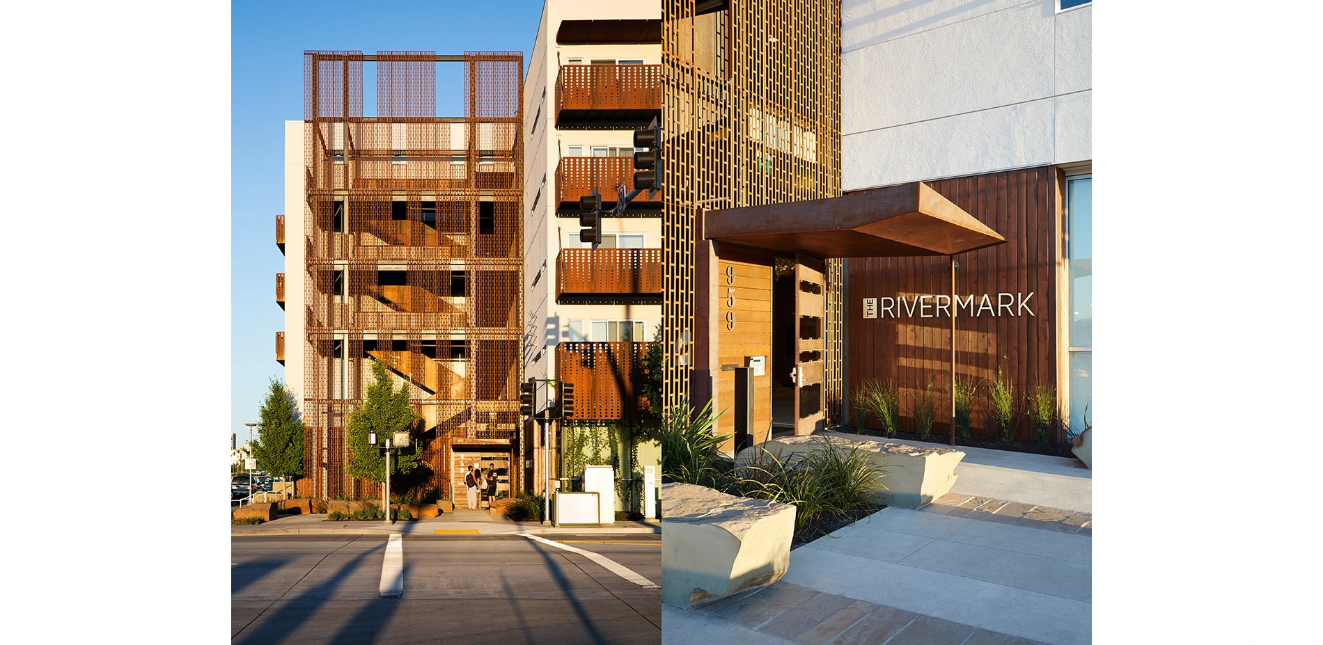 The Rivermark is located near the Sacramento River. It is a 100% affordable housing project in West Sacramento. The Landscape Architecture responds to the context of the Sierra foothill geology, and also the structures and spaces of early video game design. The design is also inspired by pioneering video games, such as Tempest, a pioneering video game that featured an exciting perspectival geometry. The project is divided into a rigorous two-foot grid, oriented on the east-west axis. Forms and materials slide and move along this grid, as if invisible tectonic "microplates" are moving along through the spaces. The landscape is a shifting of local stone boulders and concrete seatwalls that move in and out of the project breezeways, and blur exterior and interior space. One of the greatest design challenges, was in providing a high level of design, program, and material quality within the constraints of an affordable housing project budget. The project offers community garden plots, stormwater green infrastructures, a climbing wall, raised meadows, a public art installation and public plazas.
