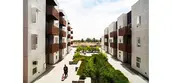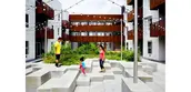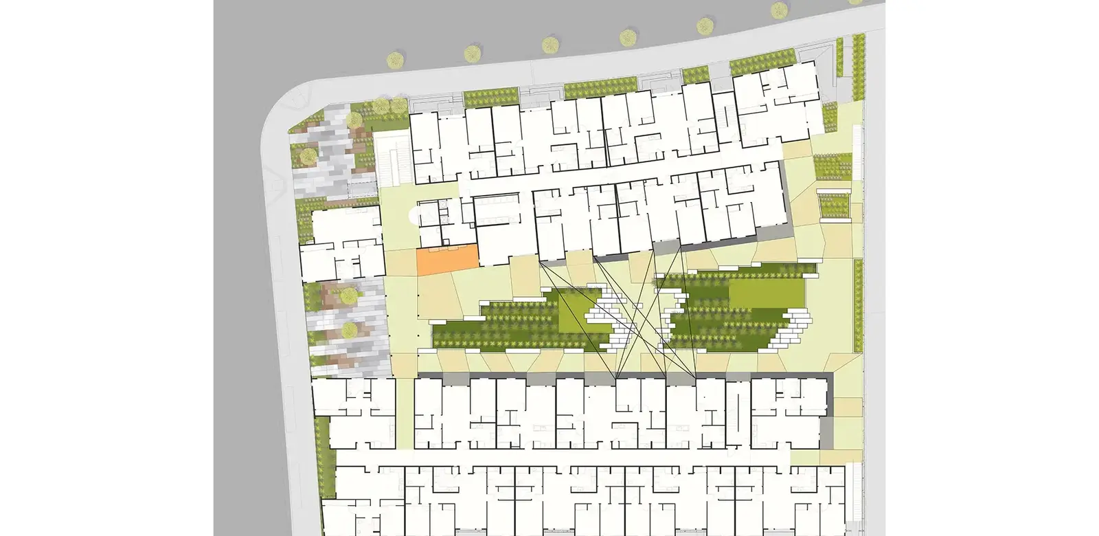 The Central Court includes two meadows, garden plots (at the rear), a climbing wall and three plazas. The plantings at the podium reference the diverse agriculture surrounding the site and are arranged in rows on a strict axis. Balconies, decks, and patios surround the Court, creating a continuum of private to public space.
