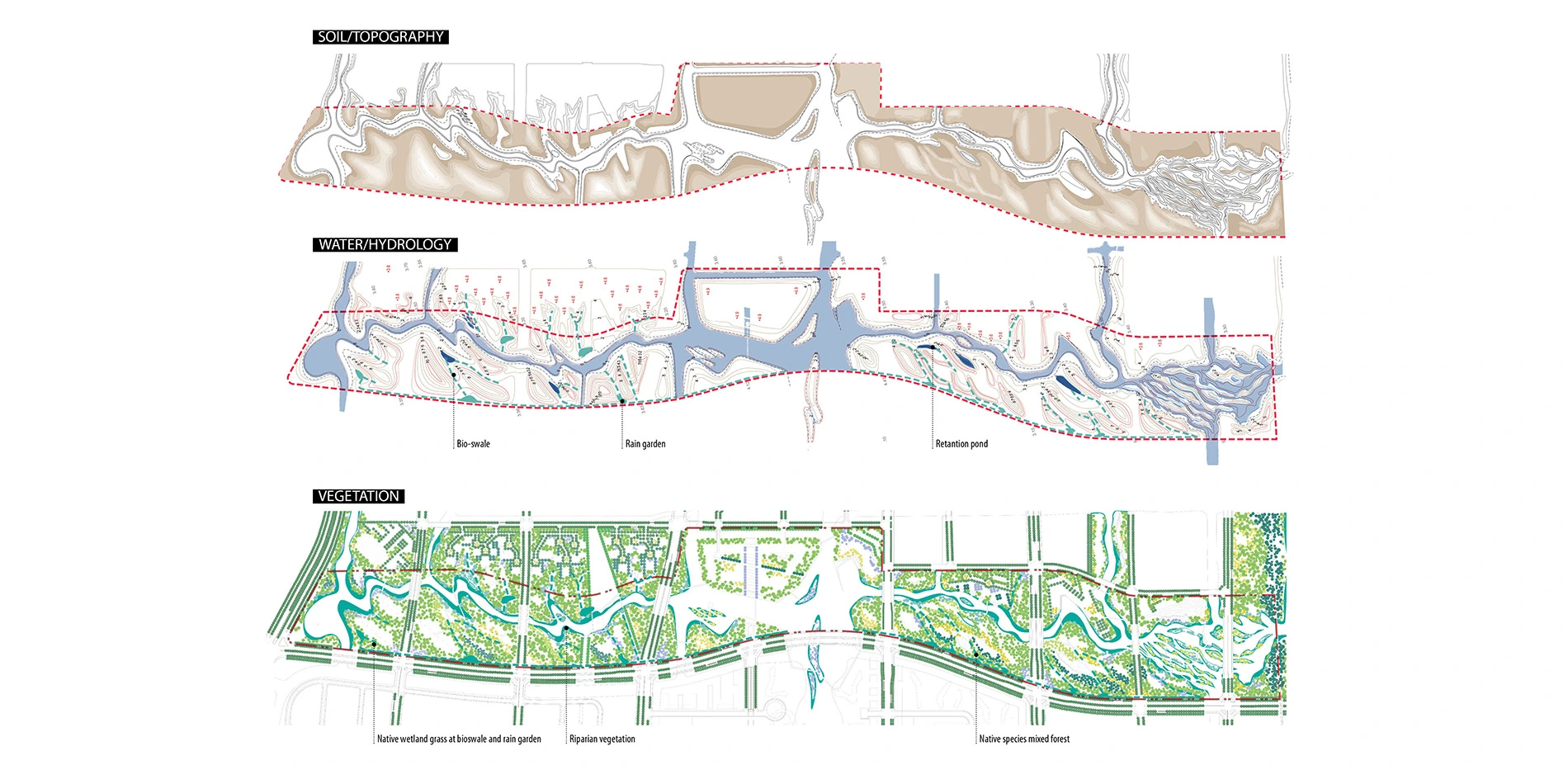 - Hydrology: Replacing the existing system of dead-end and disconnected canals is a new meandering water course, with series of free-flowing rivulets, streams, ponds, and marshland that will support the re-establishment of the indigenous ecology. The newly constructed watercourse improves the quality of the canal water and makes it suitable for ecological restoration and recreational use.