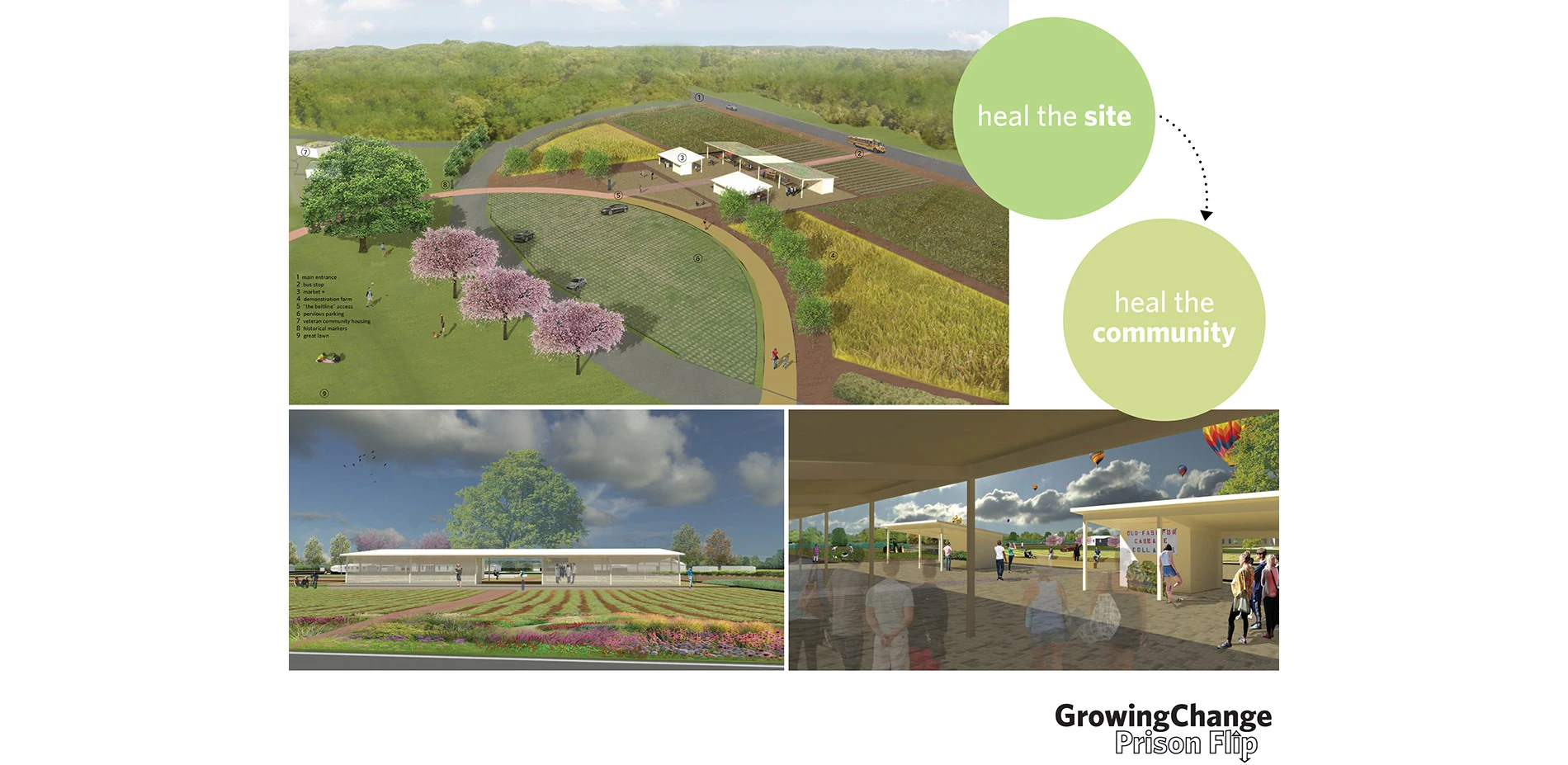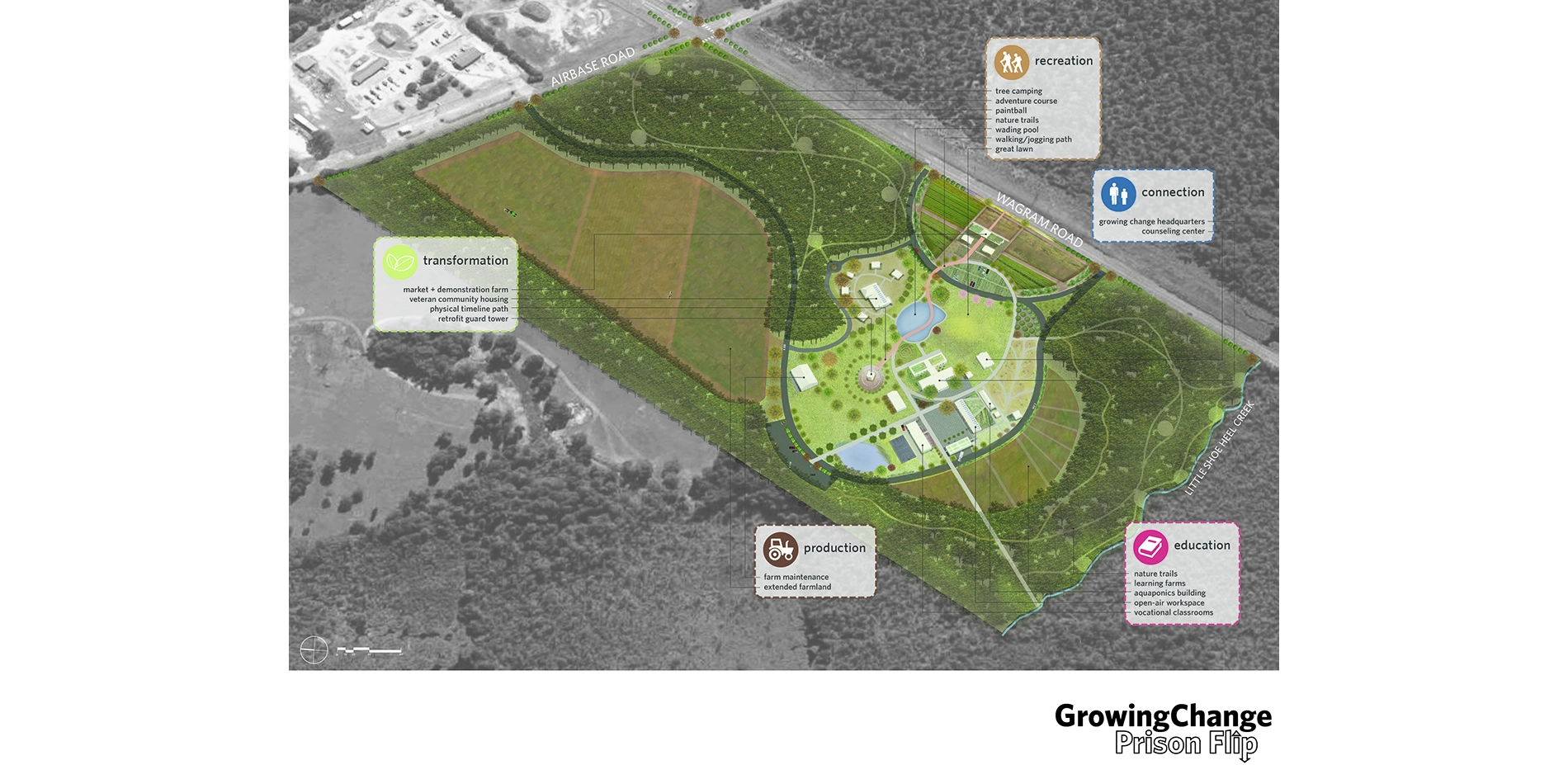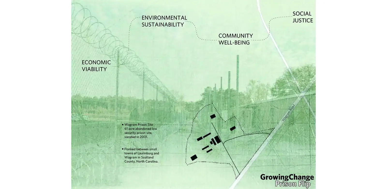 Recent pressing societal challenges present the importance of working in rural areas to create environmentally, socially, and economically sustainable communities. Student design teams in partnership with the youth empowered non-profit organization, GrowingChange addressed unique challenges existing in Scotland County, North Carolina, such as an increasing number of underutilized brownfield properties; an escalating number of youth falling into the justice system; a lack of job opportunities for returning veterans; inadequate opportunities for workforce training; limited access to sustainably grown local food; and a rising number of health concerns. The student design teams created master plans that aimed to flip and enhance the prison's landscape. Building upon the participatory engagement model, students developed and facilitated community design workshops in partnership with the GrowingChange, institutional organizations, faith communities, and local residents. Proposed design scenarios have already empowered GrowingChange to raise funds and promote a model to be implemented internationally for decommissioned, brownfield prison sites into new community building functions.