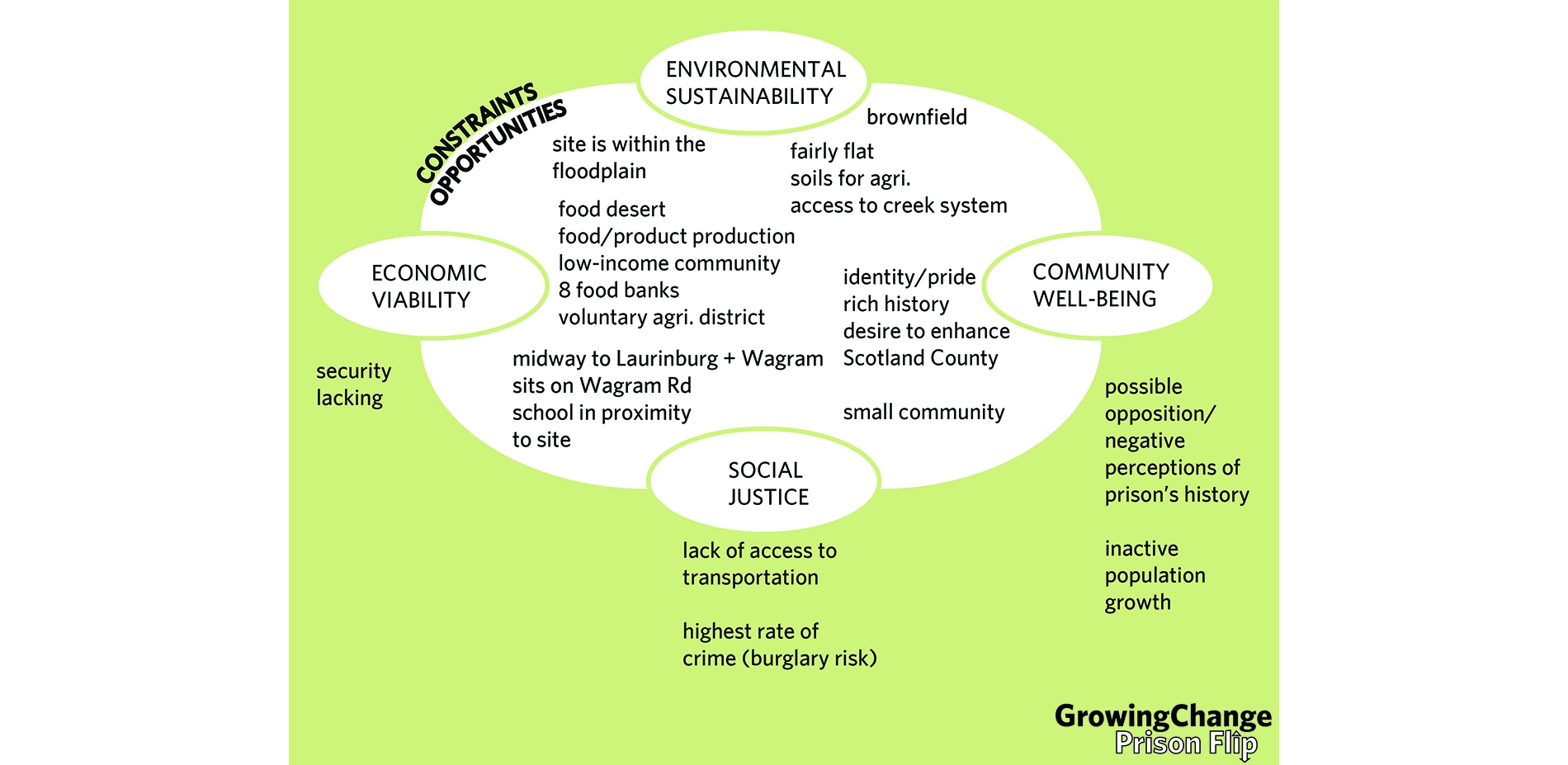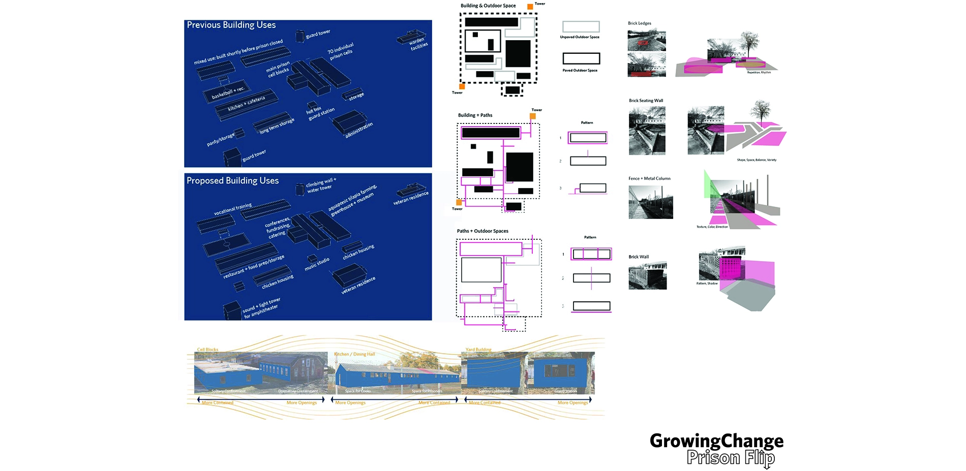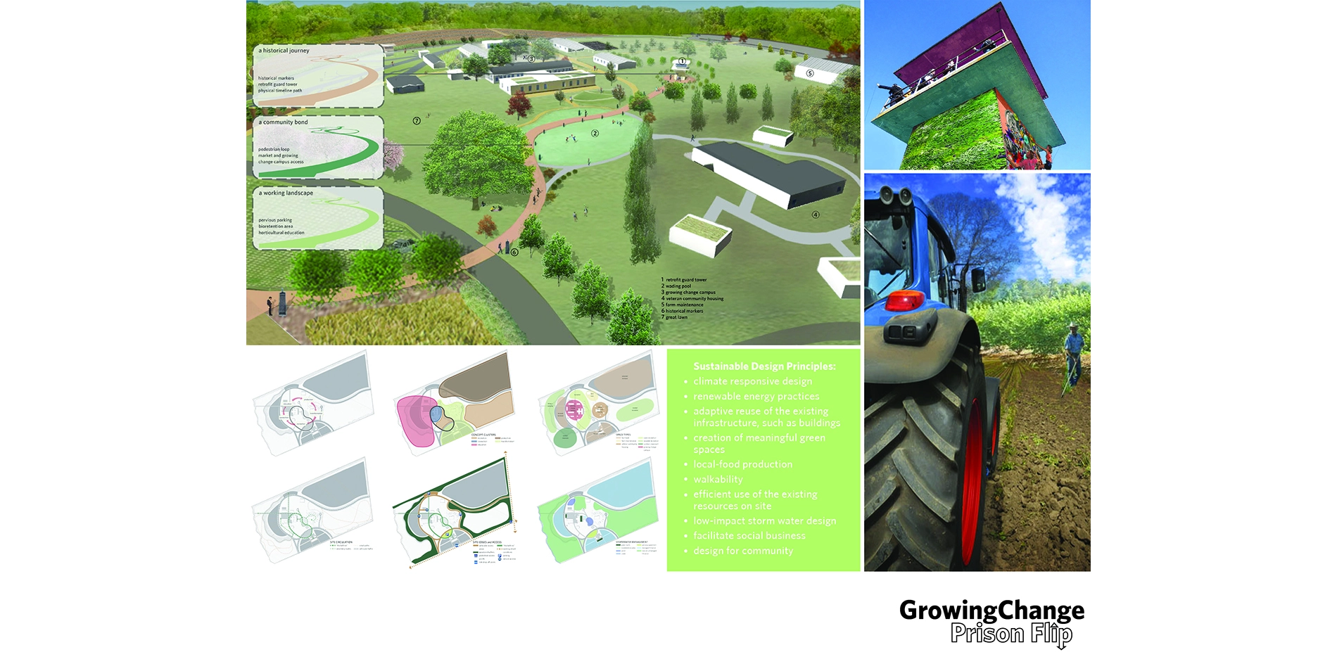 Recent pressing societal challenges present the importance of working in rural areas to create environmentally, socially, and economically sustainable communities. Student design teams in partnership with the youth empowered non-profit organization, GrowingChange addressed unique challenges existing in Scotland County, North Carolina, such as an increasing number of underutilized brownfield properties; an escalating number of youth falling into the justice system; a lack of job opportunities for returning veterans; inadequate opportunities for workforce training; limited access to sustainably grown local food; and a rising number of health concerns. The student design teams created master plans that aimed to flip and enhance the prison's landscape. Building upon the participatory engagement model, students developed and facilitated community design workshops in partnership with the GrowingChange, institutional organizations, faith communities, and local residents. Proposed design scenarios have already empowered GrowingChange to raise funds and promote a model to be implemented internationally for decommissioned, brownfield prison sites into new community building functions.