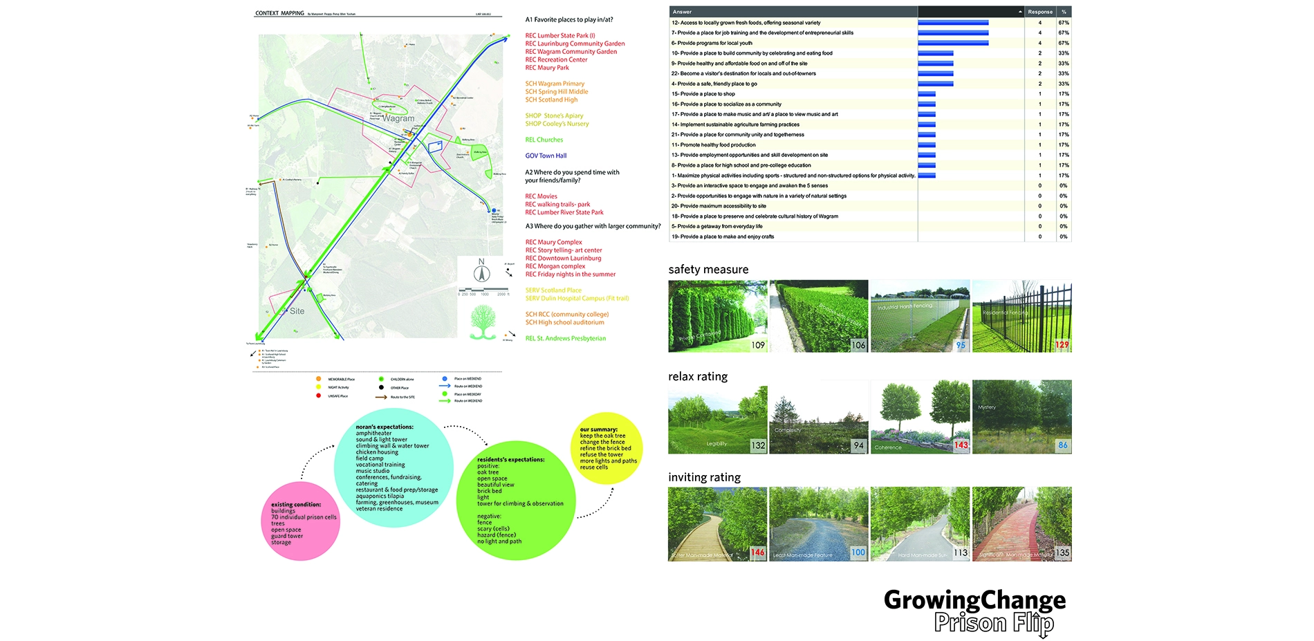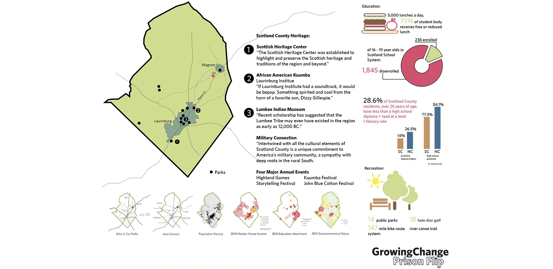 Establishing successful, healthy, and sustainable community-based initiatives in rural communities of North Carolina, such as Scotland County, requires cohesive and long-term partnerships between key stakeholders including academic institutions, community non-profit groups, decision makers, businesses, faith community and residents. This effort attracted key partnerships among the College of Design, the youth empowered non-profit organization GrowingChange, NCSU’s Cooperative Extension, the UNC at Pembroke, Department of Public Safety, veterans, faith communities, and local residents. GrowingChange, approached the landscape architecture department with a request of creating a vision that would help to create a master plan that addresses the challenging issues in the communities of Scotland County, North Carolina. The county currently has a decommissioned brownfield prison site (61 acres), high number of youth in the justice system, lack of health and access to organic food, and joblessness and inactive population growth.