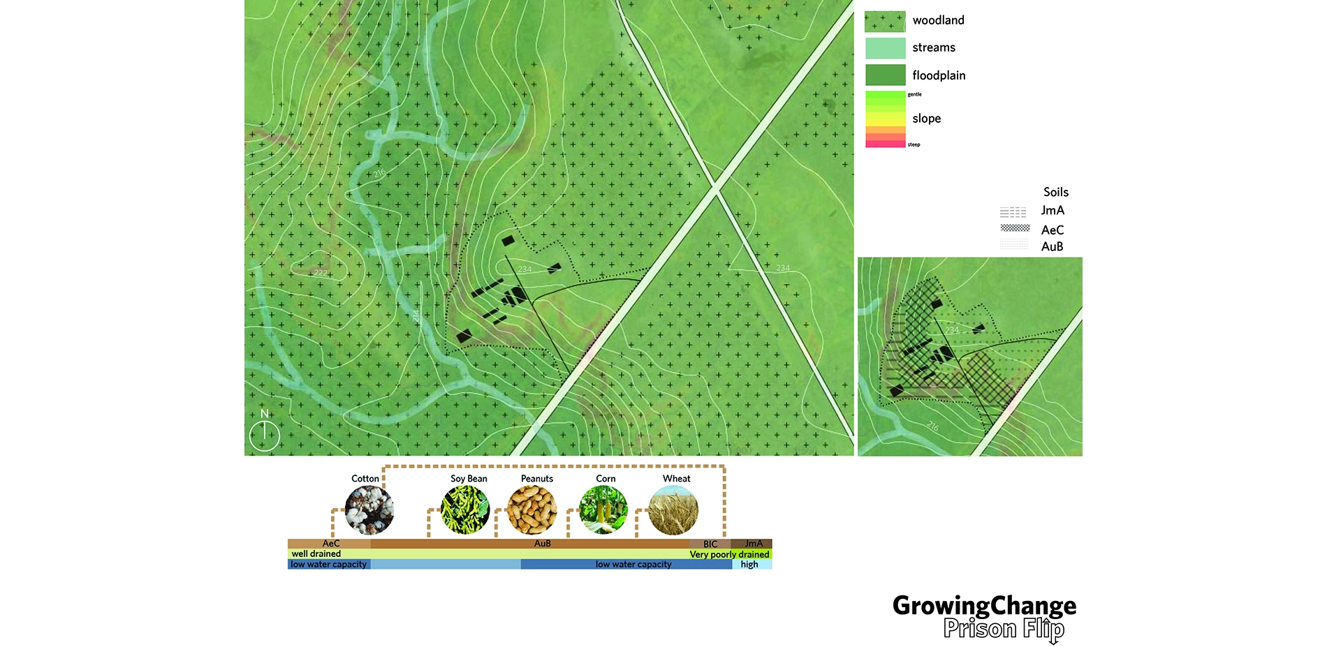After receiving a better understanding of the county, we then moved onto site specific inventory and analysis, utilizing on-site observations and GIS data for retrieving environmental information. During this phase, we documented the existing conditions of the old prison site including buildings (their character, materials, and experiential qualities) and the environmental characteristics such as soils, topography, ecological systems, hydrology, and opportunities for potential agricultural activities. At the end of the contextual study and site analysis we identified numerous opportunities on the site that will potentially strengthen the community related to economic viability, environmental sustainability, community well-being, and social justice.