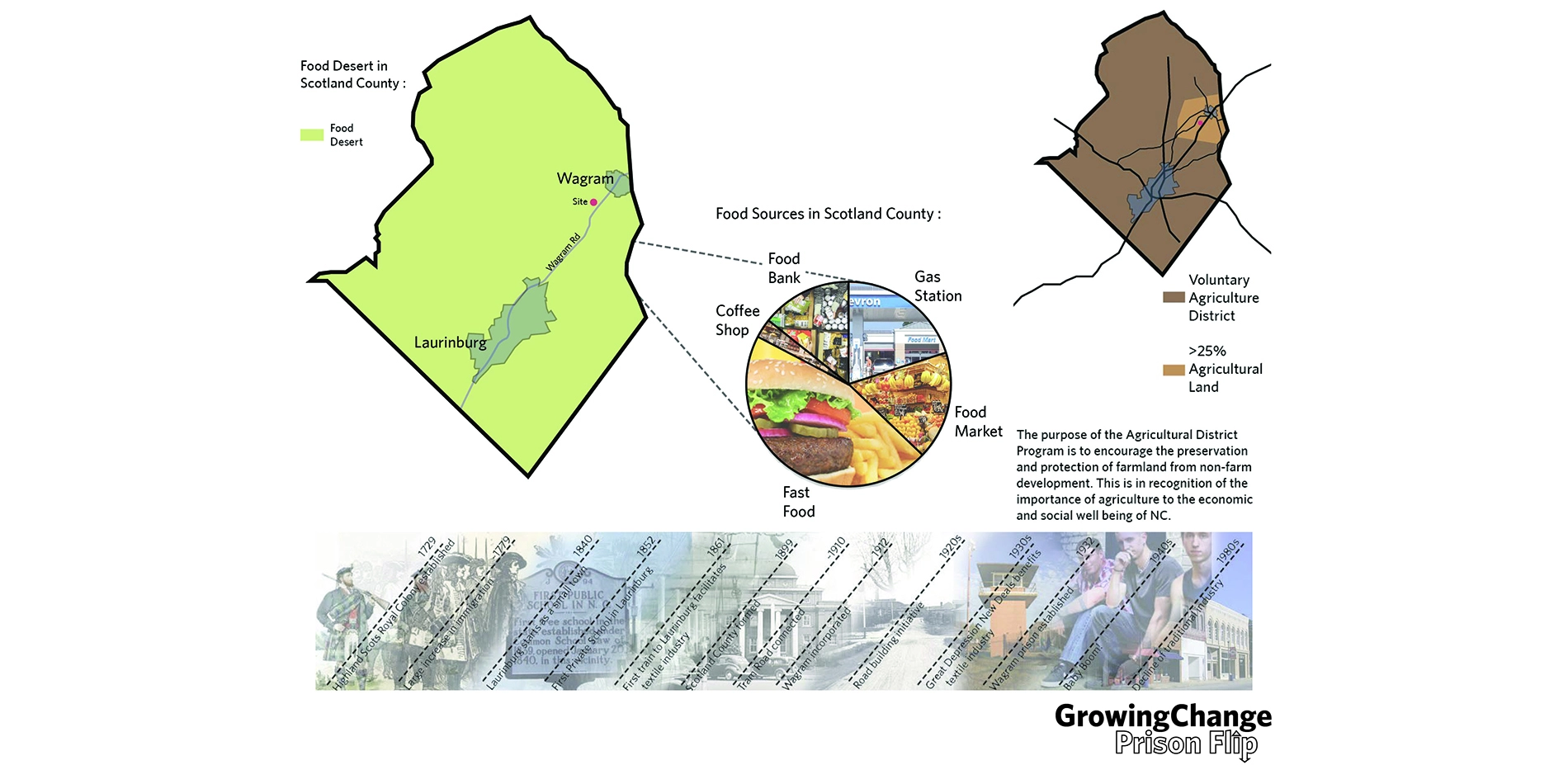 The primary intent of this effort was to reclaim an abandoned prison site located in the Town of Wagram, Scotland County and develop design alternatives that will help create a place for GrowingChange to achieve its mission to help young people at risk of falling into the justice system; to create job opportunities for veterans; to attain education, vocational training and service learning for the local community; and to sustain positive health outcomes, environmental awareness, and community engagement for the Town of Wagram and Scotland County.