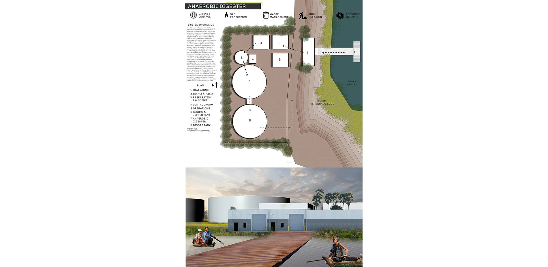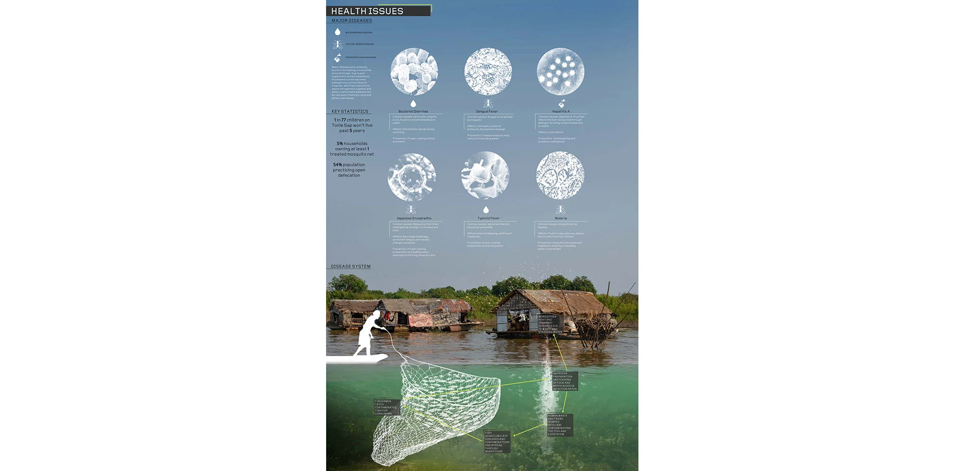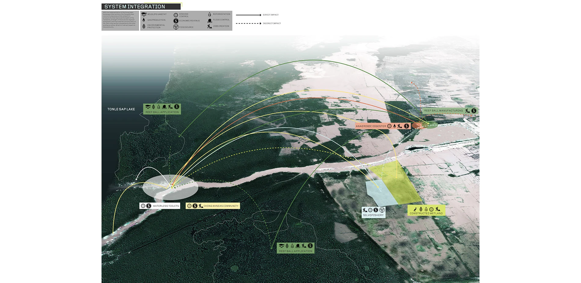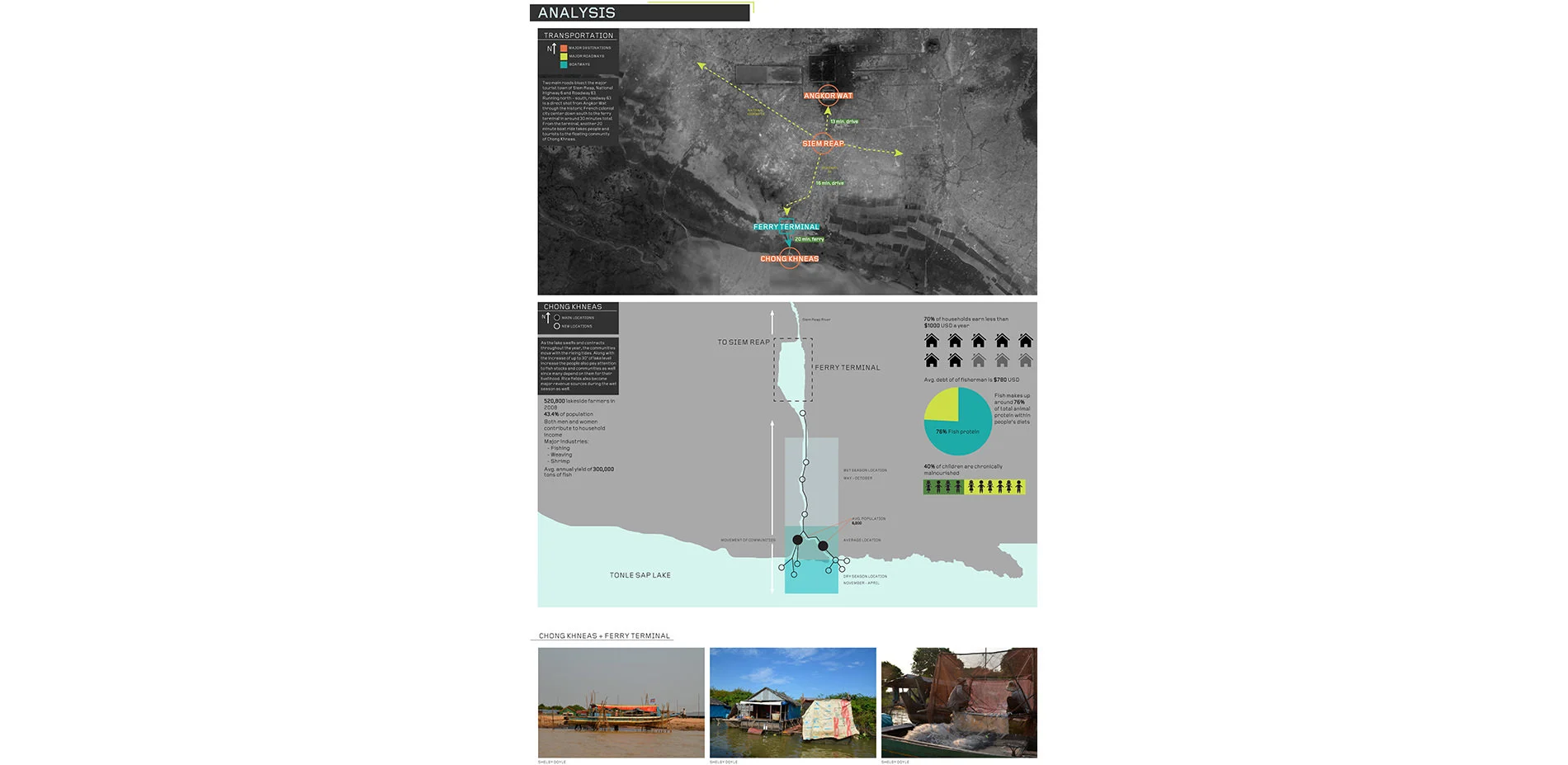 As the largest freshwater lake in Southeast Asia, Tonle Sap, located in the heart of Cambodia, is a highly productive and volatile system. Currently, 1.2 to 1.5 million people move with the lake’s temporal change each year, but live in poor and unhealthy conditions. The goal of the project is aimed at how to interpret the native landscape and nature of the lake while improving the overall quality of life for the communities that call it home. Three main strategies are designed to improve the ecosystem, health, and economy: waterless toilets and an anaerobic digester, fabricated mangrove reef balls, and a constructed wetland and silvofishery. Each implemented system would create a new network that would positively impact the surrounding human and environmental communities. With the success of one primary site, each technology could be adapted and phased into the other major community sites around the Lake’s perimeter and potentially improve the quality of life for over 10% of Cambodia’s population.